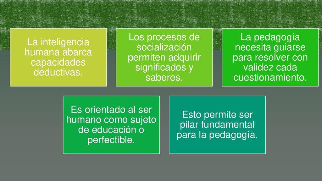 permiten adquirir significados y saberes. La pedagogía necesita guiarse para resolver con validez cada cuestionamiento. Es orientado al ser humano como sujeto de educación o perfectible. Esto permite ser pilar fundamental para la pedagogía.