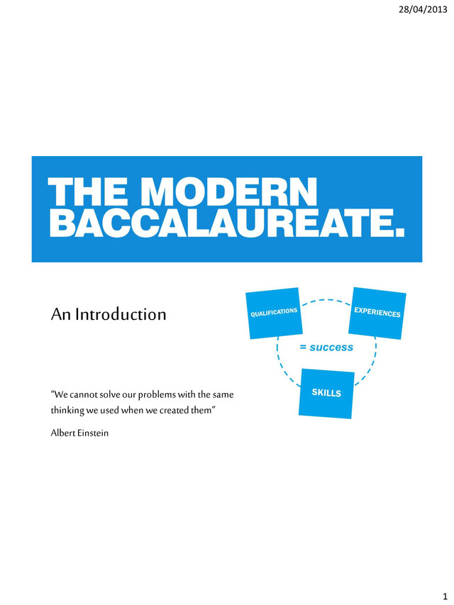 array of future challenges in work and life unprecedented in recent history. The CBI recognises this, asserting that school leavers entering a tough labour market must have the underlying skills needed for success in anyjob. Young people will need : •To be highly literate and numerate •To have the best qualifications possible. •To have resilience, character, confidence, flexibility, •To be capable of: self-management, team-working and problem solving. Modern Baccalaureate recognises the demands of the 21st century workplace , and empowers schools and learners to address not just the accumulation of qualifications, but also the development of skills and experiences that build a successful 21st century citizen.