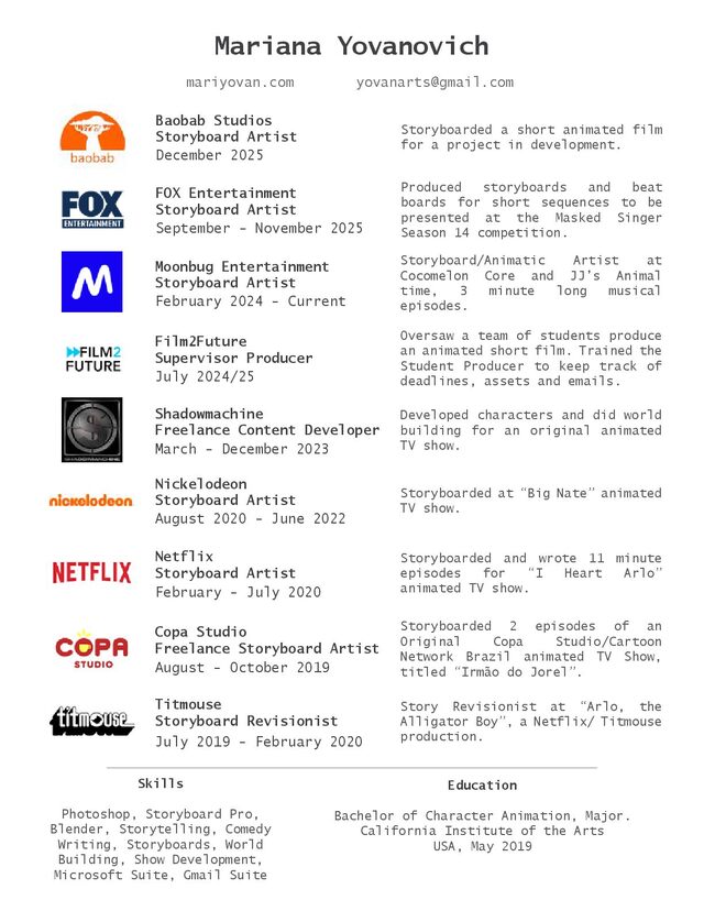June 2022 Storyboarded at “Big Nate” animated TV show. Netflix Storyboard Artist February - July 2020 Storyboarded and wrote 11 minute episodes for “I Heart Arlo” animated TV show. Copa Studio Freelance Storyboard Artist August - October 2019 Storyboarded 2 episodes of an Original Copa Studio/Cartoon Network Brazil animated TV Show, titled “Irmão do Jorel”. Titmouse Storyboard Revisionist July 2019 - February 2020 Story Revisionist at “Arlo, the Alligator Boy”, a Netflix/ Titmouse production. Shadowmachine Freelance Content Developer March - December 2023 Developed characters and did world building for an original animated TV show. Skills Photoshop, Storyboard Pro, Blender, Storytelling, Comedy Writing, Storyboards, World Building, Show Development, Microsoft Suite, Gmail Suite Education Bachelor of Character Animation, Major. California Institute of the Arts USA, May 2019 Moonbug Entertainment Storyboard Artist February 2024 - Current Storyboard/Animatic Artist at Cocomelon Core and JJ’s Animal time, 3 minute long musical episodes. Film2Future Supervisor Producer July 2024/25 Oversaw a team of students produce an animated short film. Trained the Student Producer to keep track of deadlines, assets and emails. FOX Entertainment Storyboard Artist September - November 2025 Produced storyboards and beat boards for short sequences to be presented at the Masked Singer Season 14 competition. Baobab Studios Storyboard Artist December 2025 Storyboarded a short animated film for a project in development.