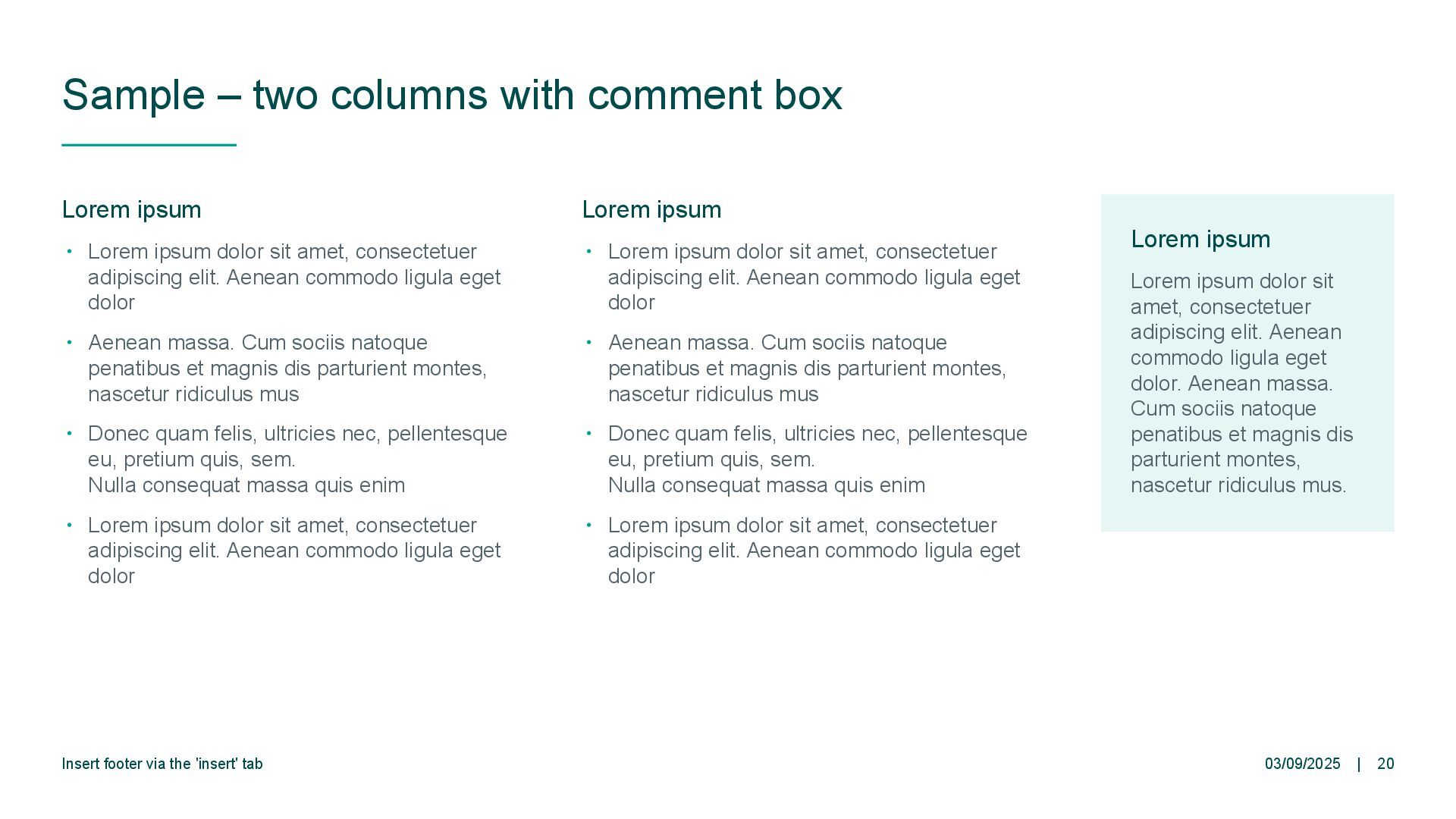 Lorem ipsum dolor sit amet, consectetuer adipiscing elit. Aenean commodo ligula eget dolor ∙ Aenean massa. Cum sociis natoque penatibus et magnis dis parturient montes, nascetur ridiculus mus ∙ Donec quam felis, ultricies nec, pellentesque eu, pretium quis, sem. Nulla consequat massa quis enim ∙ Lorem ipsum dolor sit amet, consectetuer adipiscing elit. Aenean commodo ligula eget dolor Lorem ipsum Lorem ipsum dolor sit amet, consectetuer adipiscing elit. Aenean commodo ligula eget dolor. Aenean massa. Cum sociis natoque penatibus et magnis dis parturient montes, nascetur ridiculus mus. Lorem ipsum ∙ Lorem ipsum dolor sit amet, consectetuer adipiscing elit. Aenean commodo ligula eget dolor ∙ Aenean massa. Cum sociis natoque penatibus et magnis dis parturient montes, nascetur ridiculus mus ∙ Donec quam felis, ultricies nec, pellentesque eu, pretium quis, sem. Nulla consequat massa quis enim ∙ Lorem ipsum dolor sit amet, consectetuer adipiscing elit. Aenean commodo ligula eget dolor 03/09/2025 Insert footer via the 'insert' tab | 20