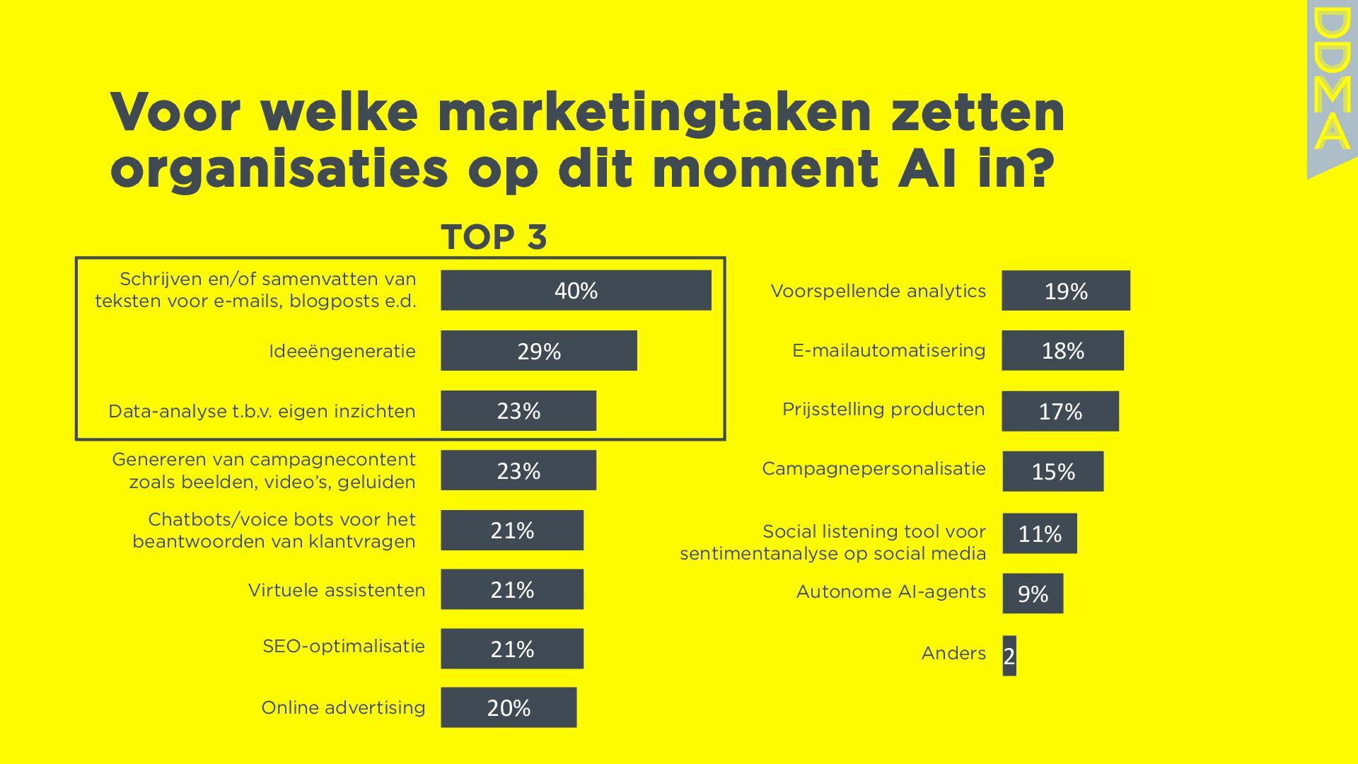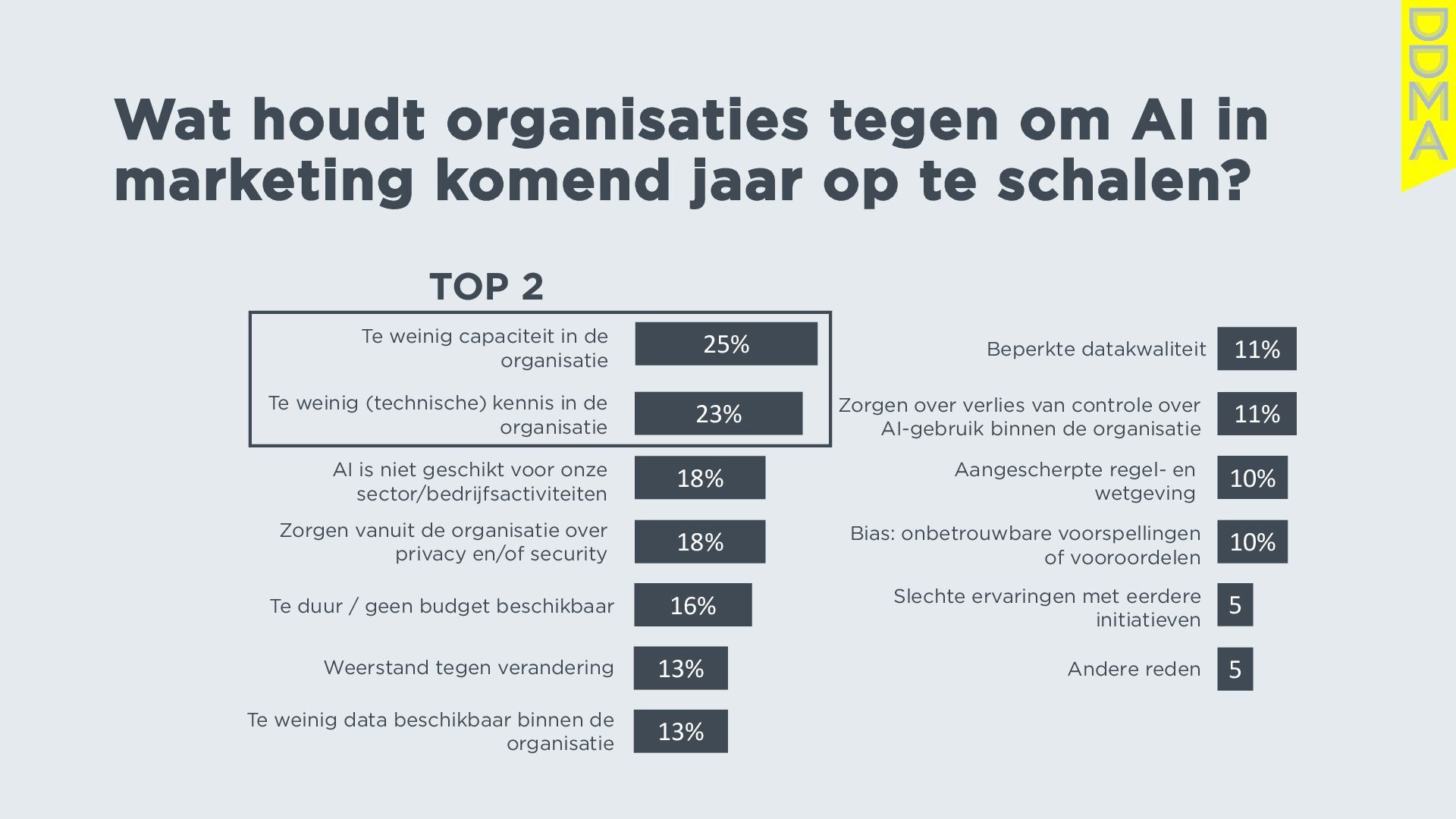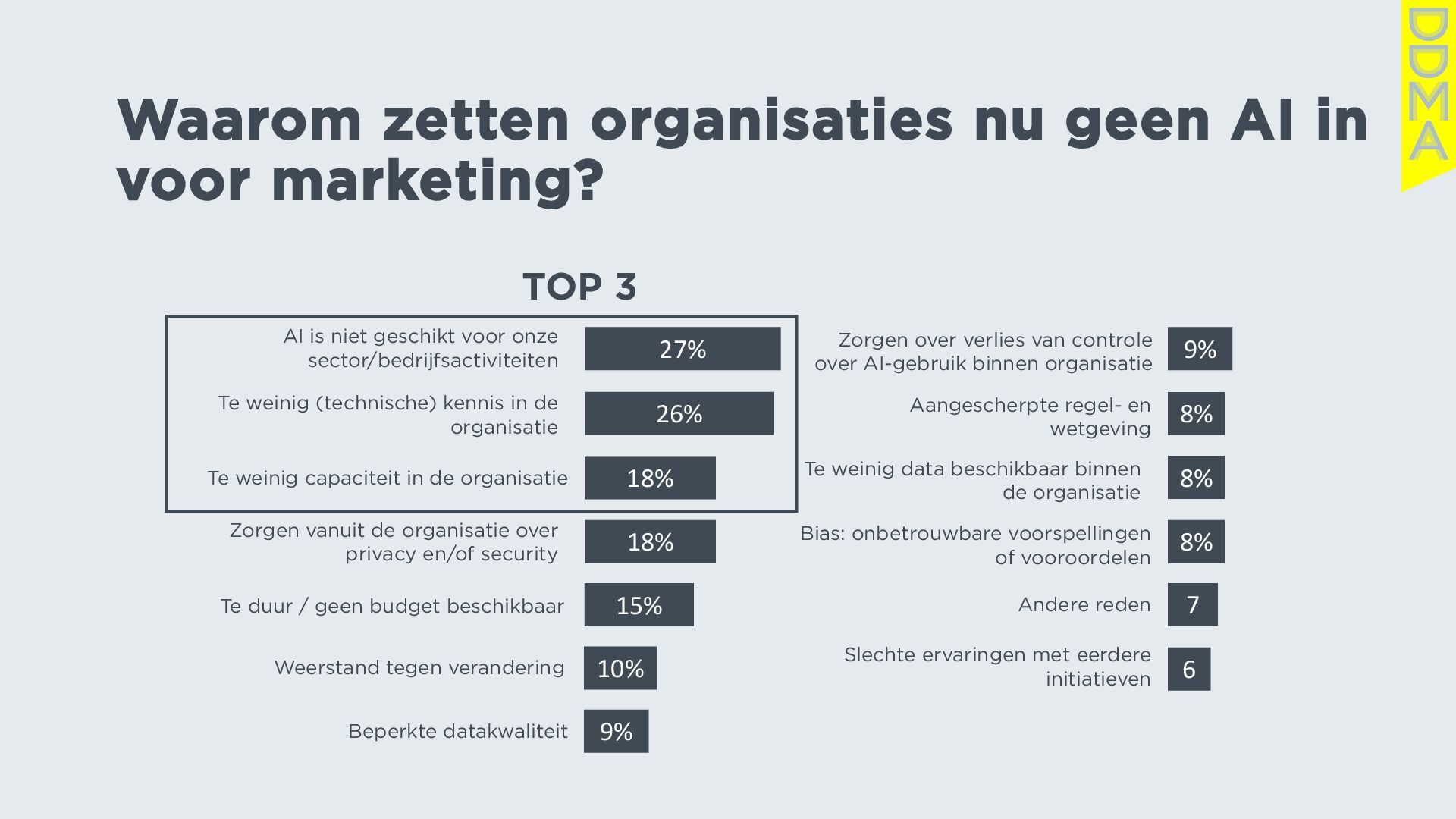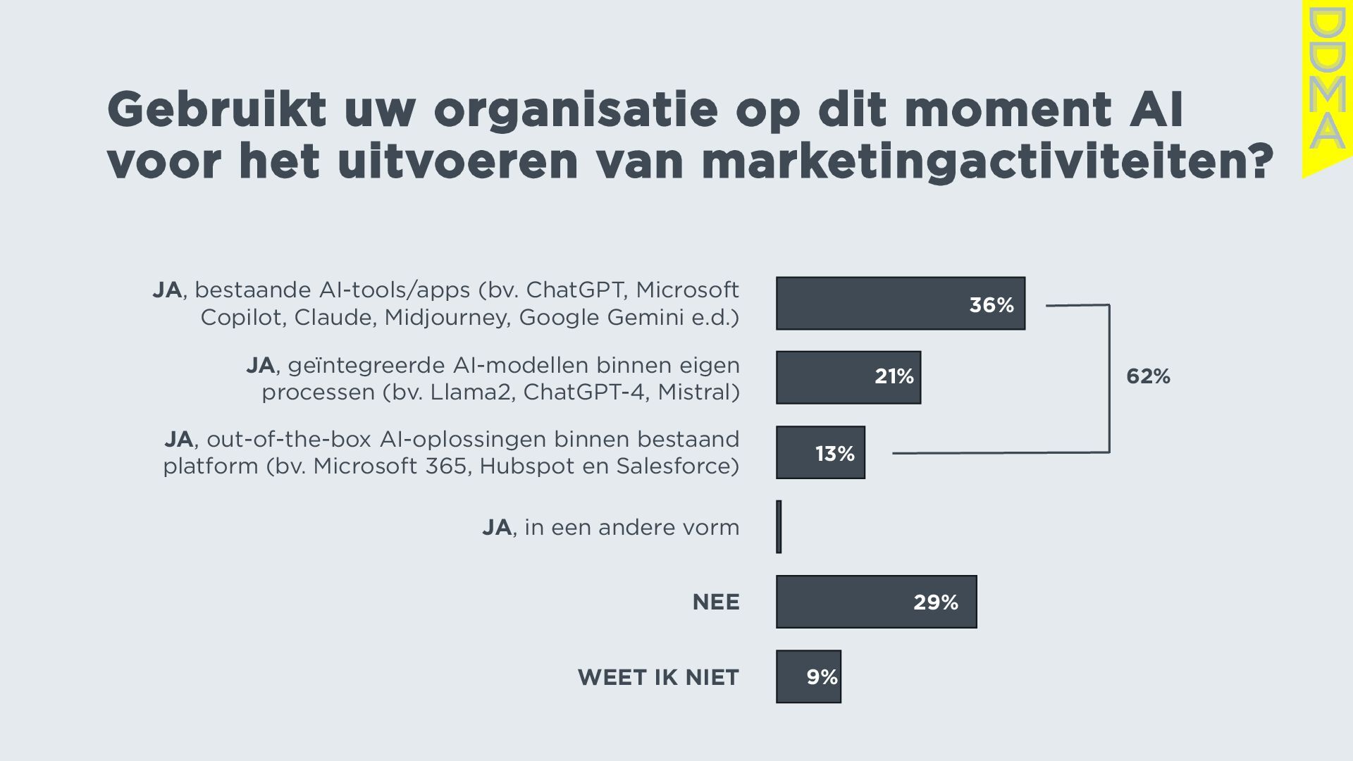 van marketingactiviteiten? 36% 21% 13% 29% 9% JA, bestaande AI-tools/apps (bv. ChatGPT, Microsoft Copilot, Claude, Midjourney, Google Gemini e.d.) JA, geïntegreerde AI-modellen binnen eigen processen (bv. Llama2, ChatGPT-4, Mistral) JA, out-of-the-box AI-oplossingen binnen bestaand platform (bv. Microsoft 365, Hubspot en Salesforce) JA, in een andere vorm NEE WEET IK NIET 62%