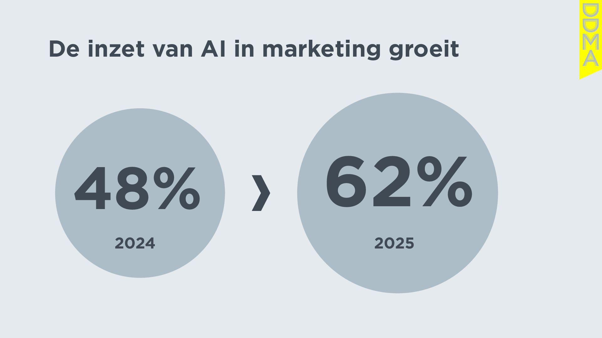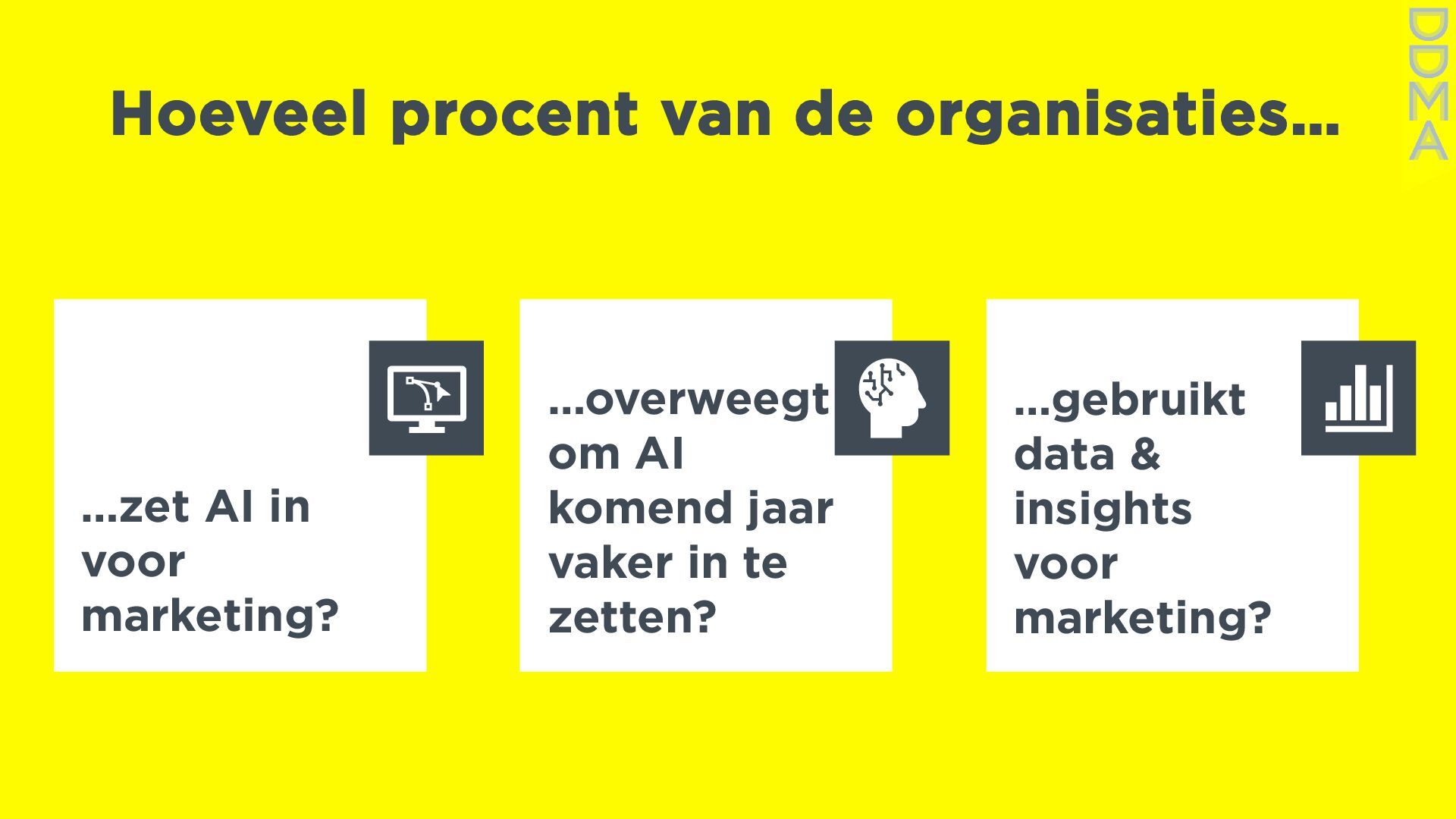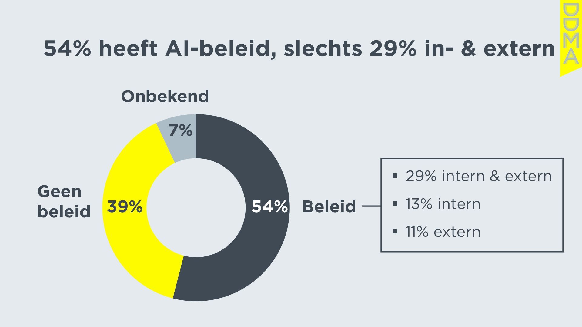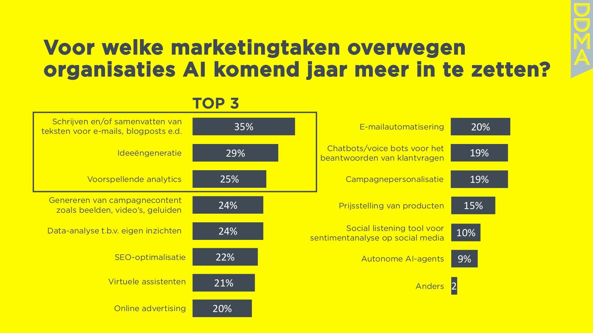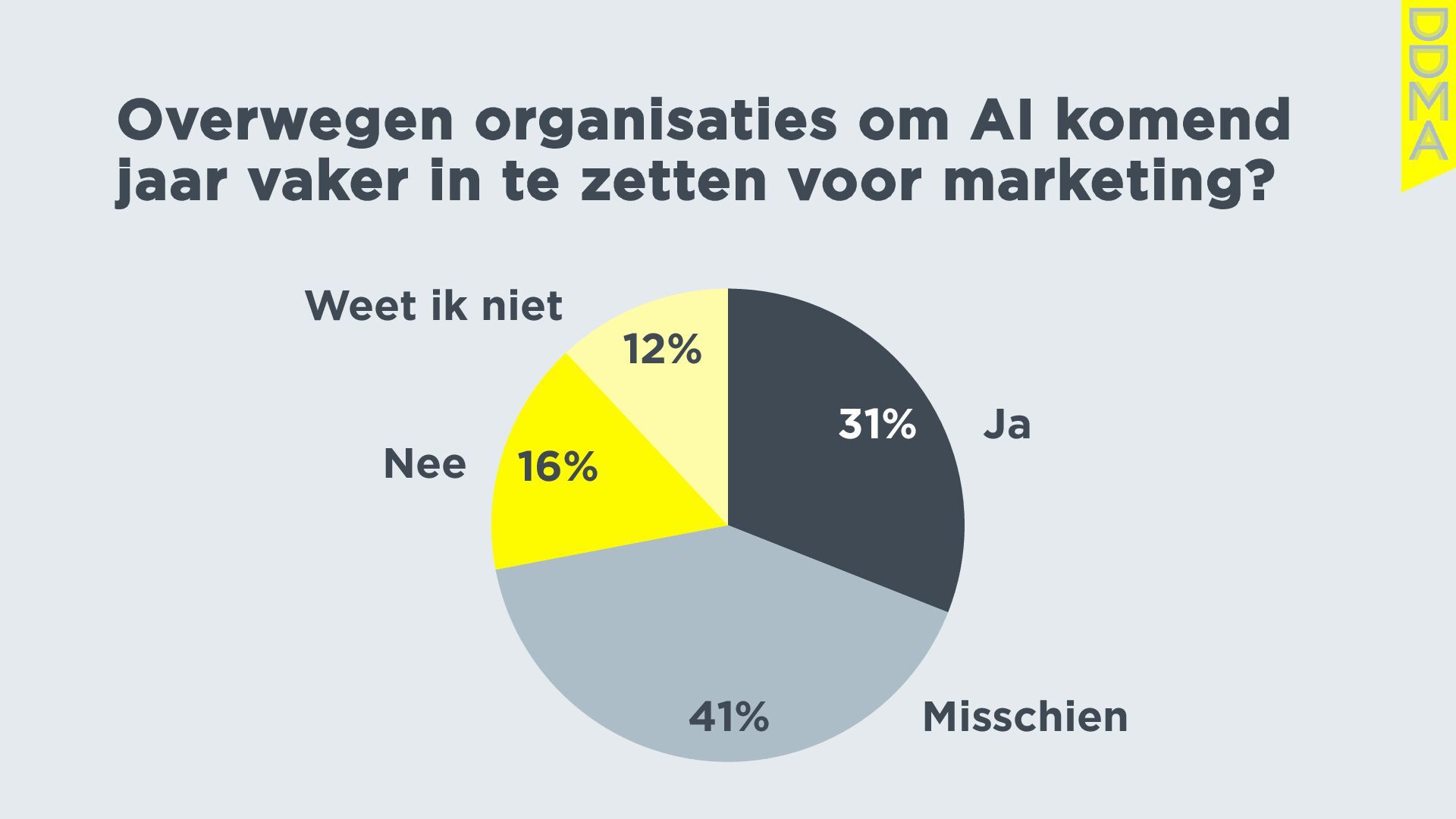 van marketingactiviteiten? 36% 21% 13% 29% 9% JA, bestaande AI-tools/apps (bv. ChatGPT, Microsoft Copilot, Claude, Midjourney, Google Gemini e.d.) JA, geïntegreerde AI-modellen binnen eigen processen (bv. Llama2, ChatGPT-4, Mistral) JA, out-of-the-box AI-oplossingen binnen bestaand platform (bv. Microsoft 365, Hubspot en Salesforce) JA, in een andere vorm NEE WEET IK NIET 62%