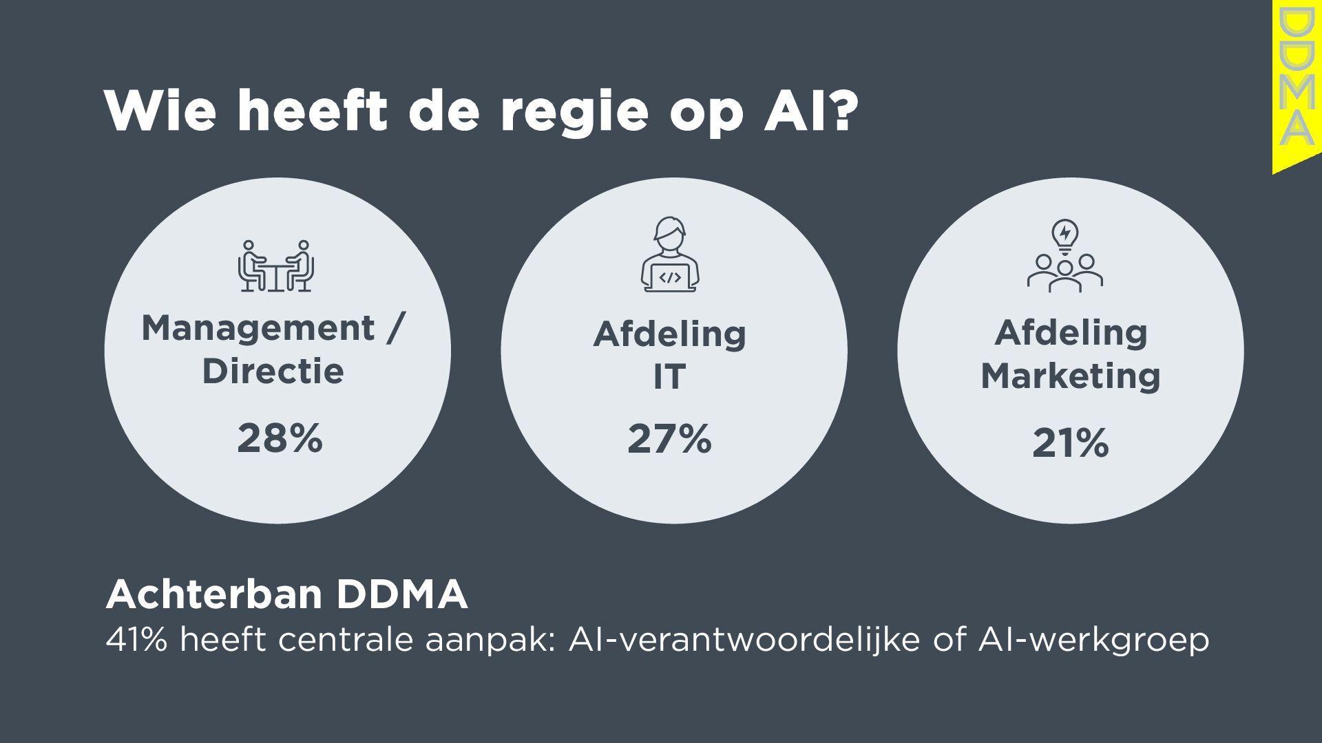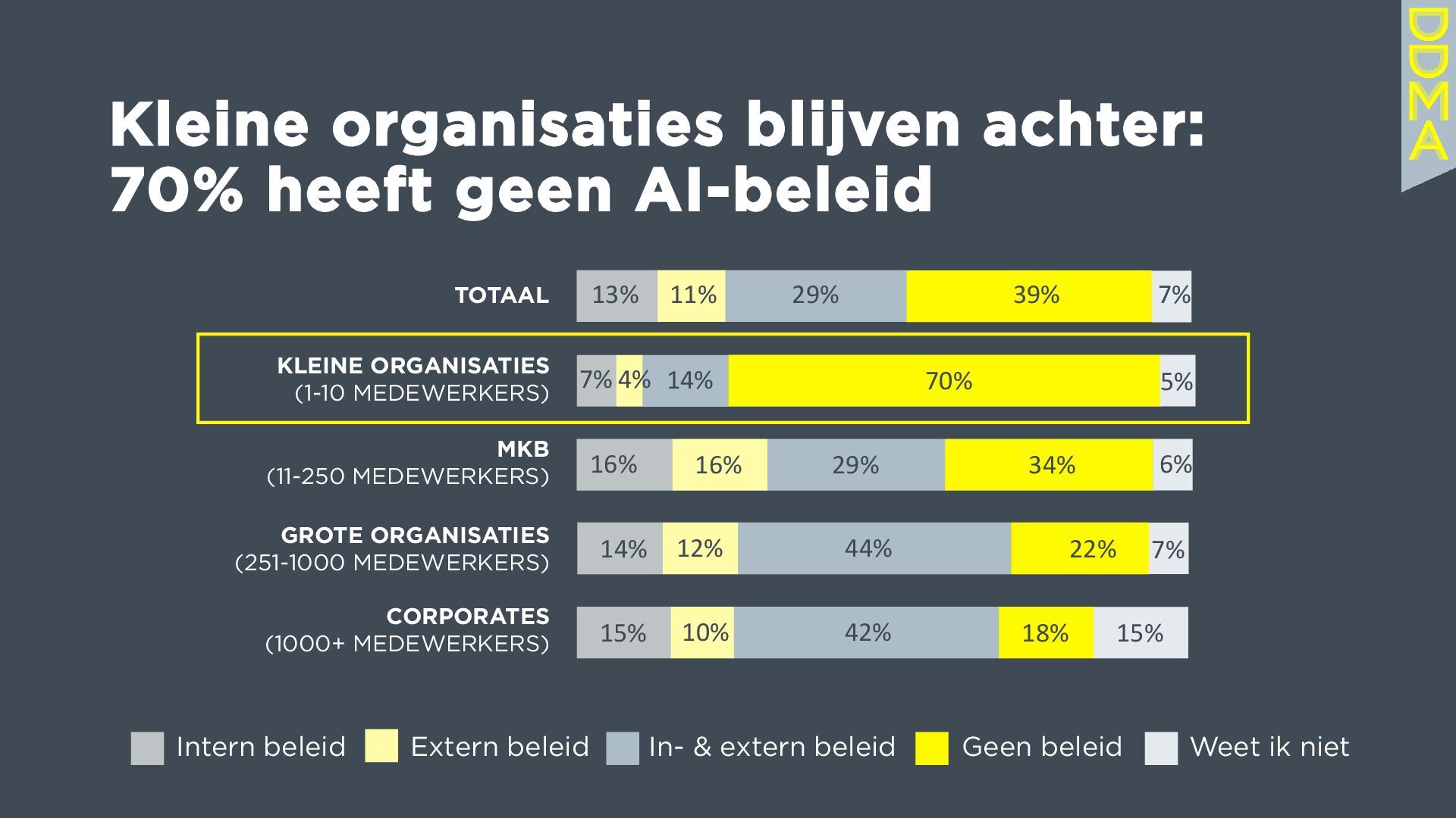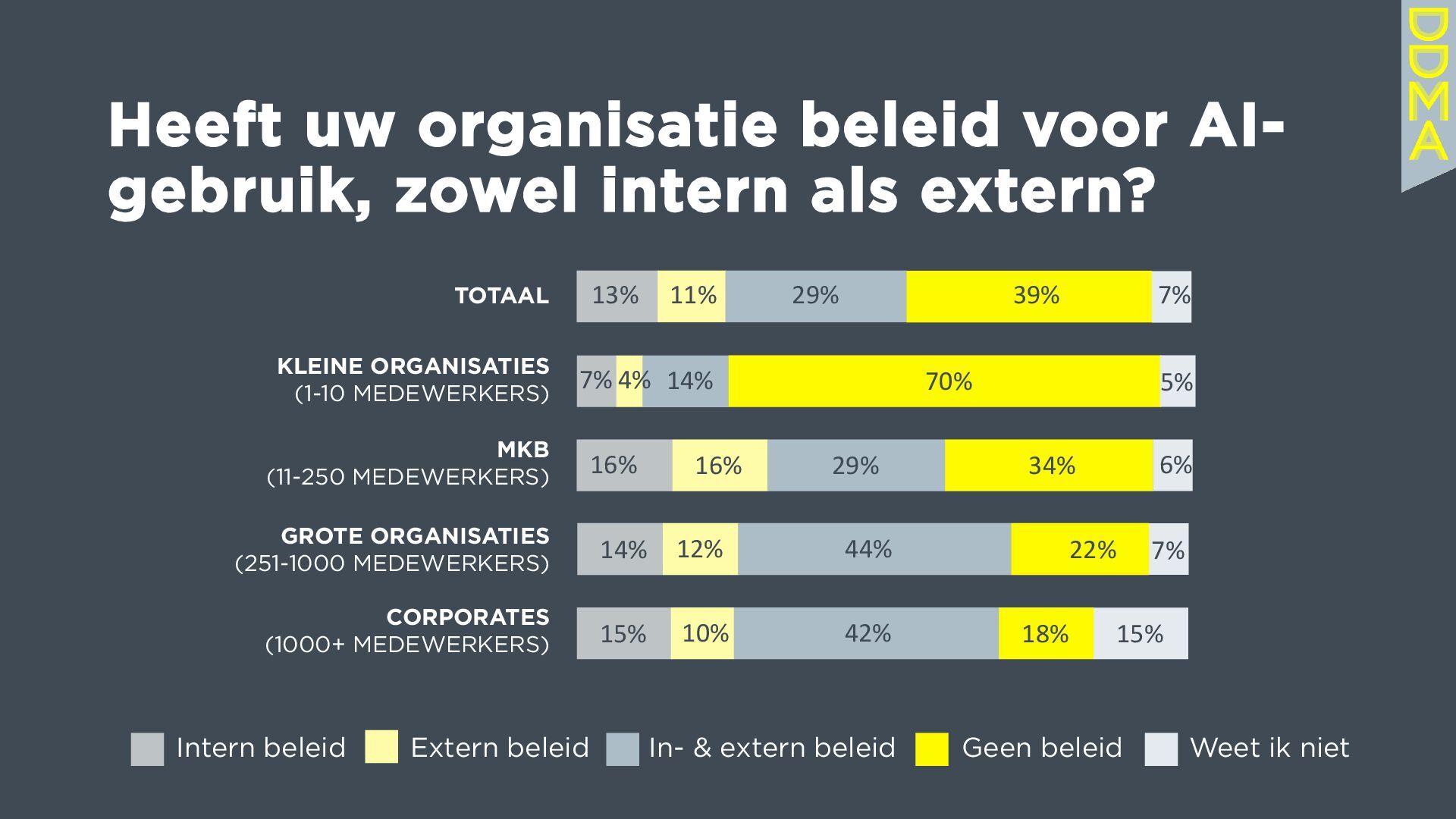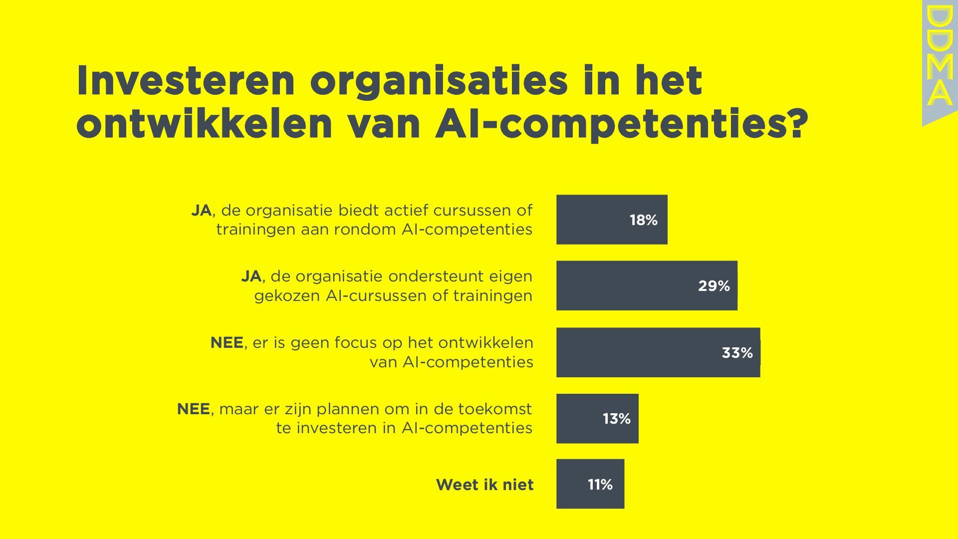 van marketingactiviteiten? 36% 21% 13% 29% 9% JA, bestaande AI-tools/apps (bv. ChatGPT, Microsoft Copilot, Claude, Midjourney, Google Gemini e.d.) JA, geïntegreerde AI-modellen binnen eigen processen (bv. Llama2, ChatGPT-4, Mistral) JA, out-of-the-box AI-oplossingen binnen bestaand platform (bv. Microsoft 365, Hubspot en Salesforce) JA, in een andere vorm NEE WEET IK NIET 62%