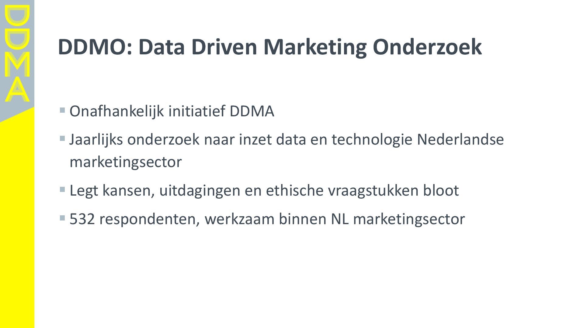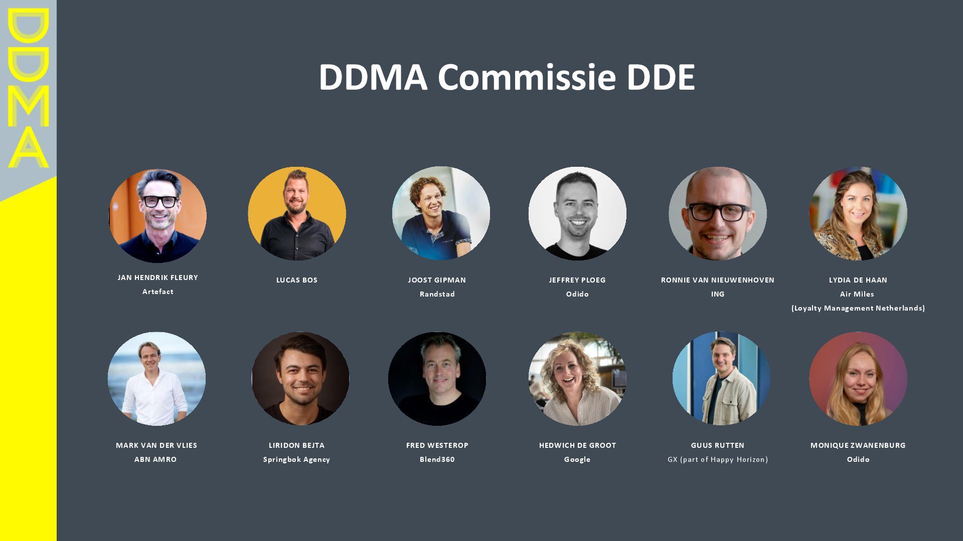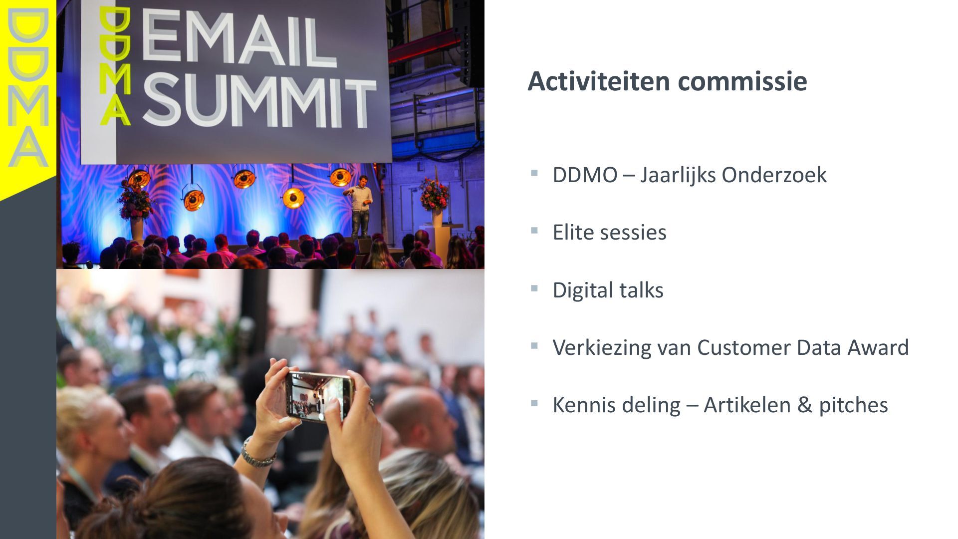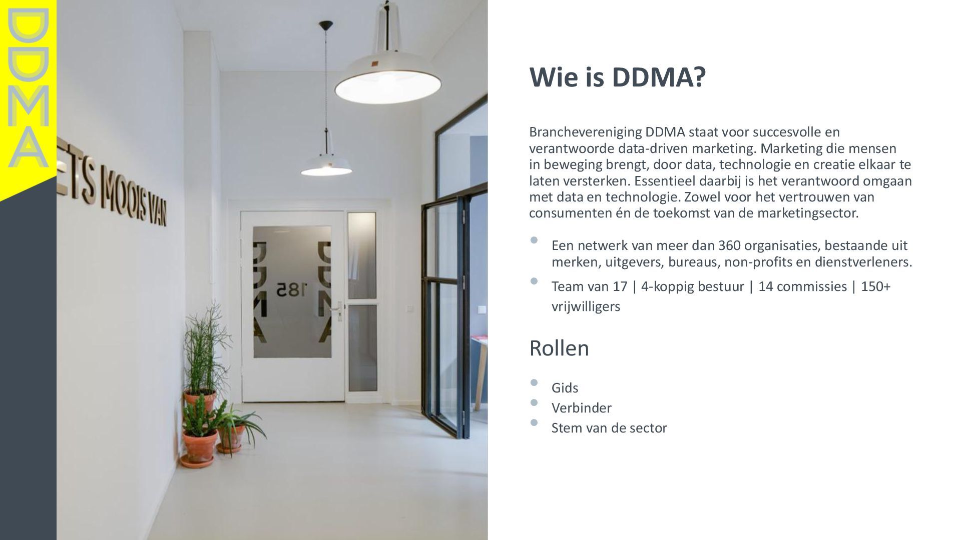 data-driven marketing. Marketing die mensen in beweging brengt, door data, technologie en creatie elkaar te laten versterken. Essentieel daarbij is het verantwoord omgaan met data en technologie. Zowel voor het vertrouwen van consumenten én de toekomst van de marketingsector. • Een netwerk van meer dan 360 organisaties, bestaande uit merken, uitgevers, bureaus, non-profits en dienstverleners. • Team van 17 | 4-koppig bestuur | 14 commissies | 150+ vrijwilligers Rollen • Gids • Verbinder • Stem van de sector