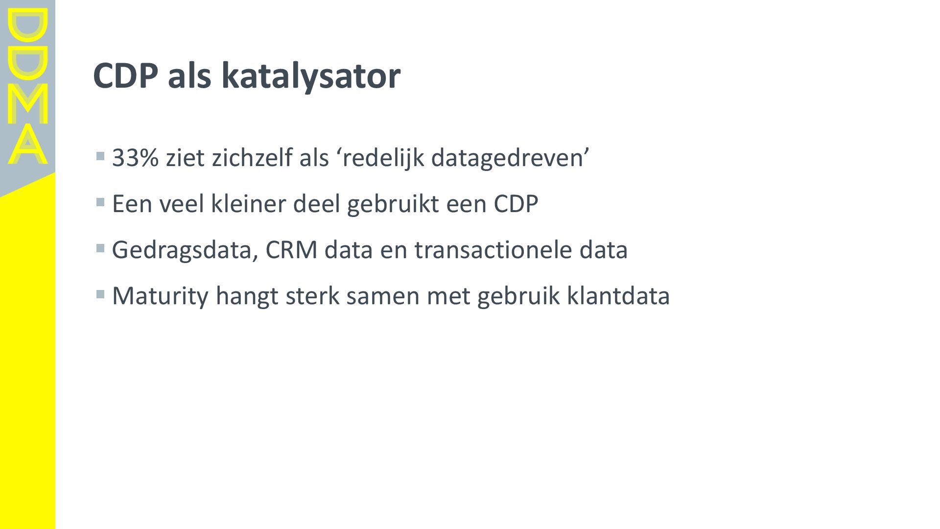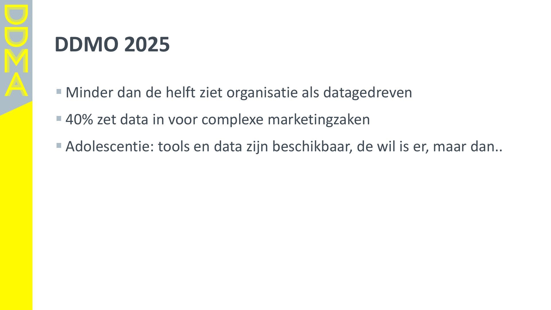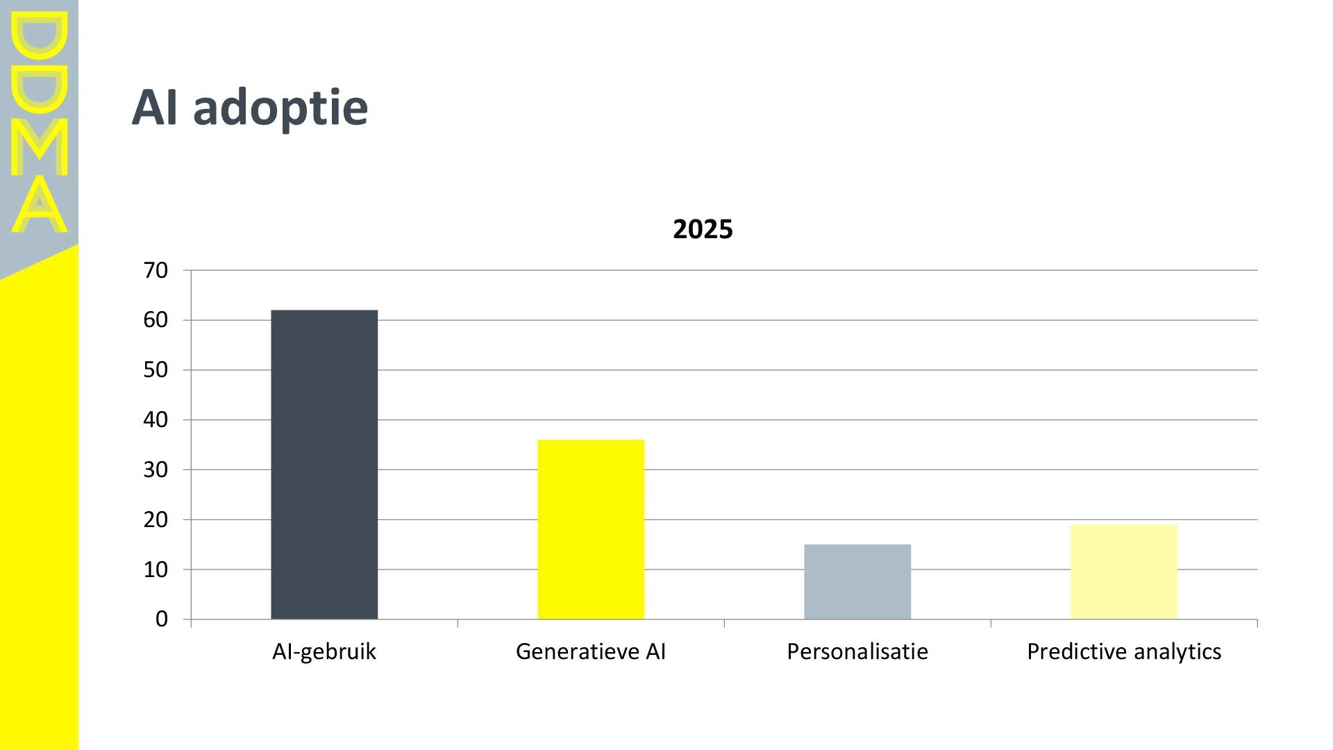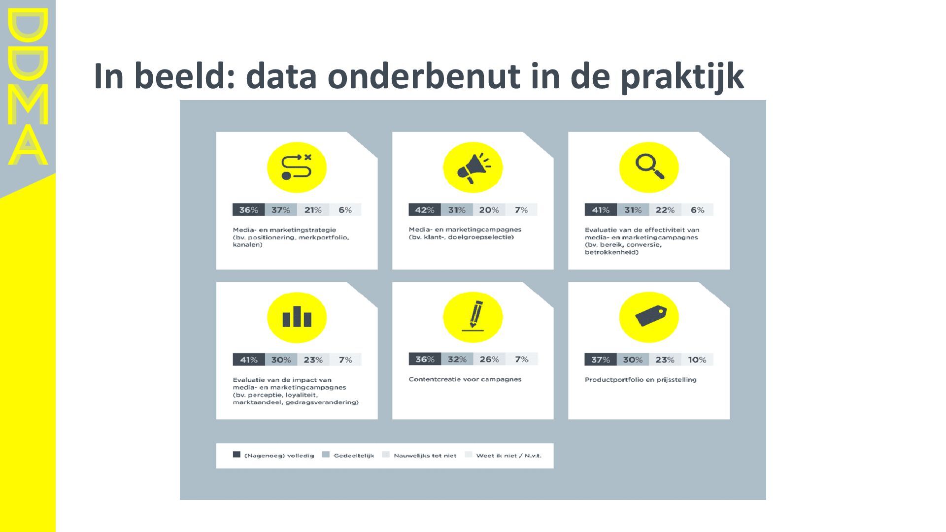 data-driven marketing. Marketing die mensen in beweging brengt, door data, technologie en creatie elkaar te laten versterken. Essentieel daarbij is het verantwoord omgaan met data en technologie. Zowel voor het vertrouwen van consumenten én de toekomst van de marketingsector. • Een netwerk van meer dan 360 organisaties, bestaande uit merken, uitgevers, bureaus, non-profits en dienstverleners. • Team van 17 | 4-koppig bestuur | 14 commissies | 150+ vrijwilligers Rollen • Gids • Verbinder • Stem van de sector