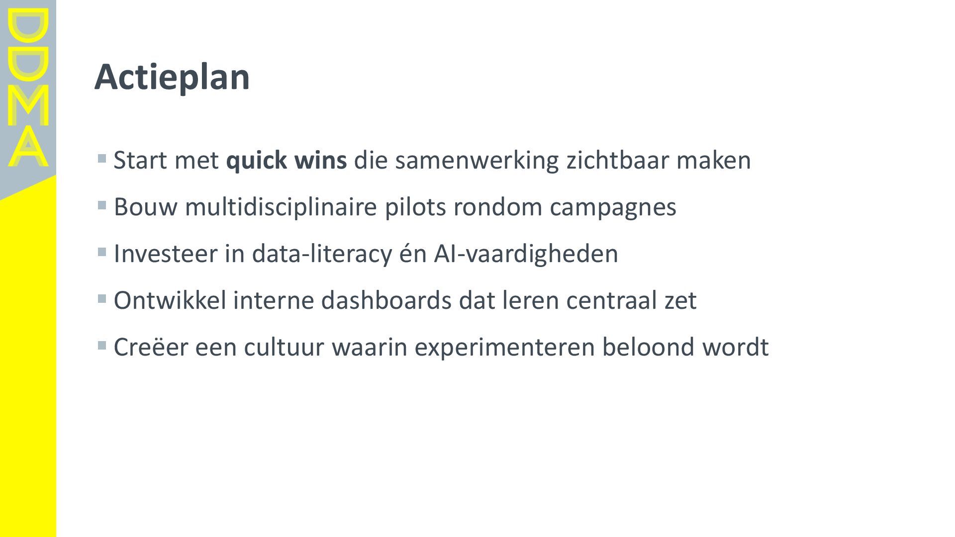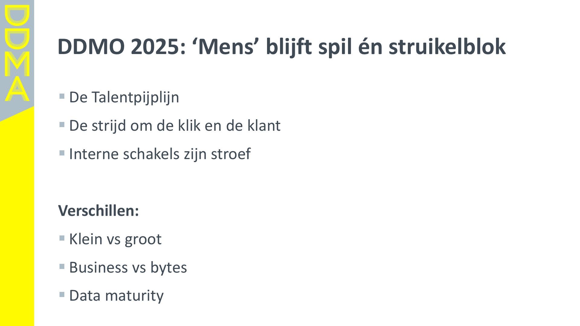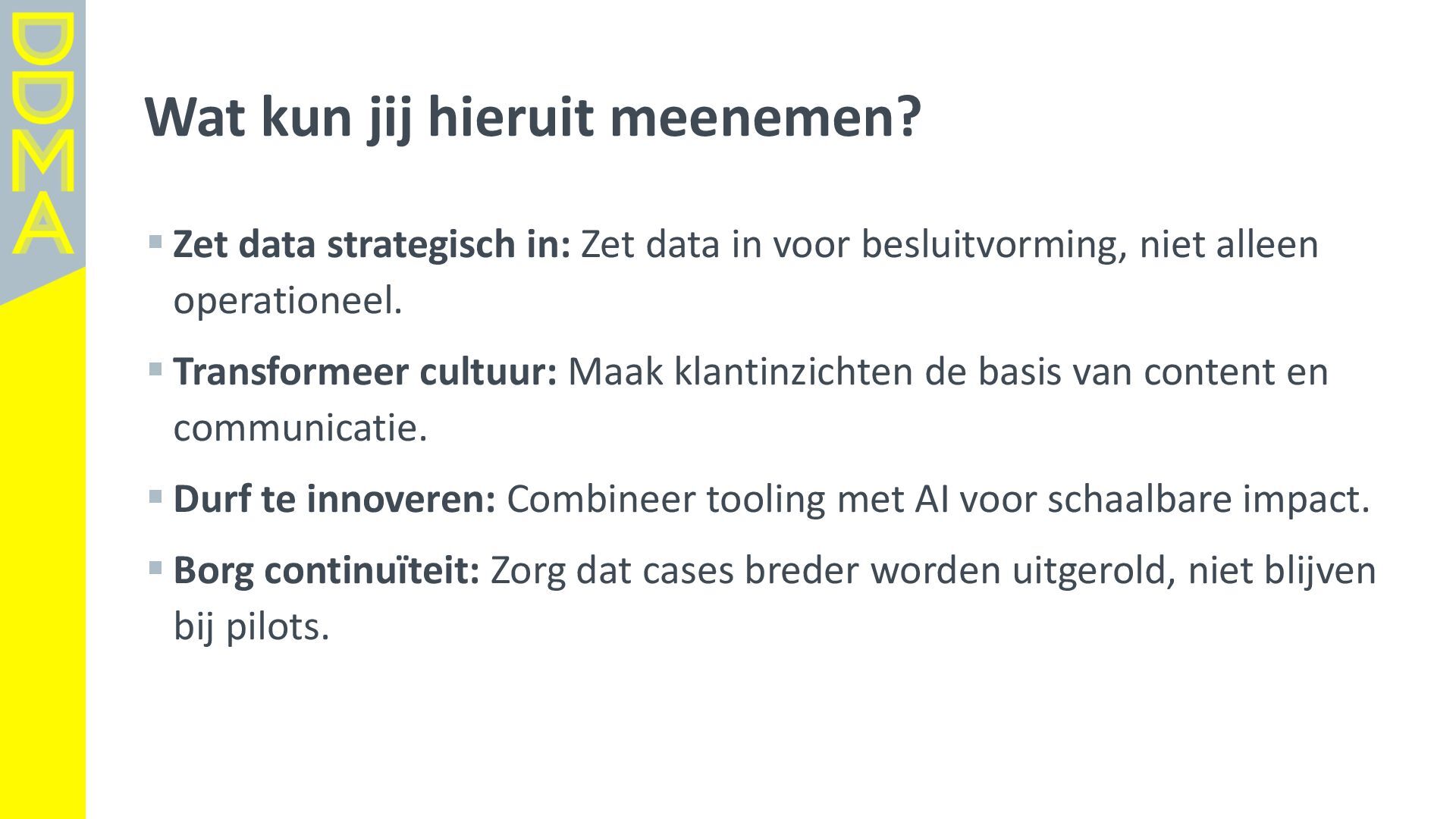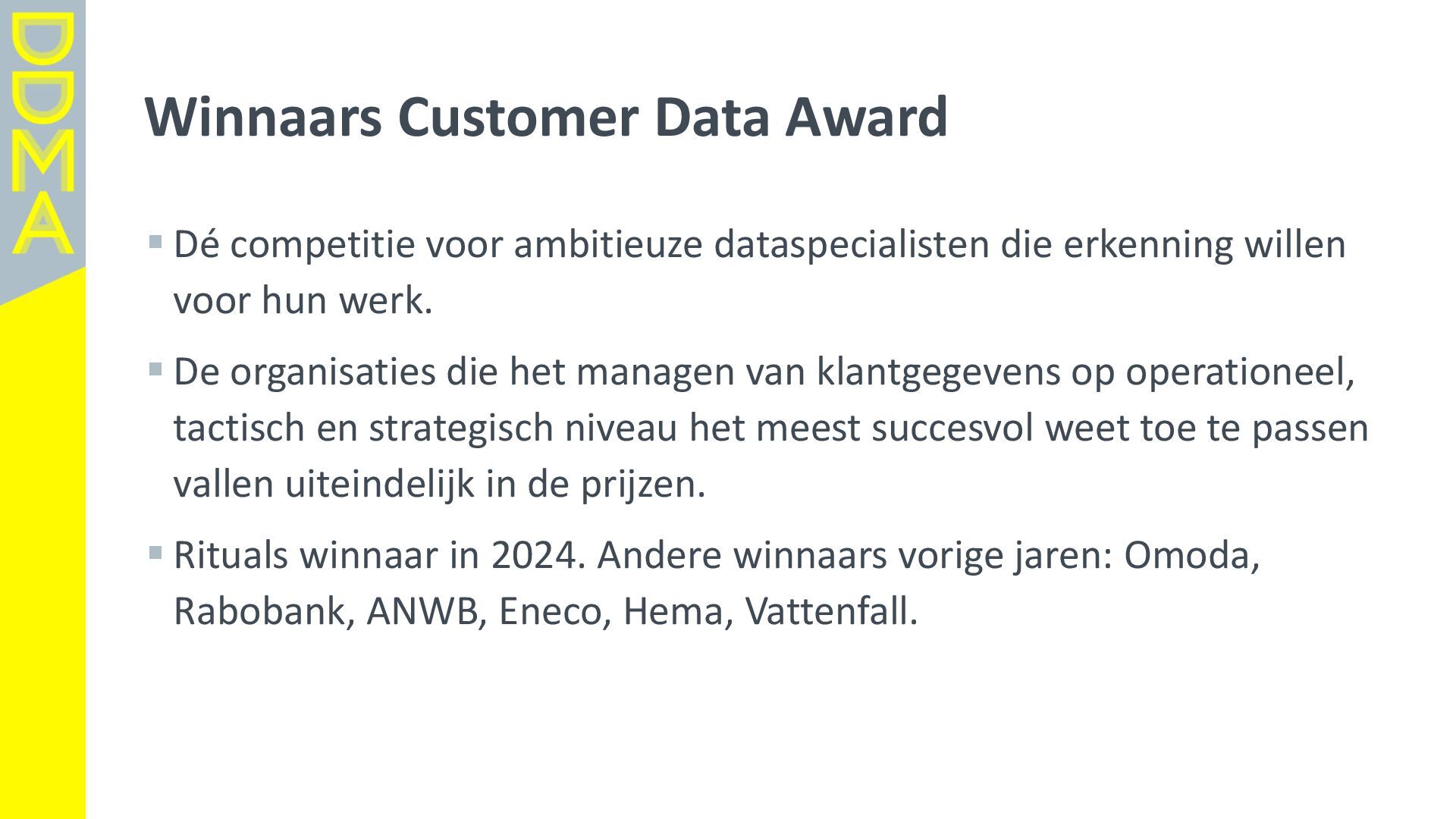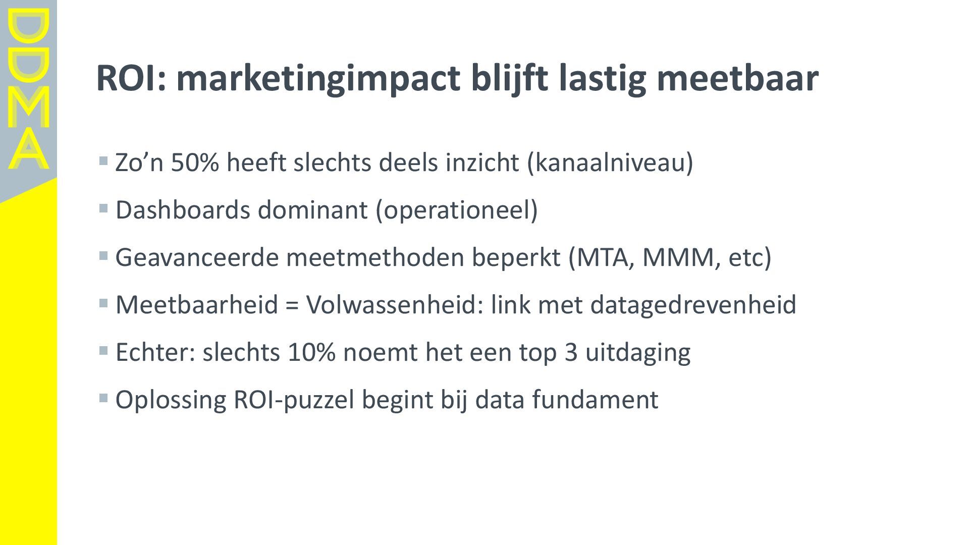 data-driven marketing. Marketing die mensen in beweging brengt, door data, technologie en creatie elkaar te laten versterken. Essentieel daarbij is het verantwoord omgaan met data en technologie. Zowel voor het vertrouwen van consumenten én de toekomst van de marketingsector. • Een netwerk van meer dan 360 organisaties, bestaande uit merken, uitgevers, bureaus, non-profits en dienstverleners. • Team van 17 | 4-koppig bestuur | 14 commissies | 150+ vrijwilligers Rollen • Gids • Verbinder • Stem van de sector