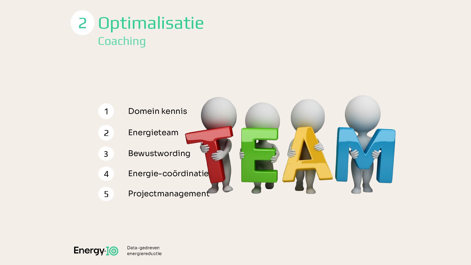 5 Domein kennis 1 2 3 Energieteam Bewustwording 4 Energie-coördinatie