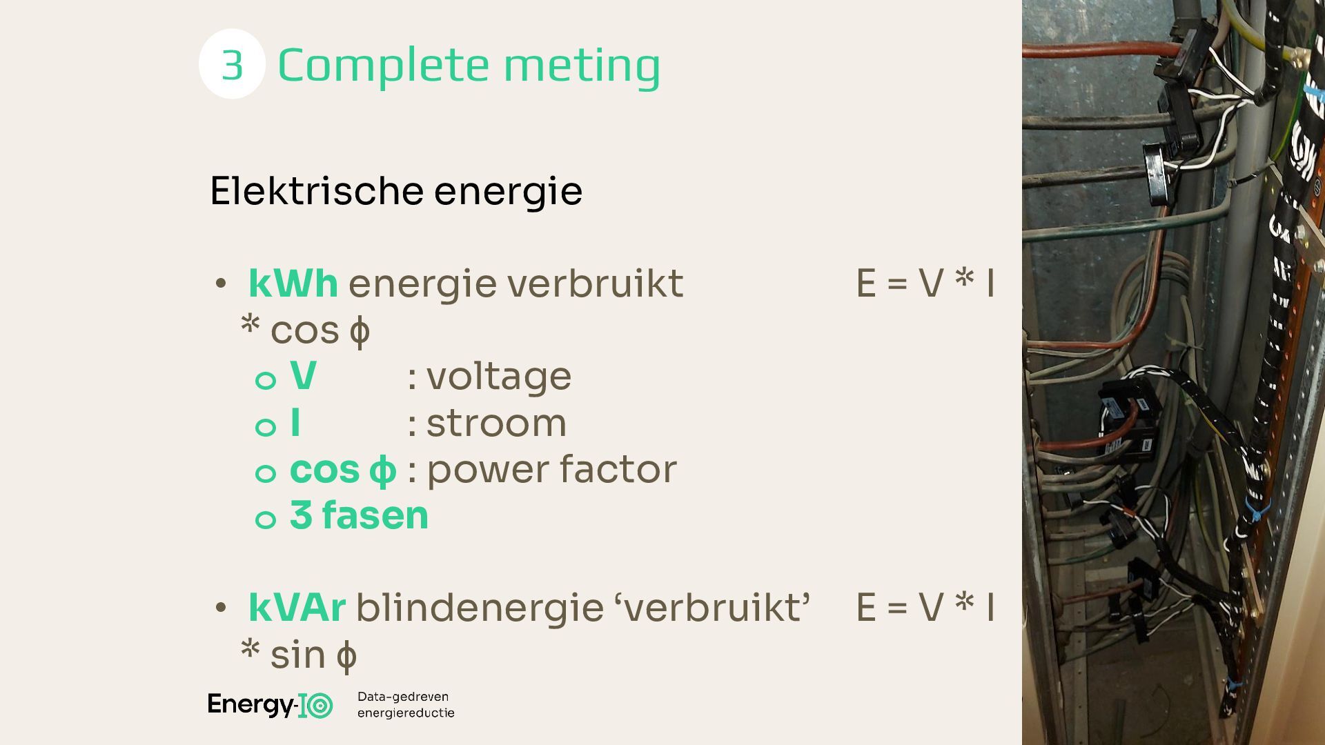 = V * I * cos ϕ o V : voltage o I : stroom o cos ϕ : power factor o 3 fasen • kVAr blindenergie ‘verbruikt’ E = V * I * sin ϕ