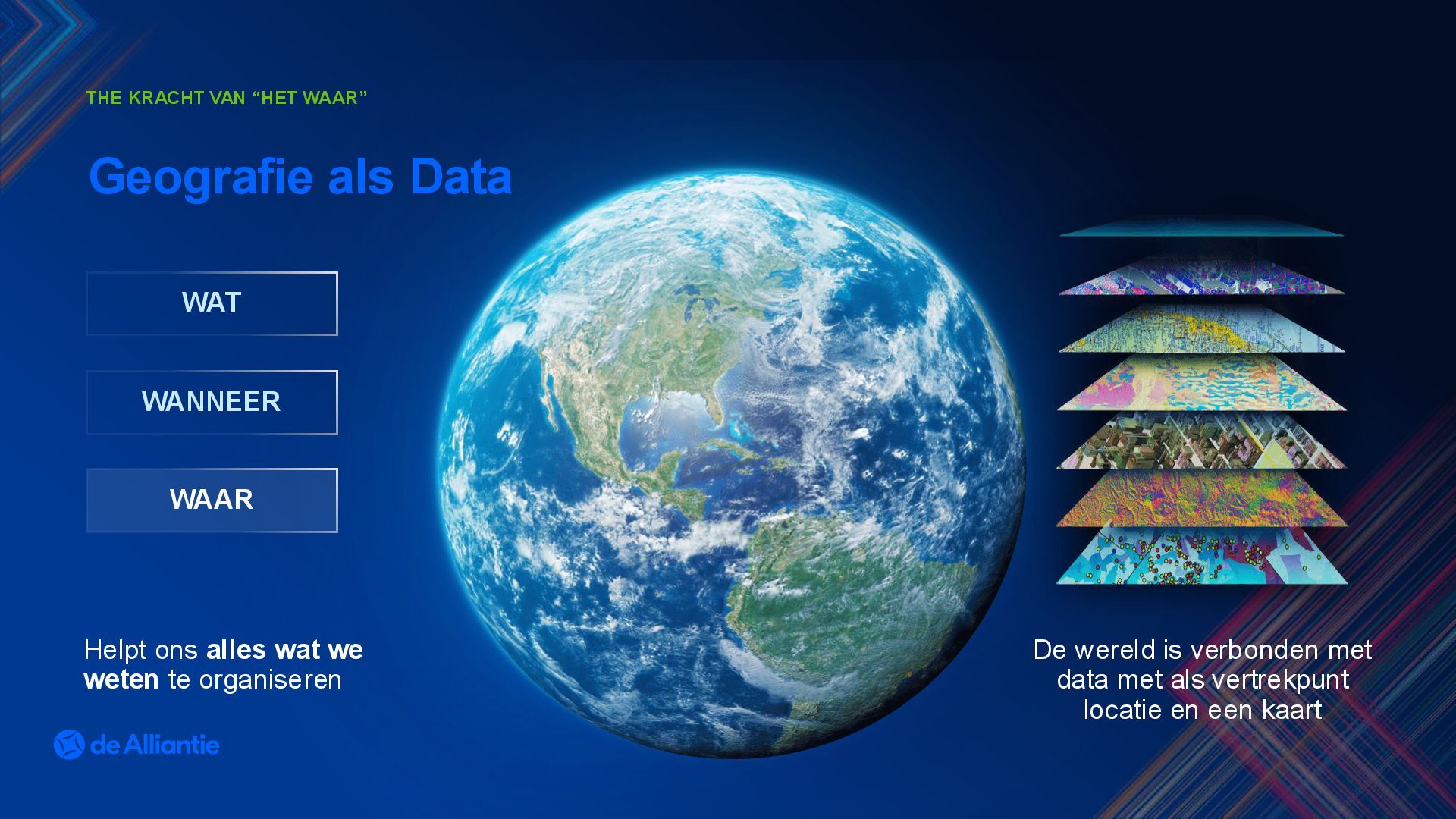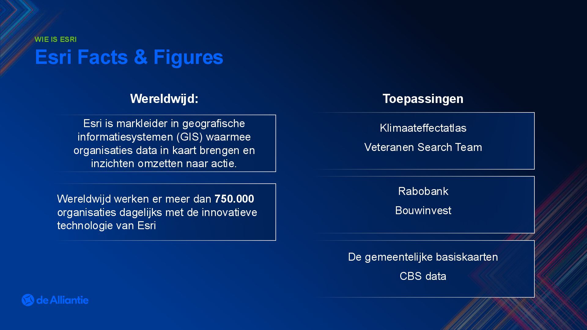 in kaart brengen en inzichten omzetten naar actie. Esri Facts & Figures WIE IS ESRI Klimaateffectatlas Veteranen Search Team Rabobank Bouwinvest De gemeentelijke basiskaarten CBS data Wereldwijd: Toepassingen Wereldwijd werken er meer dan 750.000 organisaties dagelijks met de innovatieve technologie van Esri