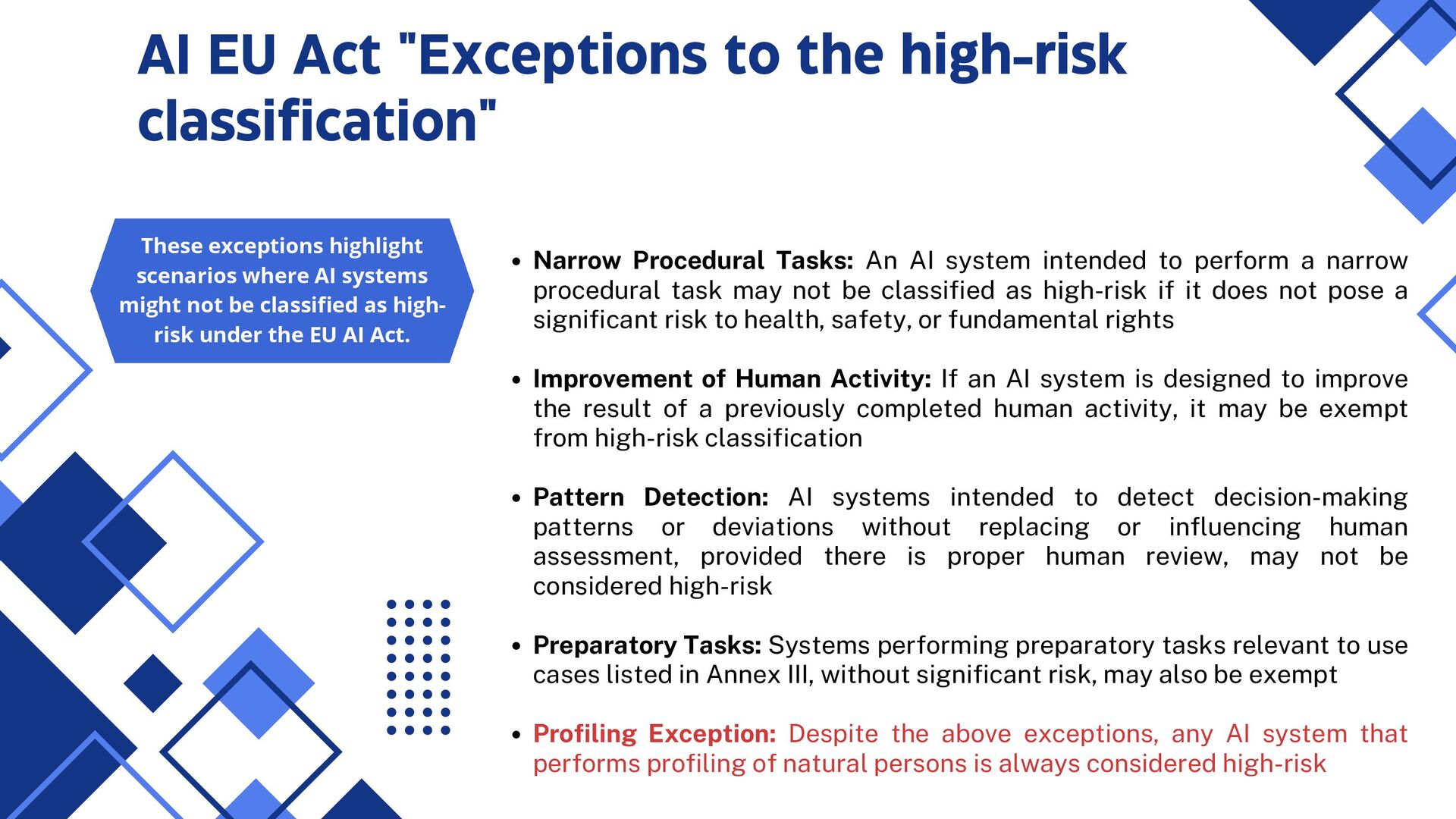 Tasks: An AI system intended to perform a narrow procedural task may not be classified as high-risk if it does not pose a significant risk to health, safety, or fundamental rights Improvement of Human Activity: If an AI system is designed to improve the result of a previously completed human activity, it may be exempt from high-risk classification Pattern Detection: AI systems intended to detect decision-making patterns or deviations without replacing or influencing human assessment, provided there is proper human review, may not be considered high-risk Preparatory Tasks: Systems performing preparatory tasks relevant to use cases listed in Annex III, without significant risk, may also be exempt Profiling Exception: Despite the above exceptions, any AI system that performs profiling of natural persons is always considered high-risk These exceptions highlight scenarios where AI systems might not be classified as high- risk under the EU AI Act.