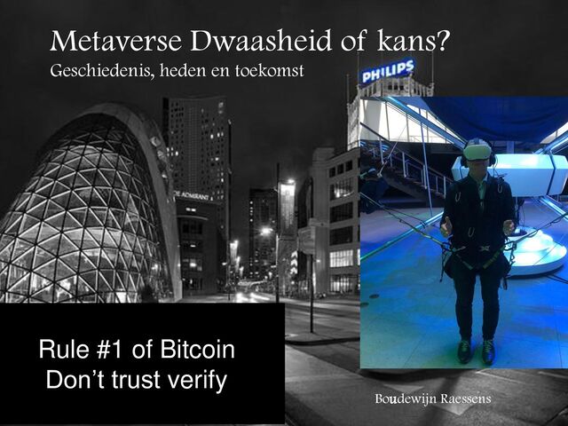 huidige internet. • Van tweedimensionaal naar driedimensionaal • Virtuele wereld die alle andere virtuele werelden met elkaar verbindt (entertainment, reizen, vergaderen, leren), via een avatar (digitale identiteit). • De avatar heeft digitale spullen, digitale kleding en digitale coins. • Facebook heeft haar naam veranderd in ‘Meta’.