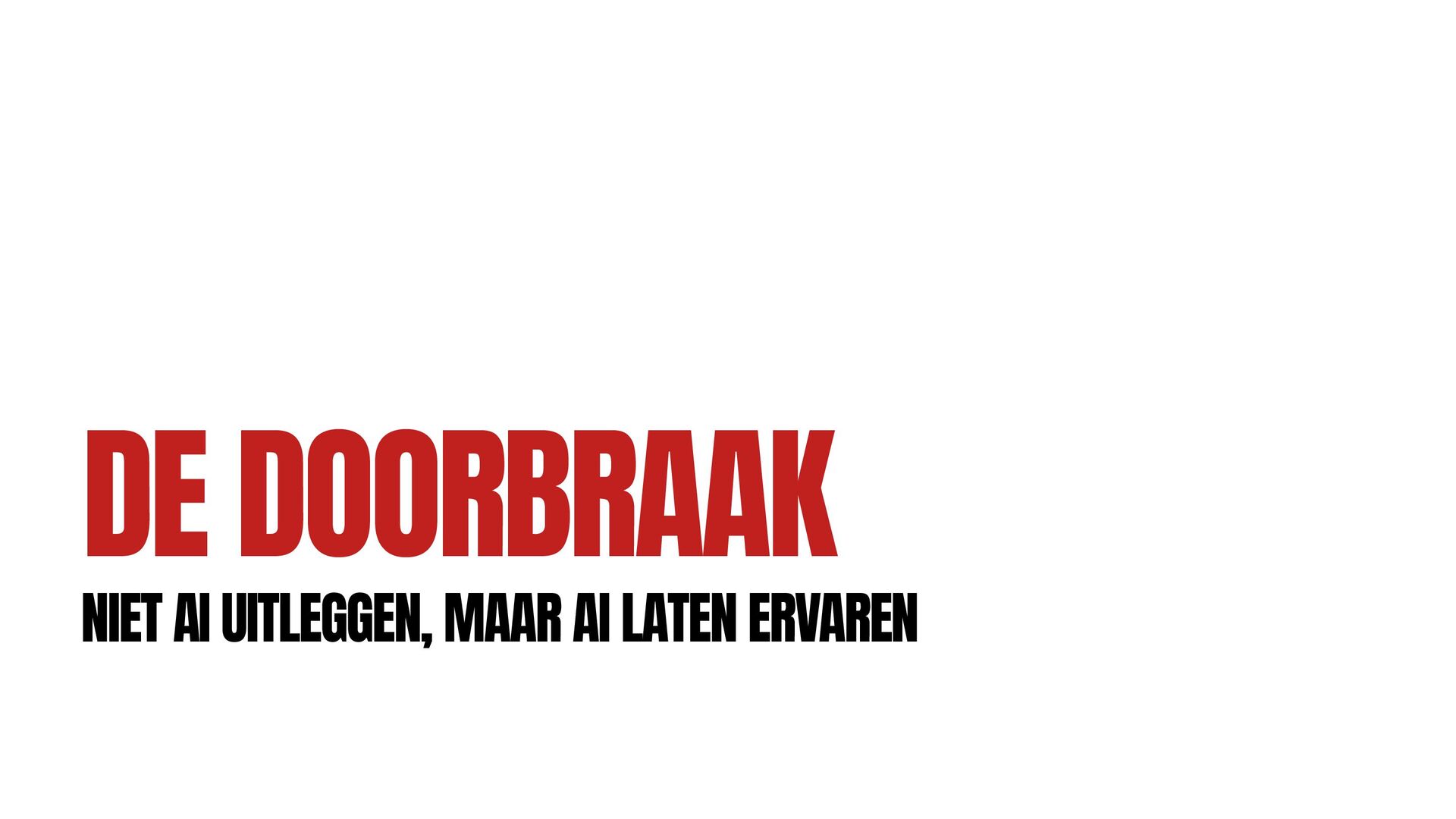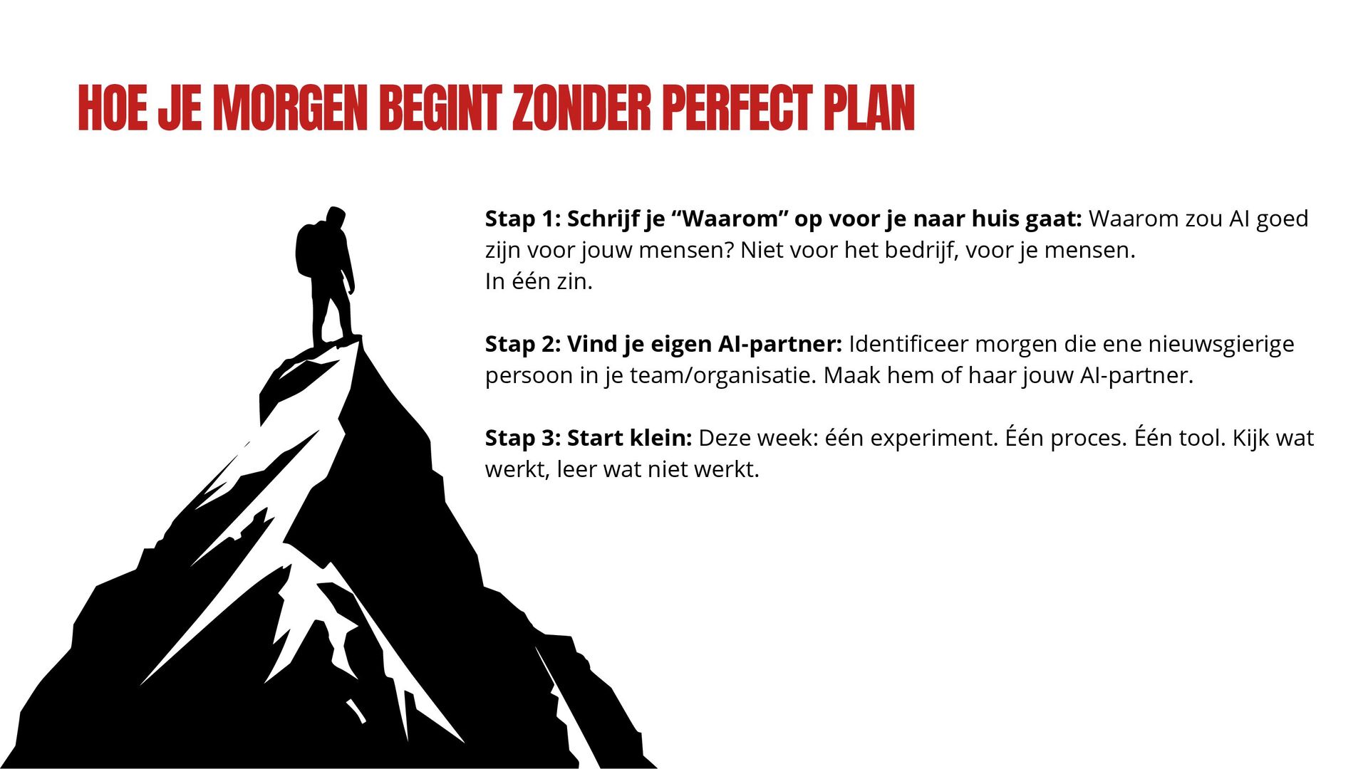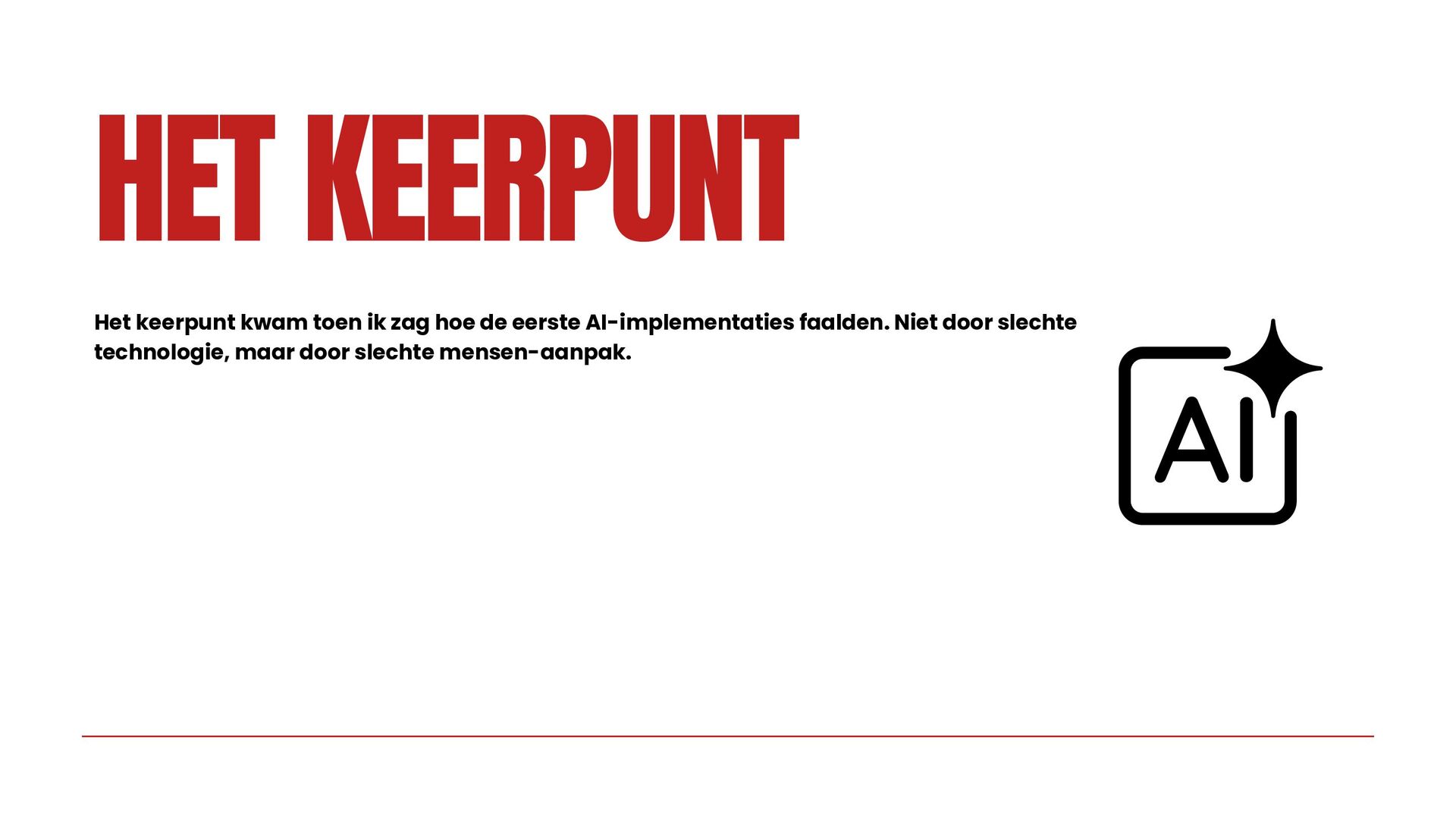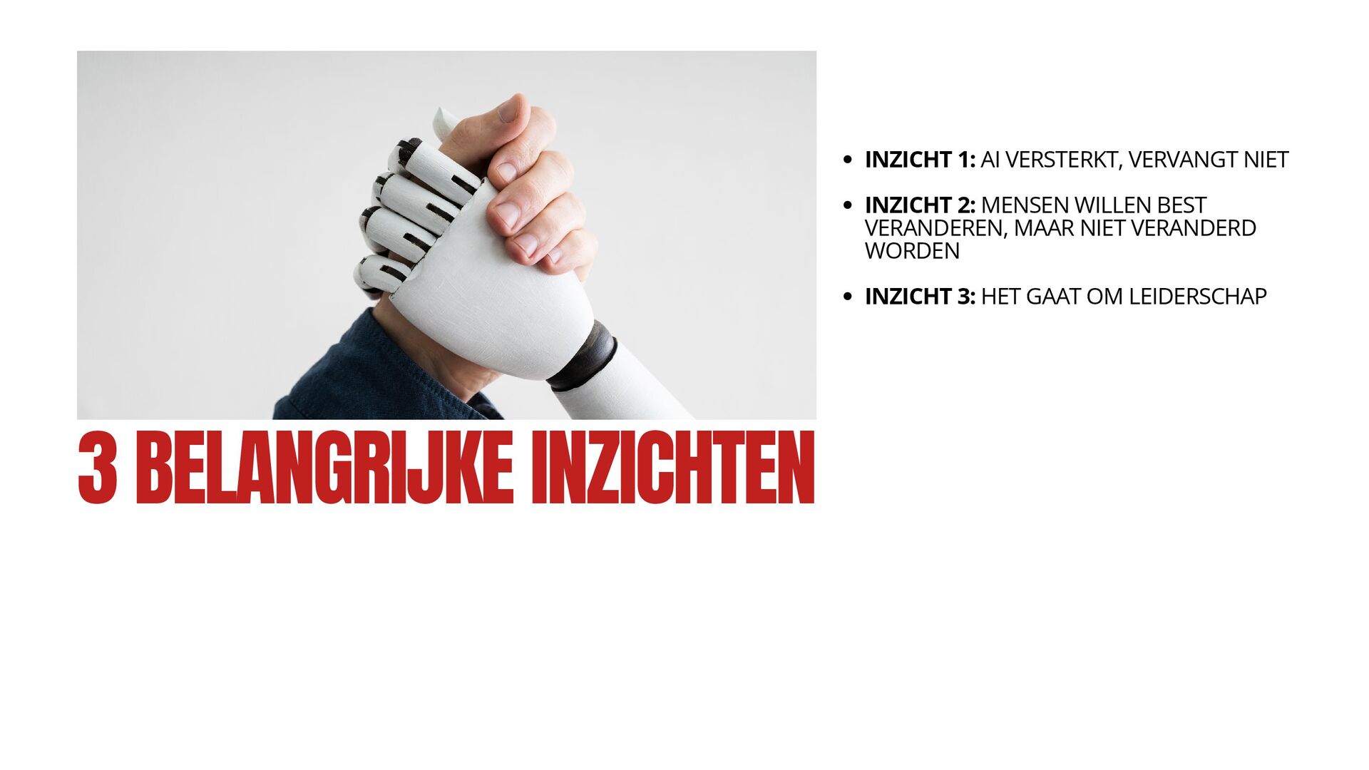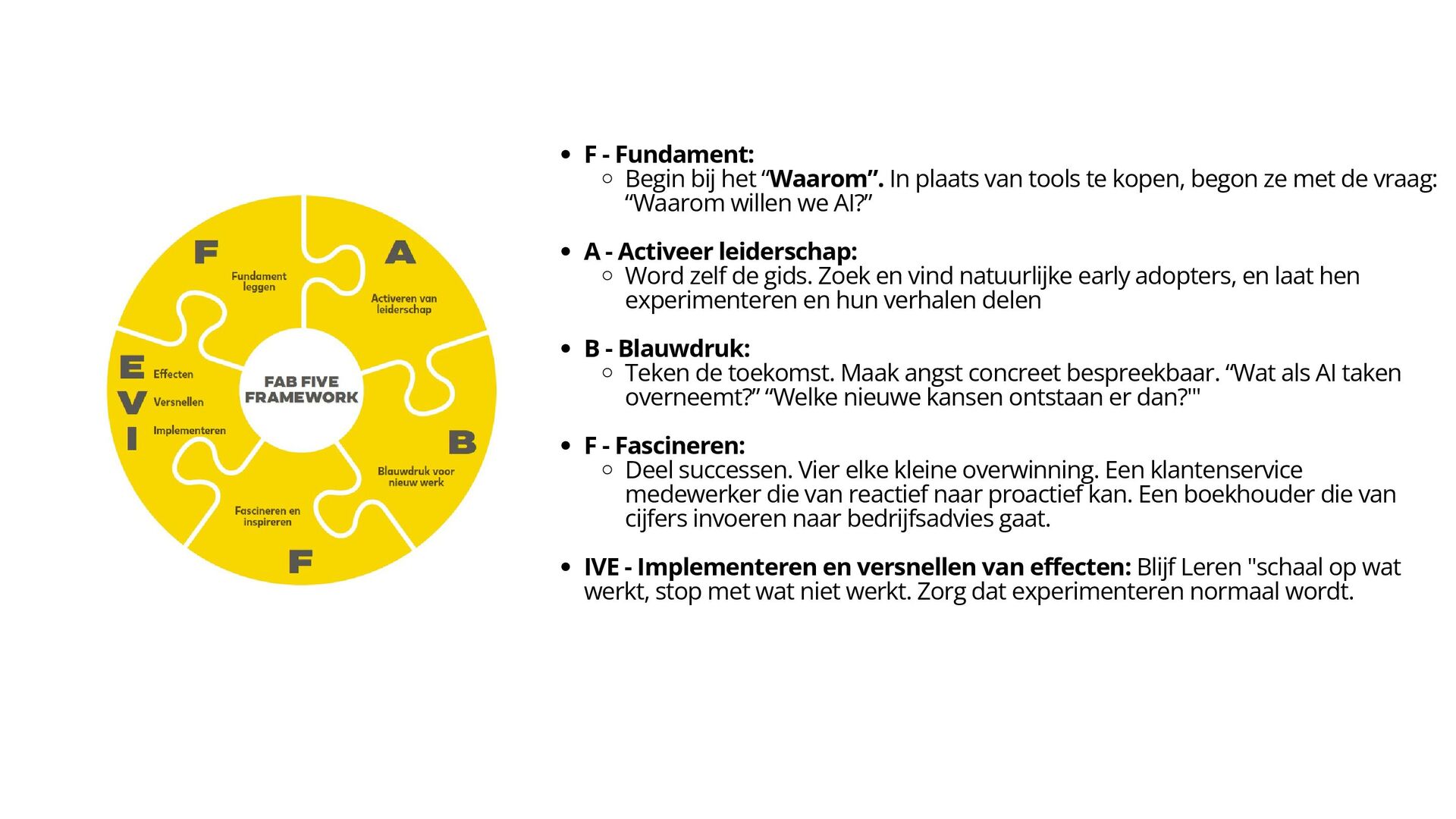 tools te kopen, begon ze met de vraag: “Waarom willen we AI?” A - Activeer leiderschap: Word zelf de gids. Zoek en vind natuurlijke early adopters, en laat hen experimenteren en hun verhalen delen B - Blauwdruk: Teken de toekomst. Maak angst concreet bespreekbaar. “Wat als AI taken overneemt?” “Welke nieuwe kansen ontstaan er dan?'" F - Fascineren: Deel successen. Vier elke kleine overwinning. Een klantenservice medewerker die van reactief naar proactief kan. Een boekhouder die van cijfers invoeren naar bedrijfsadvies gaat. IVE - Implementeren en versnellen van effecten: Blijf Leren "schaal op wat werkt, stop met wat niet werkt. Zorg dat experimenteren normaal wordt.