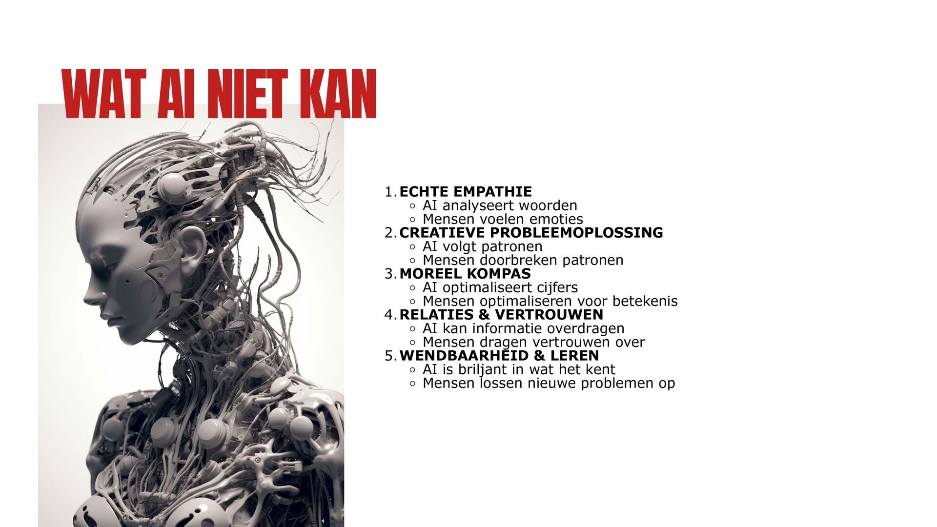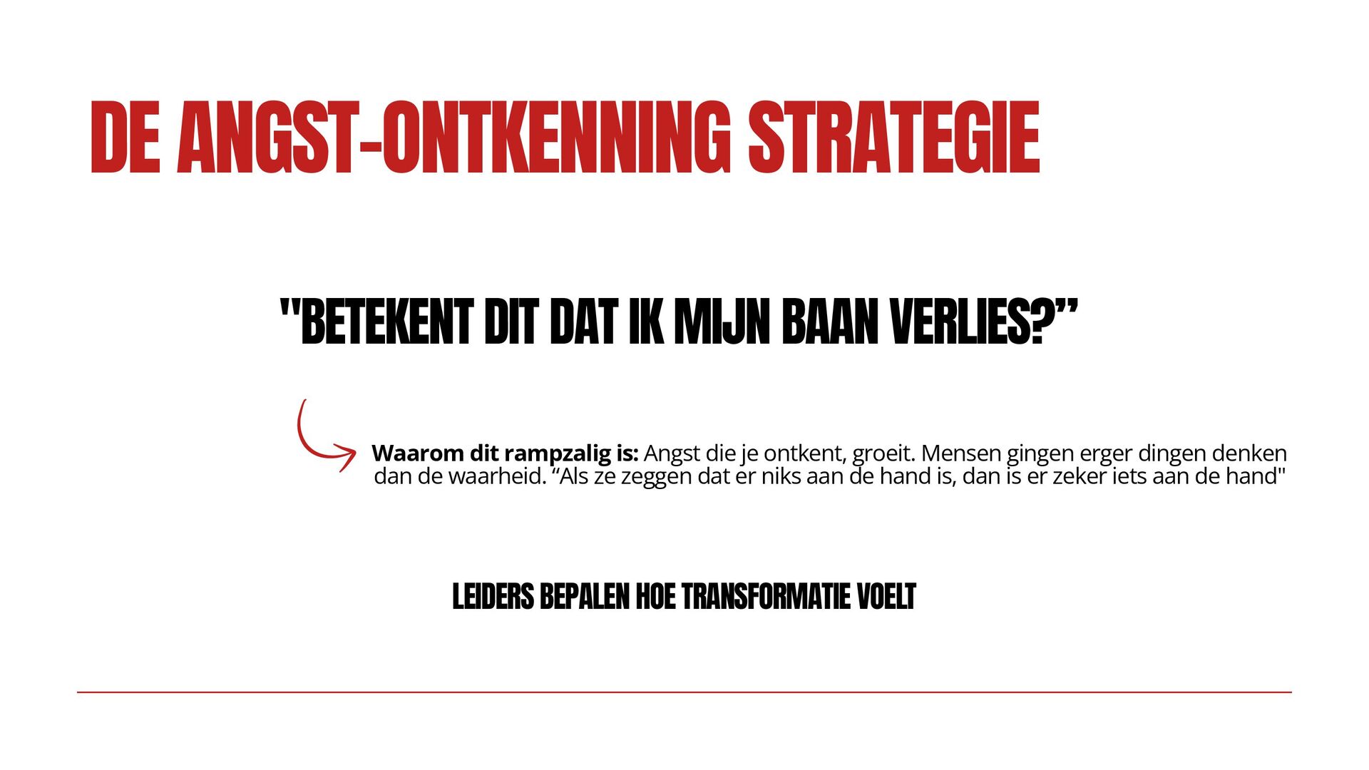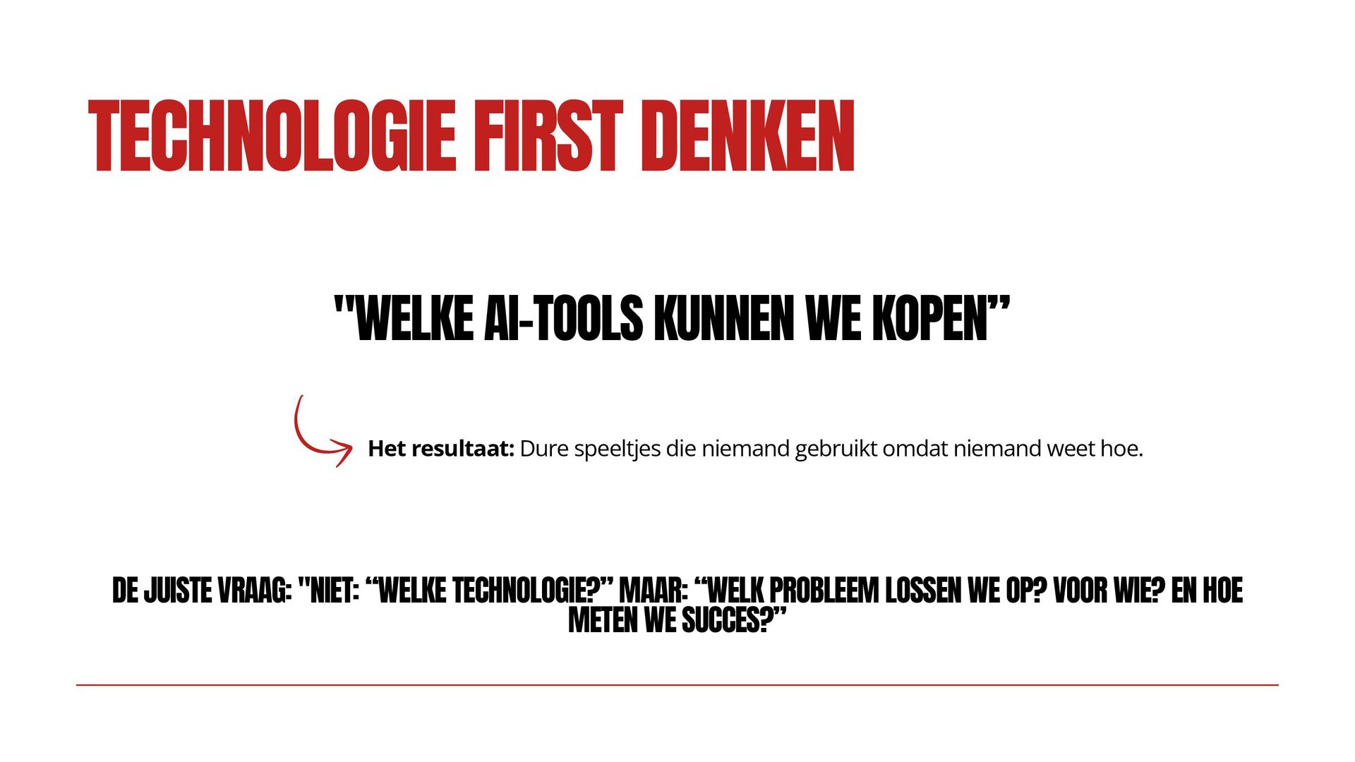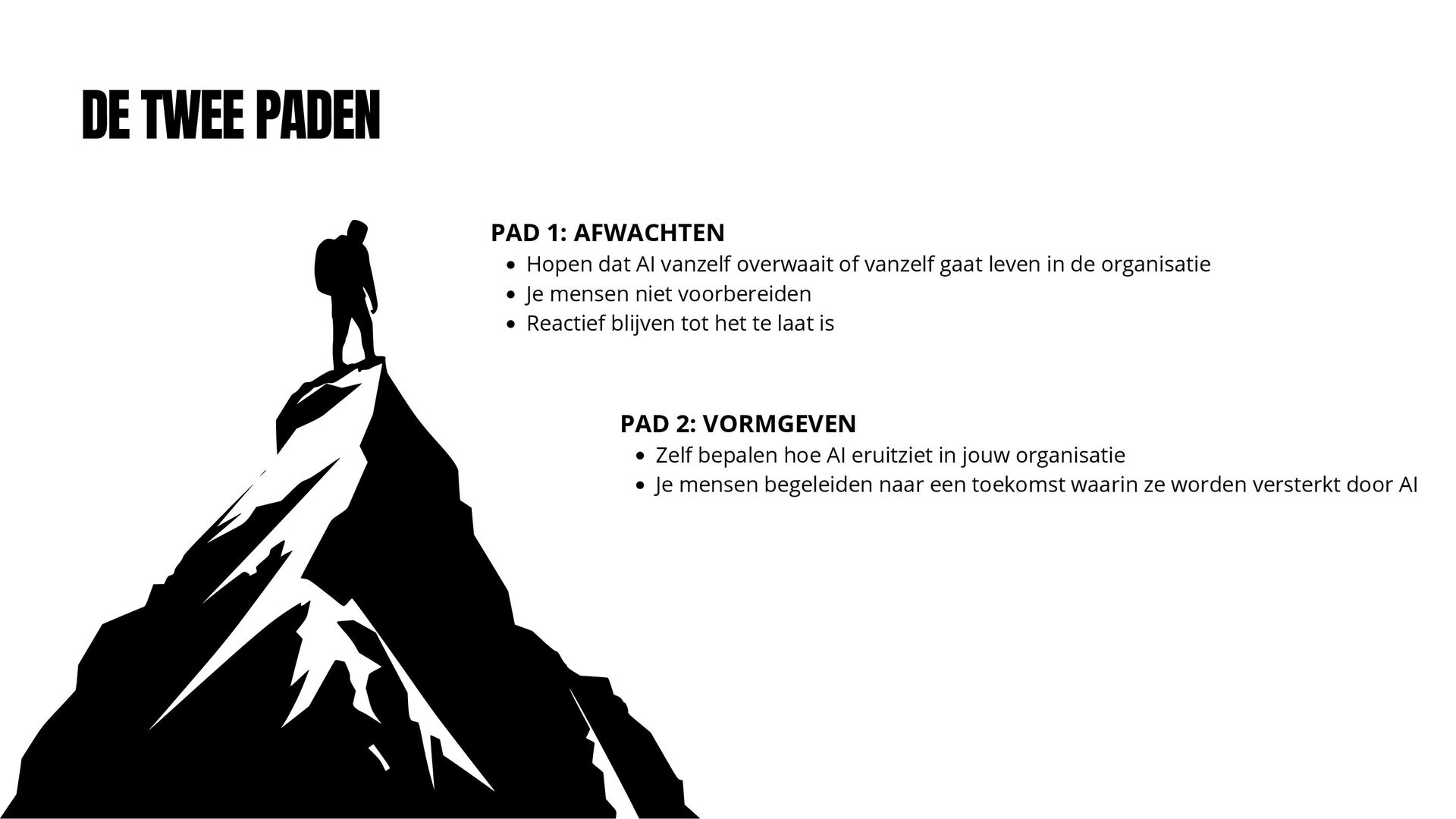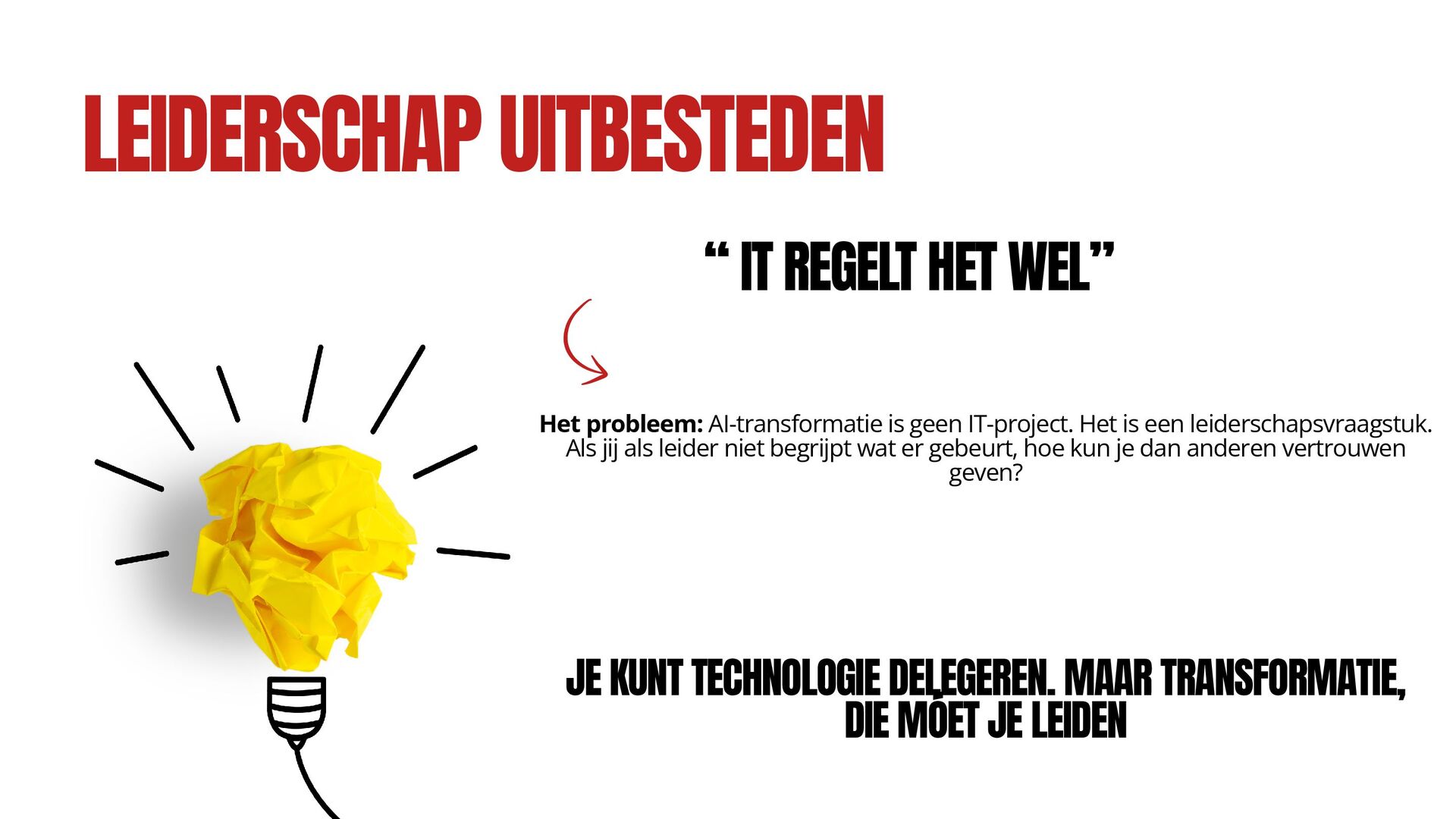 tools te kopen, begon ze met de vraag: “Waarom willen we AI?” A - Activeer leiderschap: Word zelf de gids. Zoek en vind natuurlijke early adopters, en laat hen experimenteren en hun verhalen delen B - Blauwdruk: Teken de toekomst. Maak angst concreet bespreekbaar. “Wat als AI taken overneemt?” “Welke nieuwe kansen ontstaan er dan?'" F - Fascineren: Deel successen. Vier elke kleine overwinning. Een klantenservice medewerker die van reactief naar proactief kan. Een boekhouder die van cijfers invoeren naar bedrijfsadvies gaat. IVE - Implementeren en versnellen van effecten: Blijf Leren "schaal op wat werkt, stop met wat niet werkt. Zorg dat experimenteren normaal wordt.