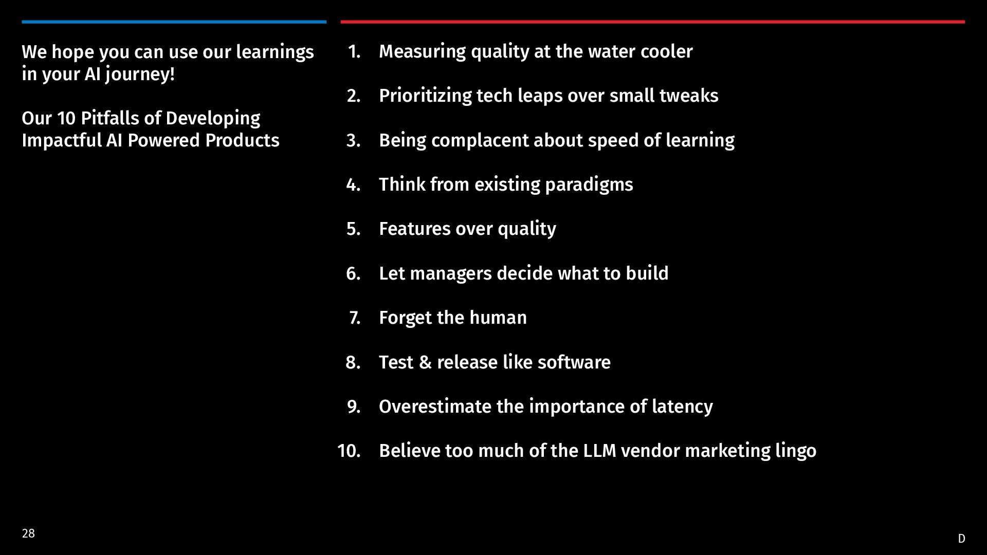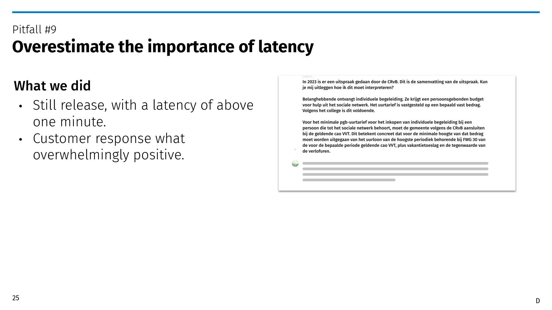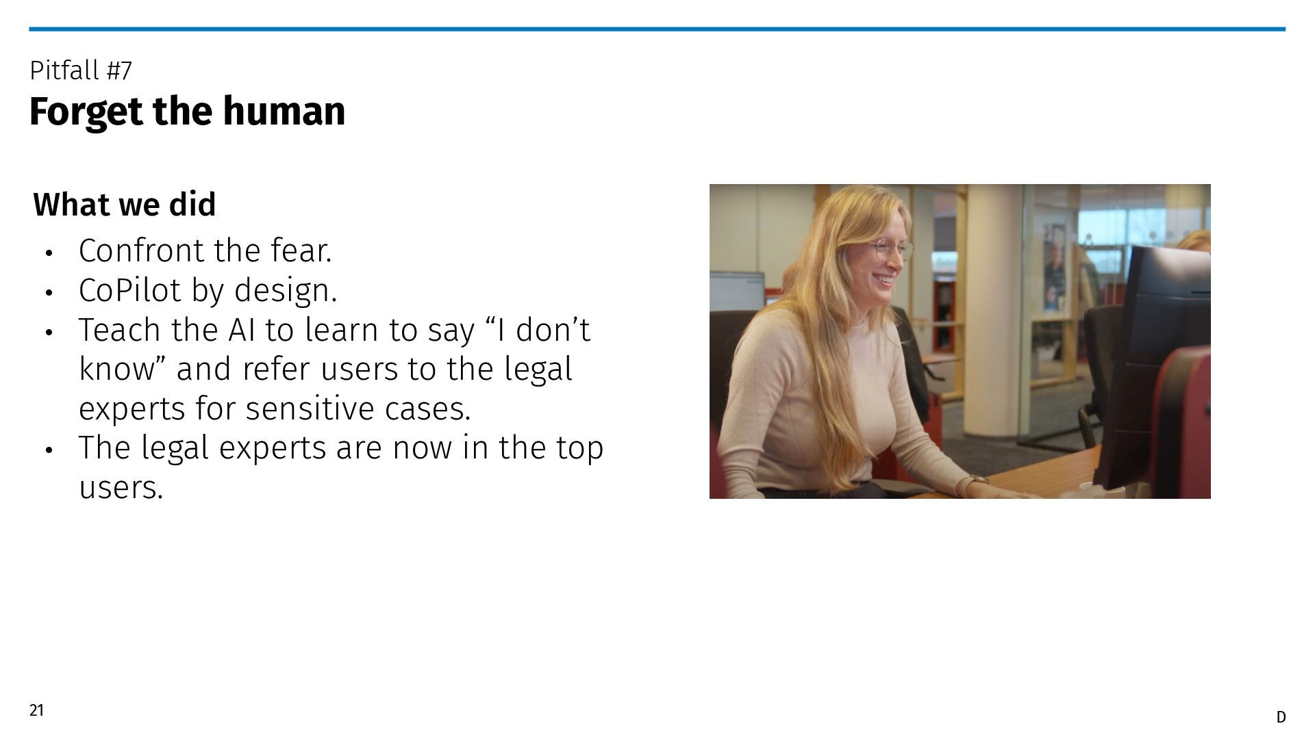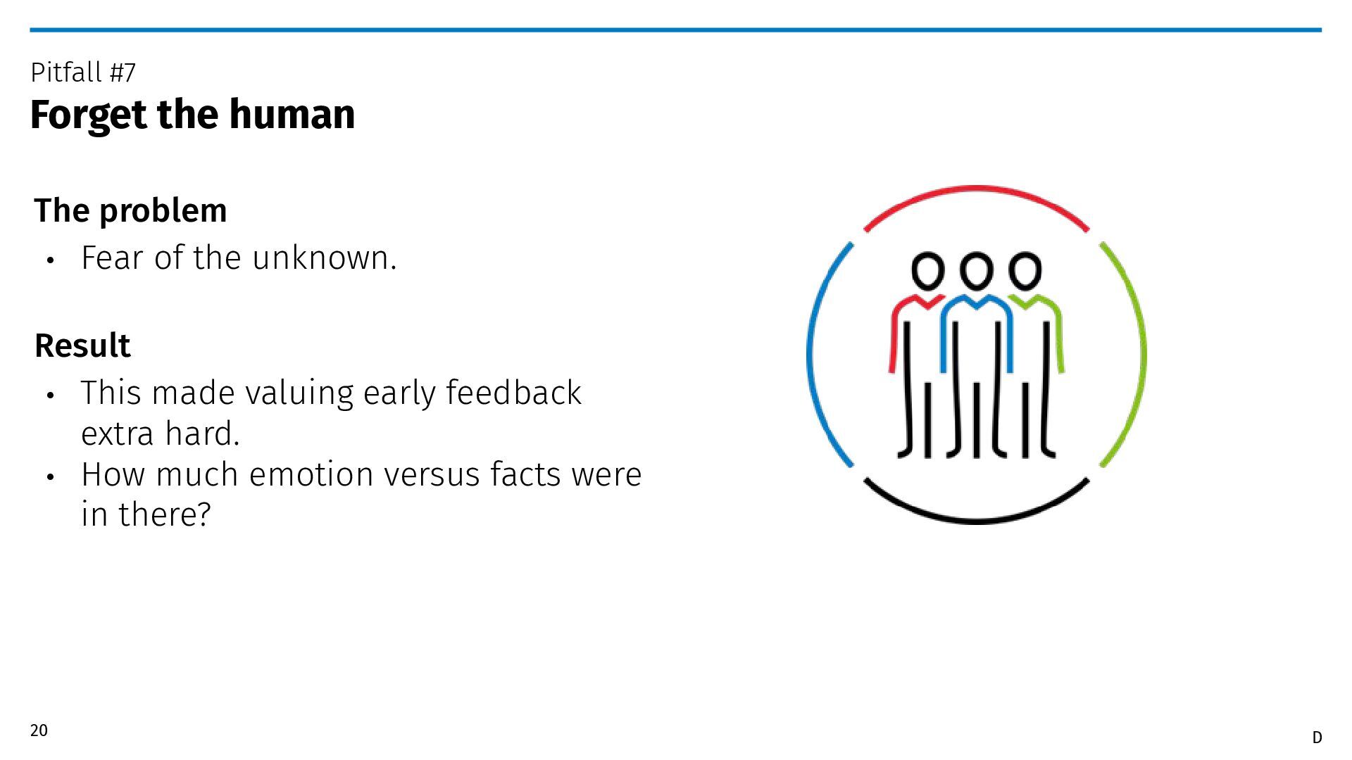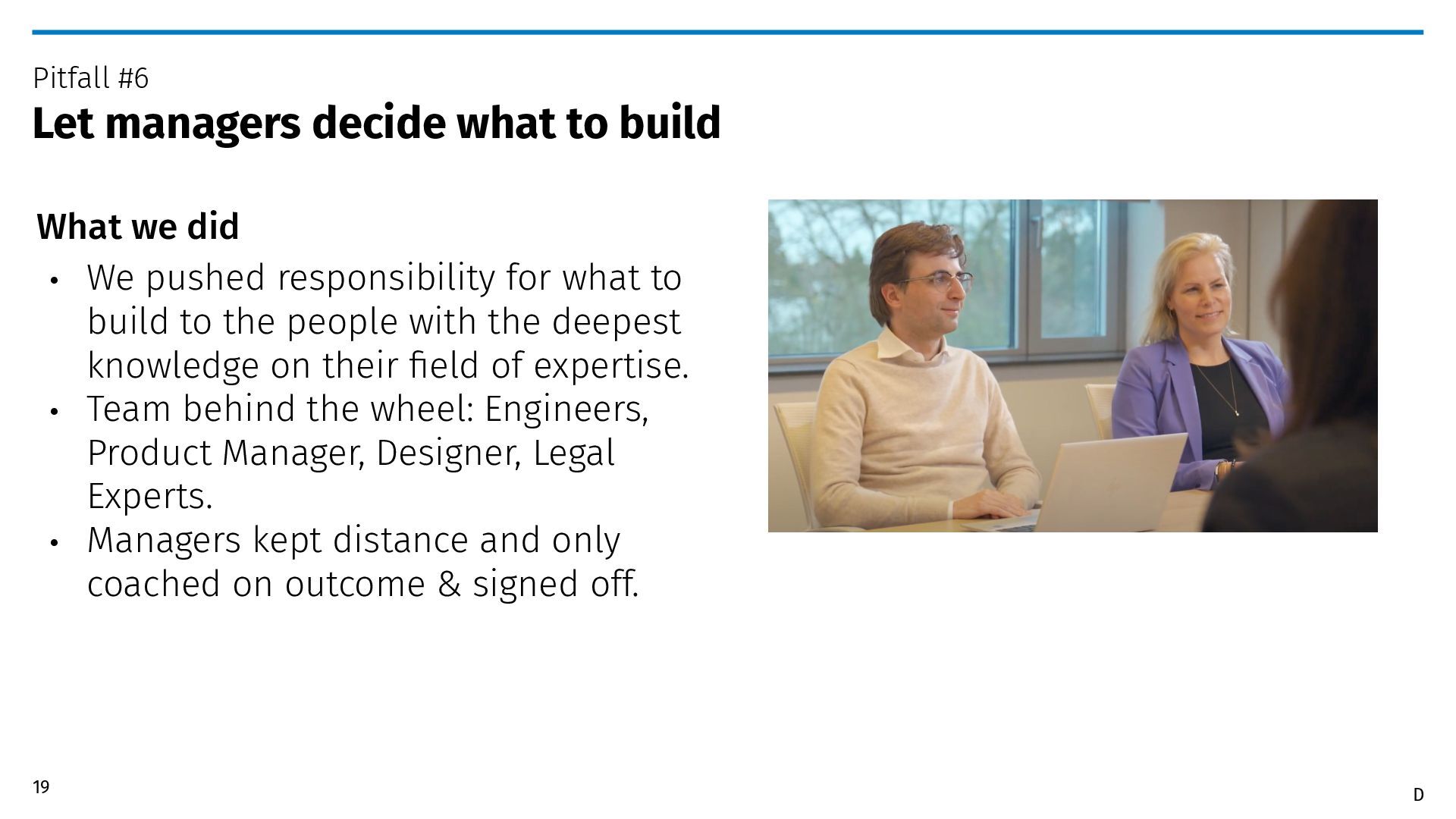 we did • We pushed responsibility for what to build to the people with the deepest knowledge on their field of expertise. • Team behind the wheel: Engineers, Product Manager, Designer, Legal Experts. • Managers kept distance and only coached on outcome & signed off. D