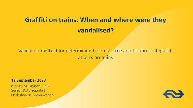 method for determining high-risk time and locations of graffiti attacks on trains 13 September 2023 Branka Milivojevic, PhD Senior Data Scientist Nederlandse Spoorwegen