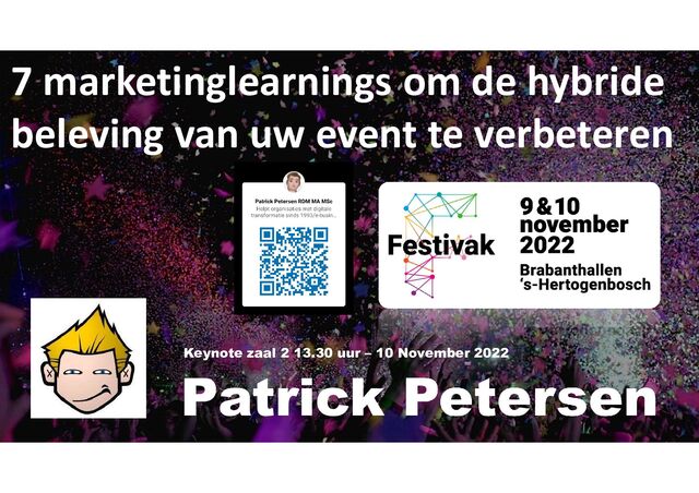 We starten zo Patrick Petersen 7 marketinglearnings om de hybride beleving van uw event te verbeteren Keynote zaal 2 13.30 uur – 10 November 2022