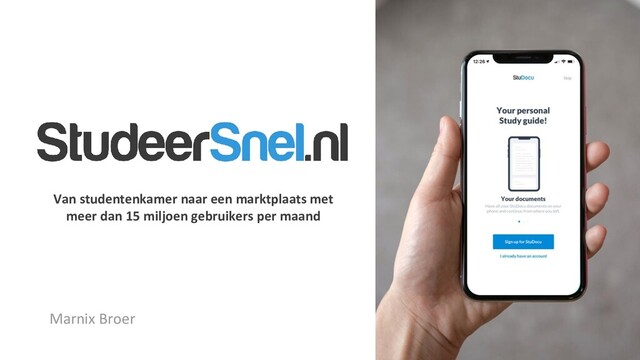 aantekeningen en essays geschreven Op dit moment hebben studenten geen toegang tot deze enorme hoeveelheid aan kennis Wereldwijd zijn er 250 miljoen studenten op zoek naar manieren om sneller & beter te studeren Kans Oplossing Studenten uploaden hun studiedocumenten op het platform, geordend per vak of per boek Deze 8 miljoen documenten worden bekeken en gedownload door 15+ miljoen studenten per maand De Chat-groepen bieden een geweldige plek voor discussies, Q&A's en samenwerkingen StuDocu wil dé online studenten community zijn die al deze kennis beschikbaar maakt voor alle studenten ter wereld