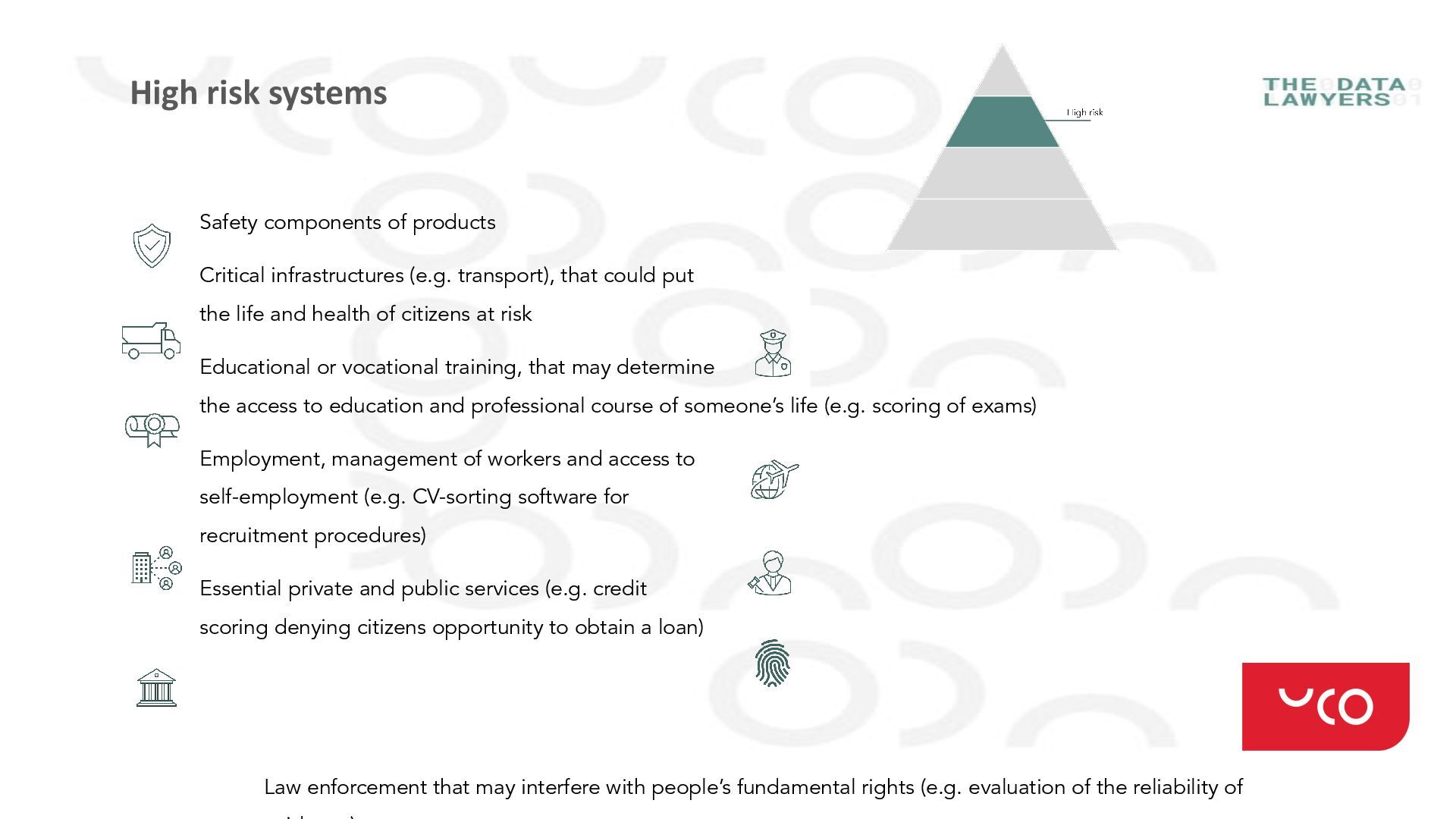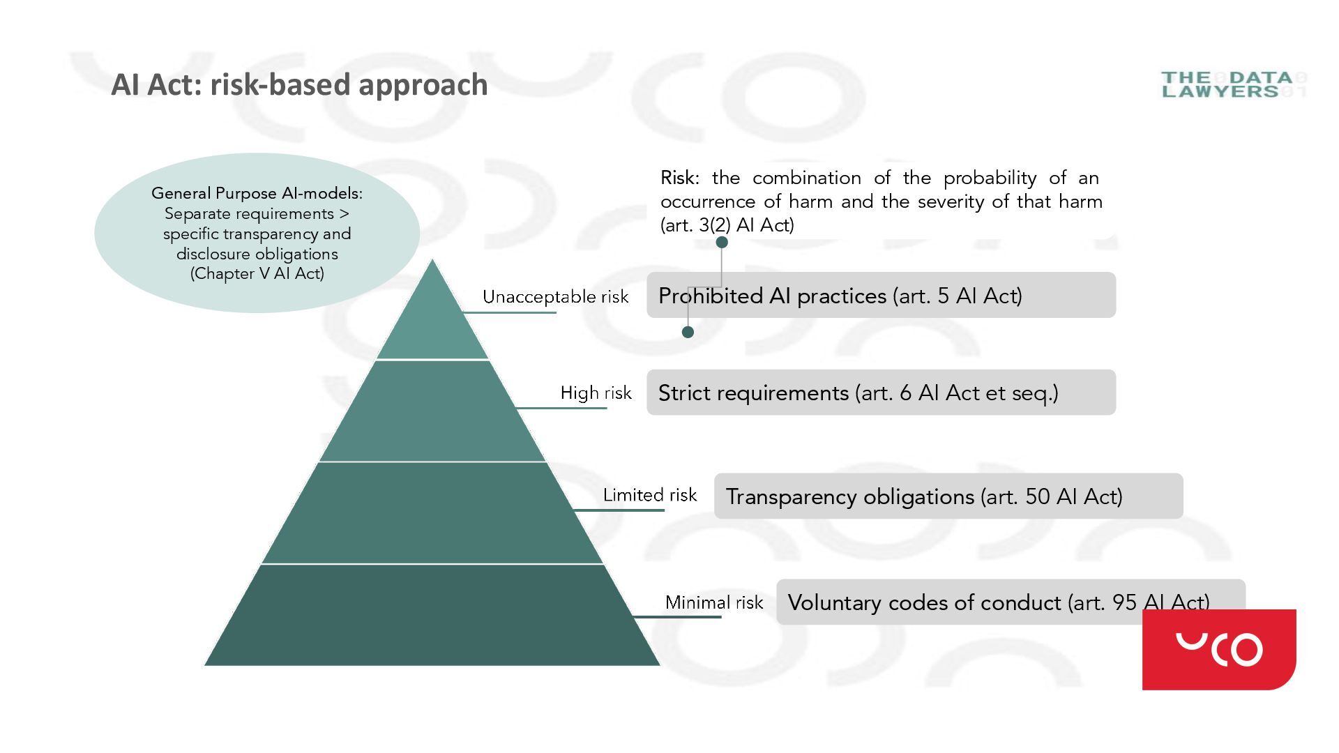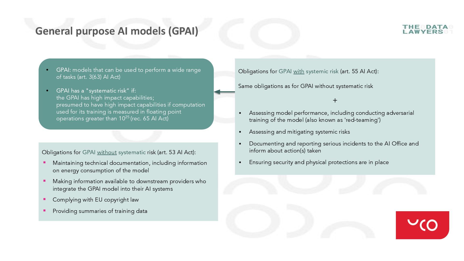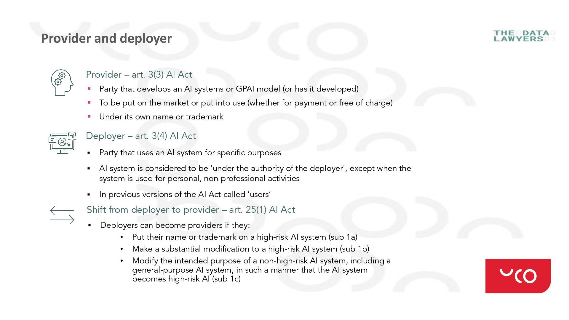 ▪ Party that develops an AI systems or GPAI model (or has it developed) ▪ To be put on the market or put into use (whether for payment or free of charge) ▪ Under its own name or trademark Deployer – art. 3(4) AI Act ▪ Party that uses an AI system for specific purposes ▪ AI system is considered to be 'under the authority of the deployer', except when the system is used for personal, non-professional activities ▪ In previous versions of the AI Act called ‘users’ Shift from deployer to provider – art. 25(1) AI Act ▪ Deployers can become providers if they: • Put their name or trademark on a high-risk AI system (sub 1a) • Make a substantial modification to a high-risk AI system (sub 1b) • Modify the intended purpose of a non-high-risk AI system, including a general-purpose AI system, in such a manner that the AI system becomes high-risk AI (sub 1c)