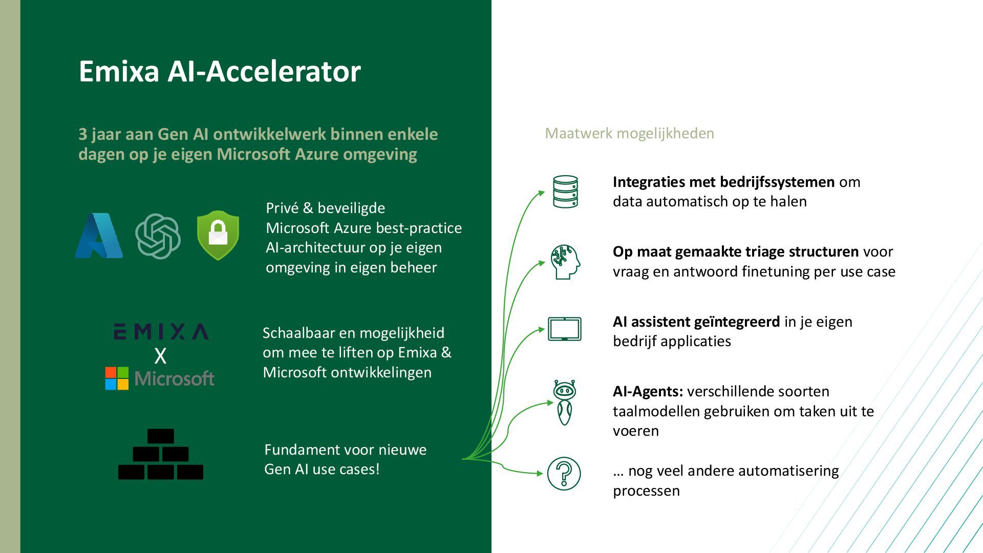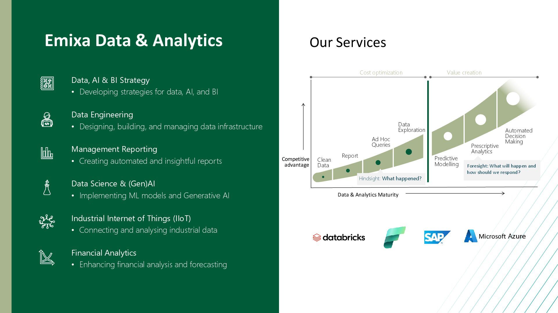 happened? Cost optimization Value creation Predictive Modelling Prescriptive Analytics Automated Decision Making Foresight: What will happen and how should we respond? Competitive advantage Data & Analytics Maturity Emixa Data & Analytics Our Services Microsoft Azure Data, AI & BI Strategy • Developing strategies for data, AI, and BI Data Engineering • Designing, building, and managing data infrastructure Management Reporting • Creating automated and insightful reports Financial Analytics • Enhancing financial analysis and forecasting Industrial Internet of Things (IIoT) • Connecting and analysing industrial data Data Science & (Gen)AI • Implementing ML models and Generative AI