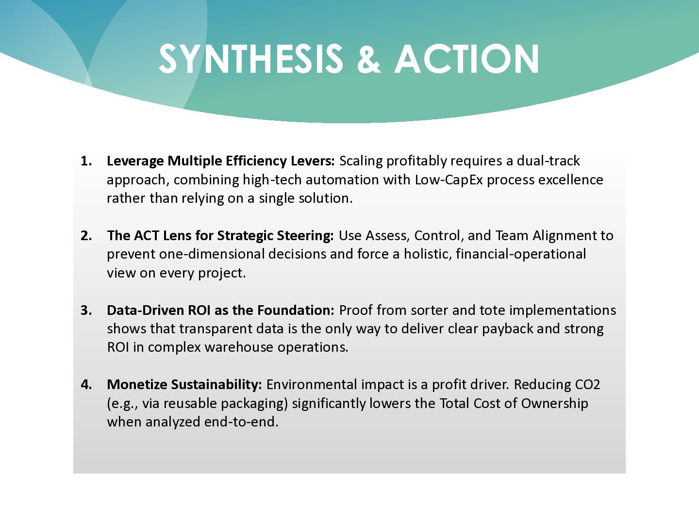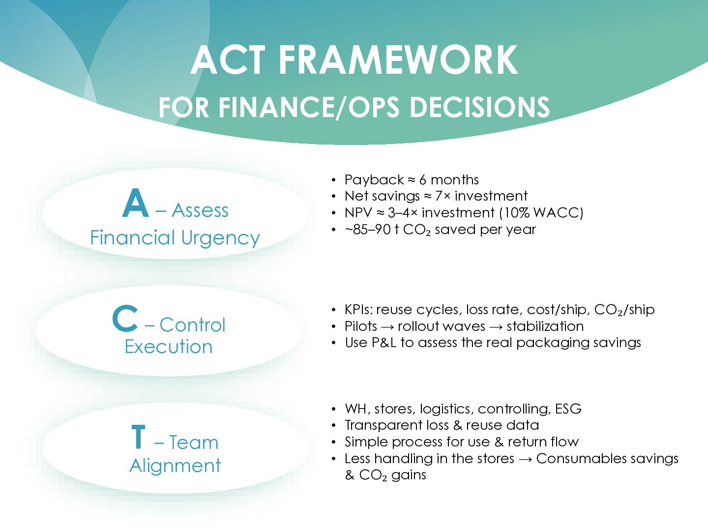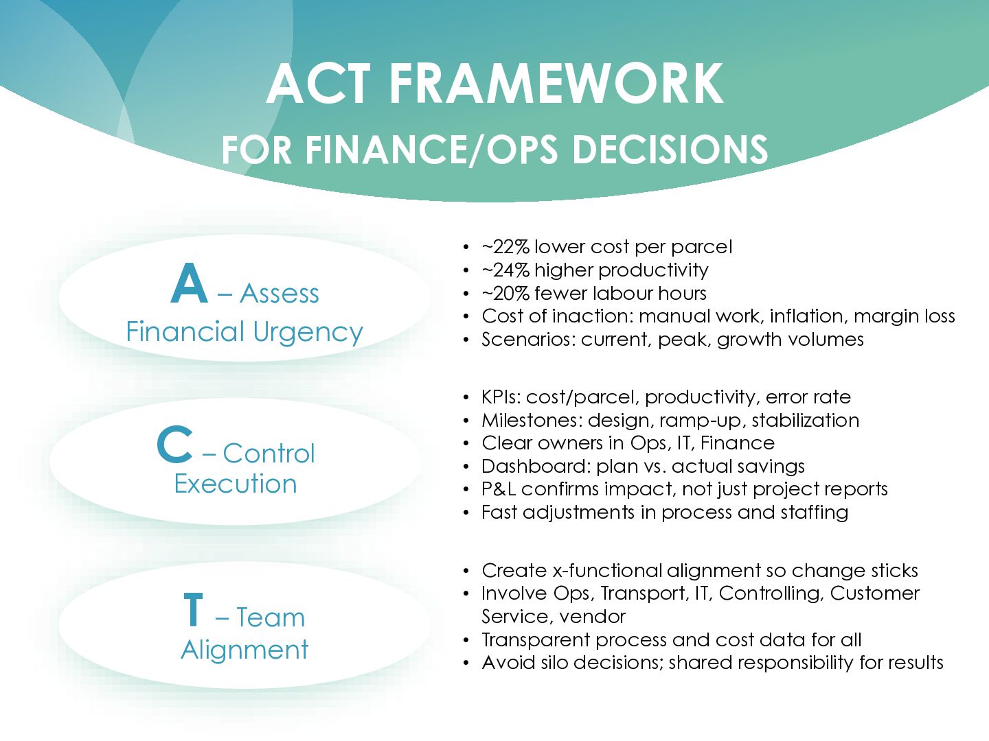 T – Team Alignment C – Control Execution • ~22% lower cost per parcel • ~24% higher productivity • ~20% fewer labour hours • Cost of inaction: manual work, inflation, margin loss • Scenarios: current, peak, growth volumes • KPIs: cost/parcel, productivity, error rate • Milestones: design, ramp-up, stabilization • Clear owners in Ops, IT, Finance • Dashboard: plan vs. actual savings • P&L confirms impact, not just project reports • Fast adjustments in process and staffing • Create x-functional alignment so change sticks • Involve Ops, Transport, IT, Controlling, Customer Service, vendor • Transparent process and cost data for all • Avoid silo decisions; shared responsibility for results
