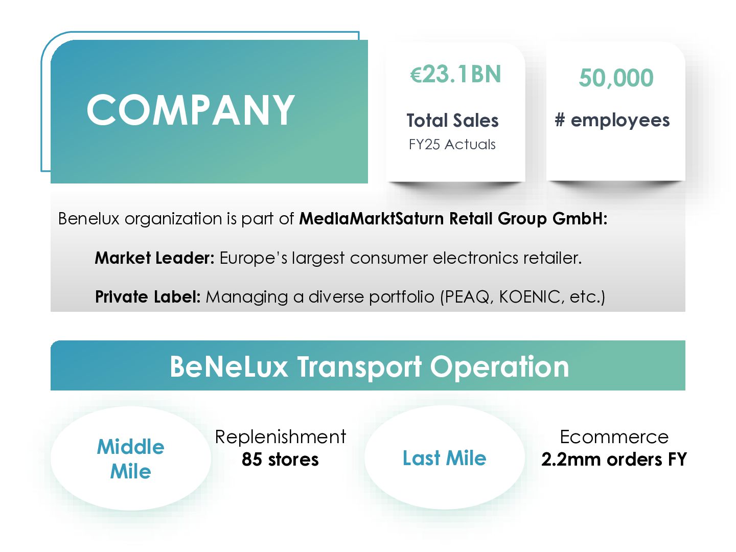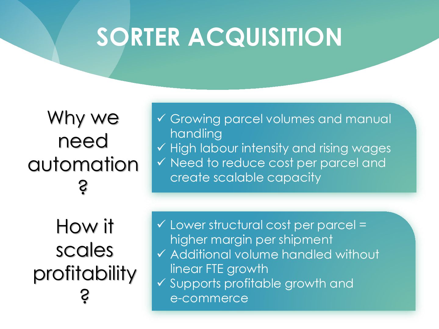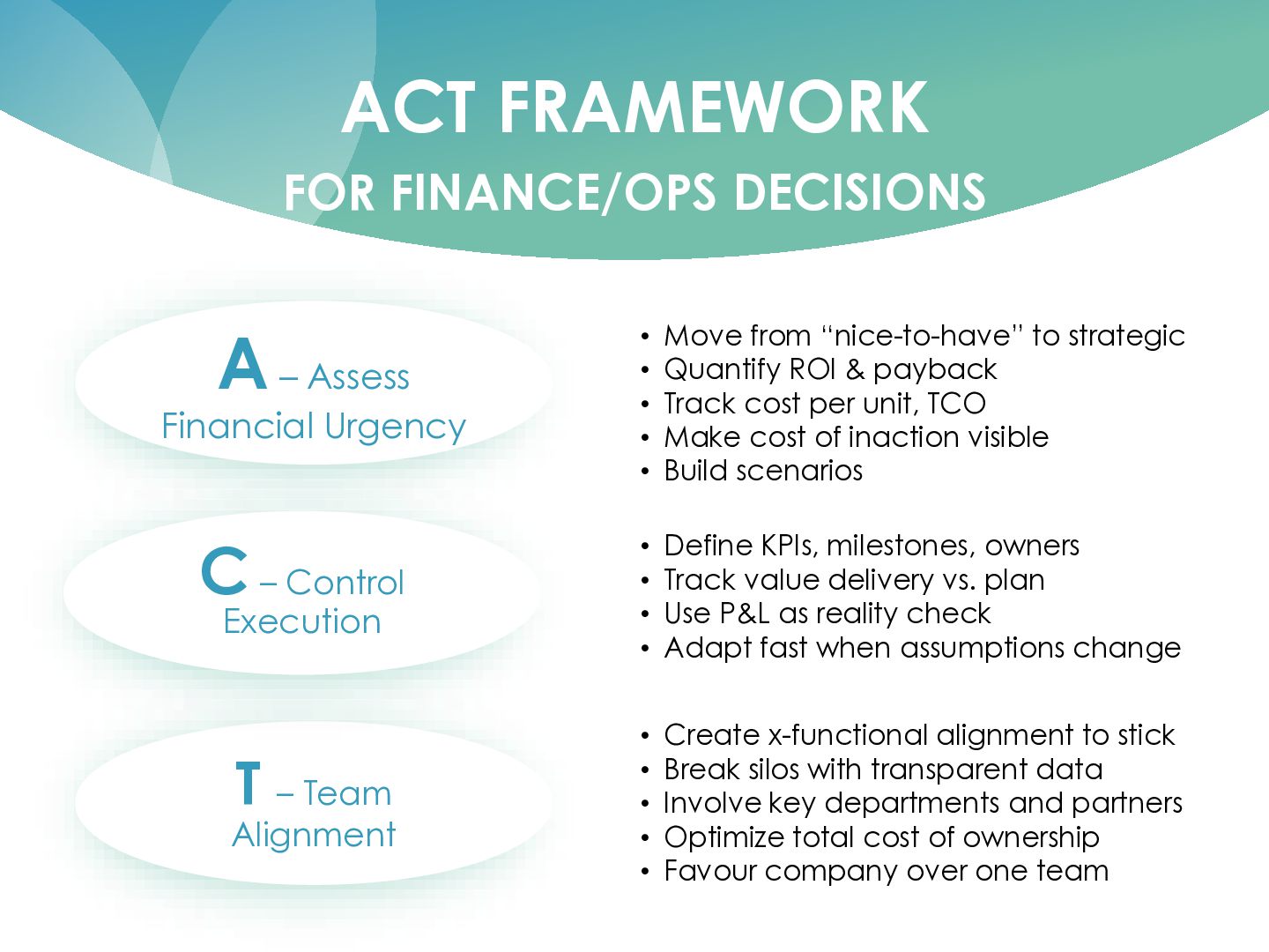 T – Team Alignment C – Control Execution • ~22% lower cost per parcel • ~24% higher productivity • ~20% fewer labour hours • Cost of inaction: manual work, inflation, margin loss • Scenarios: current, peak, growth volumes • KPIs: cost/parcel, productivity, error rate • Milestones: design, ramp-up, stabilization • Clear owners in Ops, IT, Finance • Dashboard: plan vs. actual savings • P&L confirms impact, not just project reports • Fast adjustments in process and staffing • Create x-functional alignment so change sticks • Involve Ops, Transport, IT, Controlling, Customer Service, vendor • Transparent process and cost data for all • Avoid silo decisions; shared responsibility for results