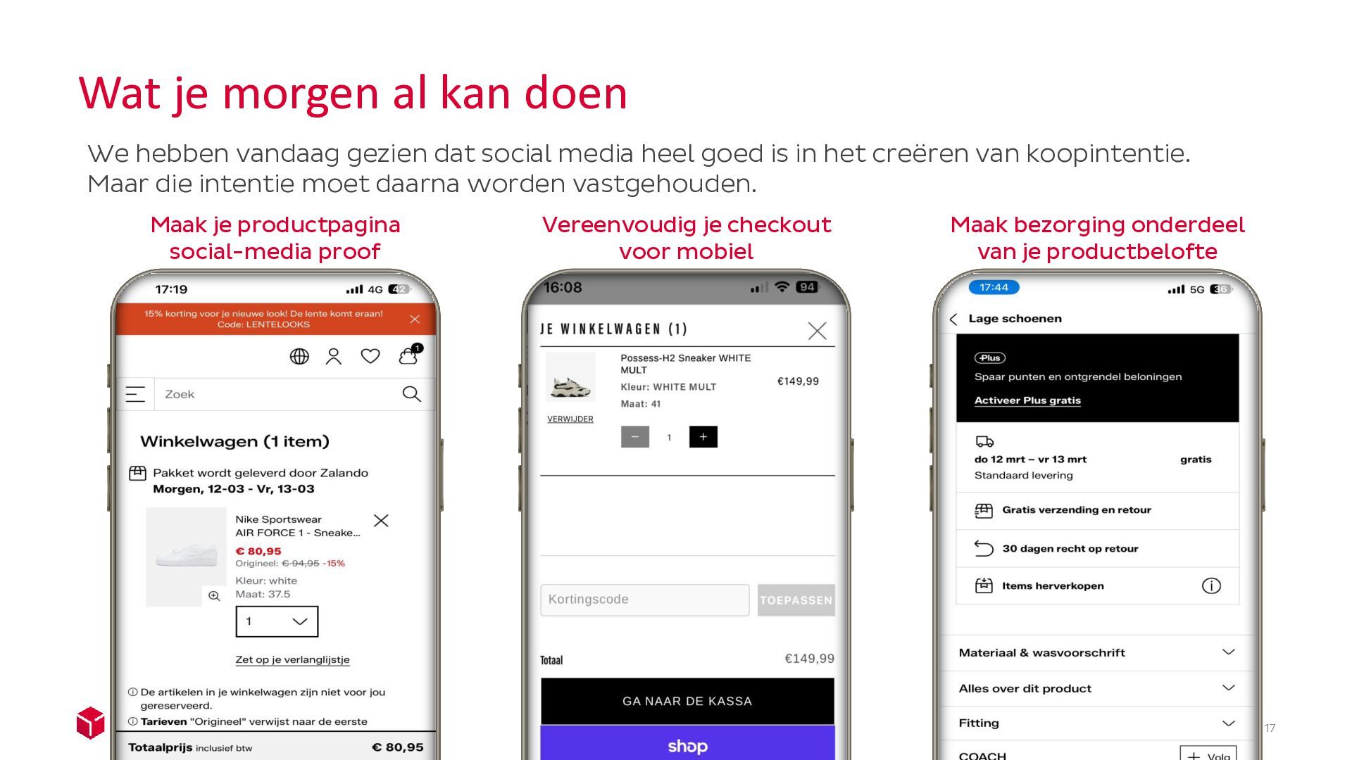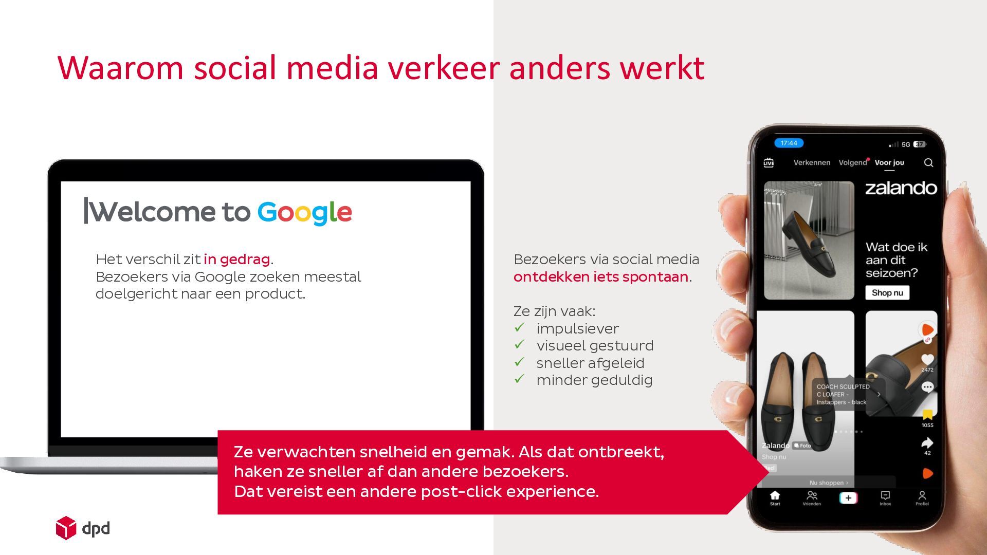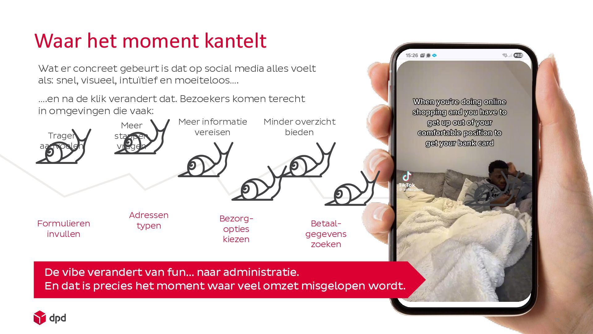 dat op social media alles voelt als: snel, visueel, intuïtief en moeiteloos…. De vibe verandert van fun… naar administratie. En dat is precies het moment waar veel omzet misgelopen wordt. ….en na de klik verandert dat. Bezoekers komen terecht in omgevingen die vaak: Trager aanvoelen Meer stappen vragen Meer informatie vereisen Adressen typen Formulieren invullen Bezorg- opties kiezen Betaal- gegevens zoeken Minder overzicht bieden