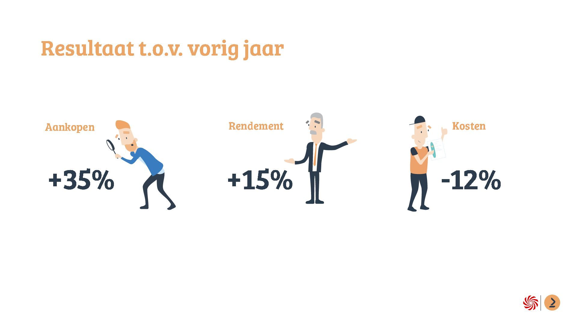 Resultaat t.o.v. vorig jaar Aankopen +35% Rendement +15% Kosten -12%
