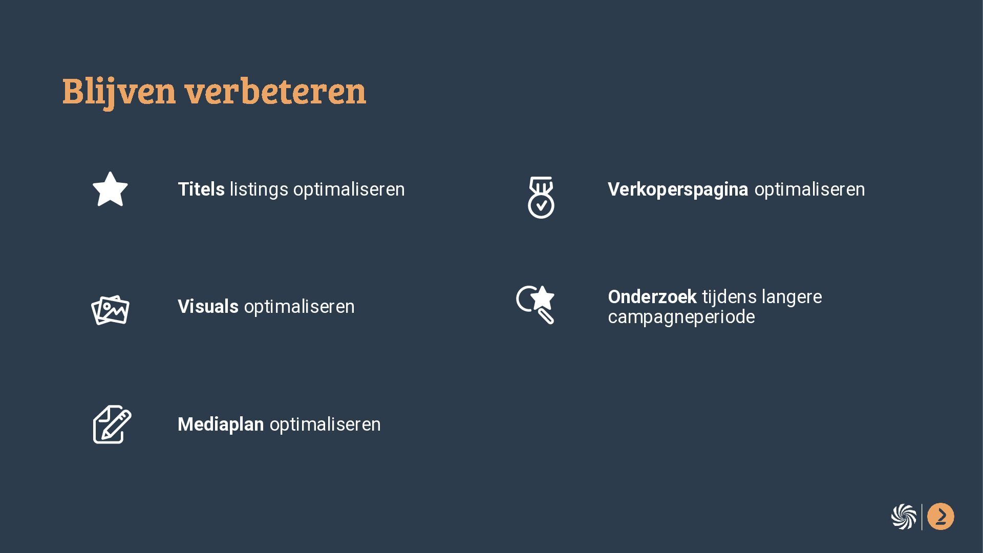 Blijven verbeteren Titels listings optimaliseren Visuals optimaliseren Mediaplan optimaliseren Verkoperspagina