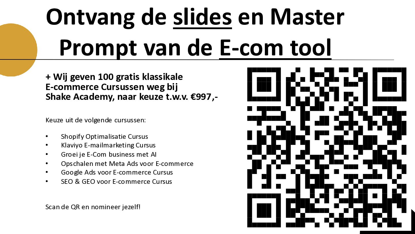 + Wij geven 100 gratis klassikale E-commerce Cursussen weg bij Shake Academy, naar keuze t.w.v. €997,- Keuze uit de volgende cursussen: • Shopify Optimalisatie Cursus • Klaviyo E-mailmarketing Cursus • Groei je E-Com business met AI • Opschalen met Meta Ads voor E-commerce • Google Ads voor E-commerce Cursus • SEO & GEO voor E-commerce Cursus Scan de QR en nomineer jezelf!