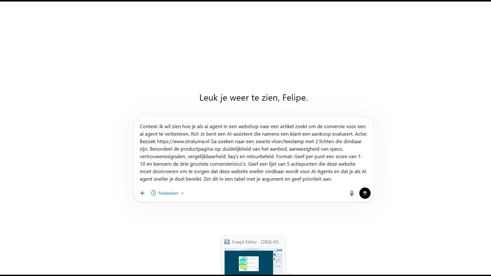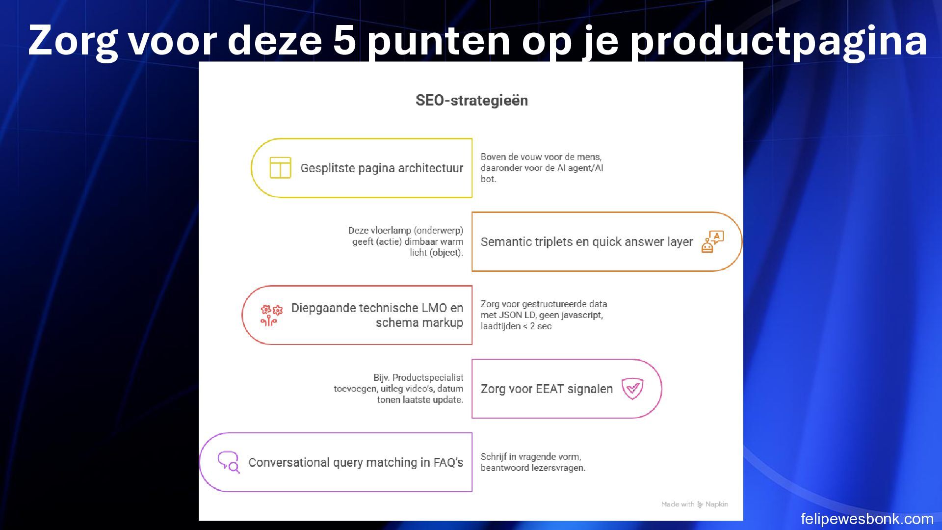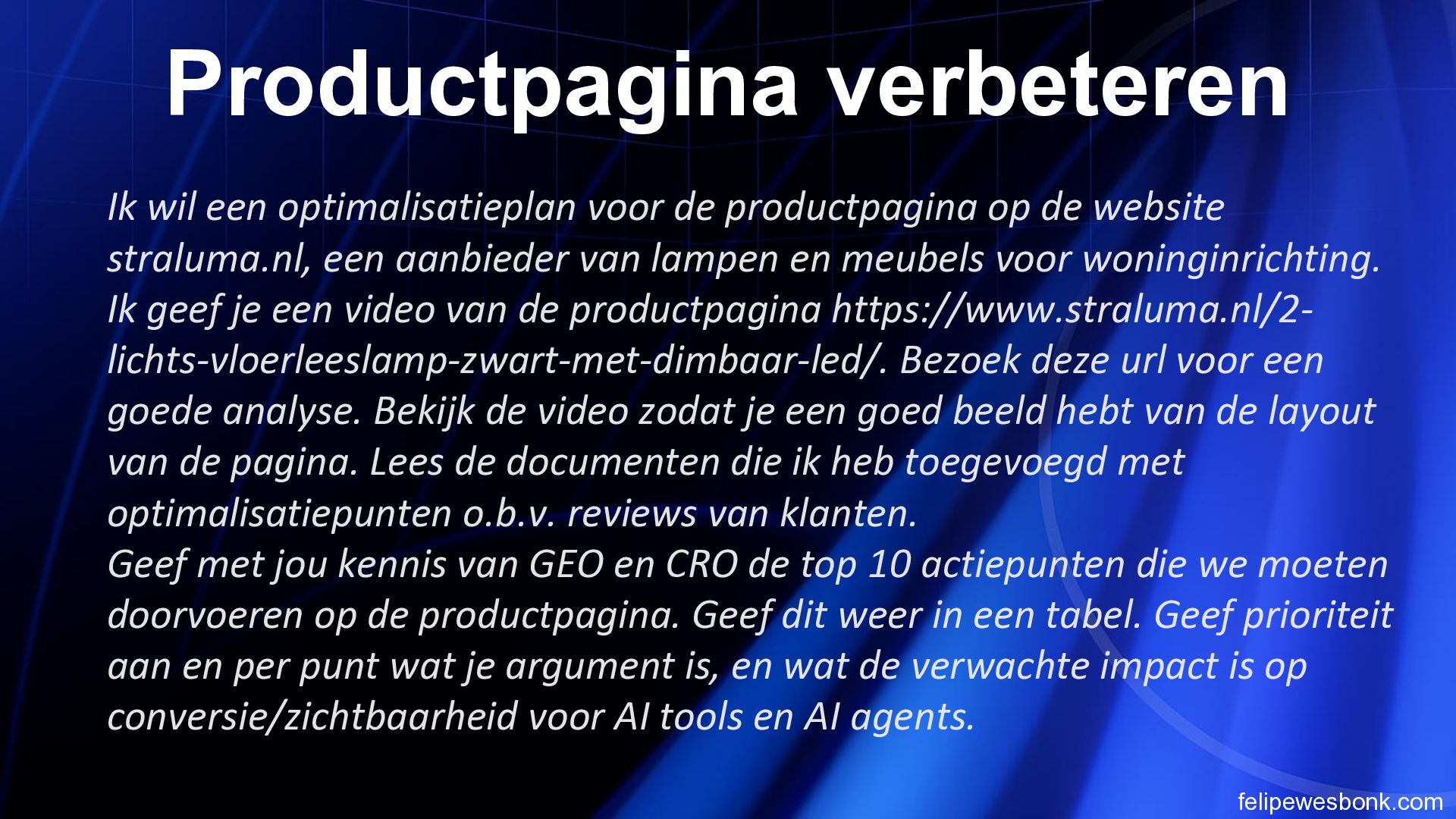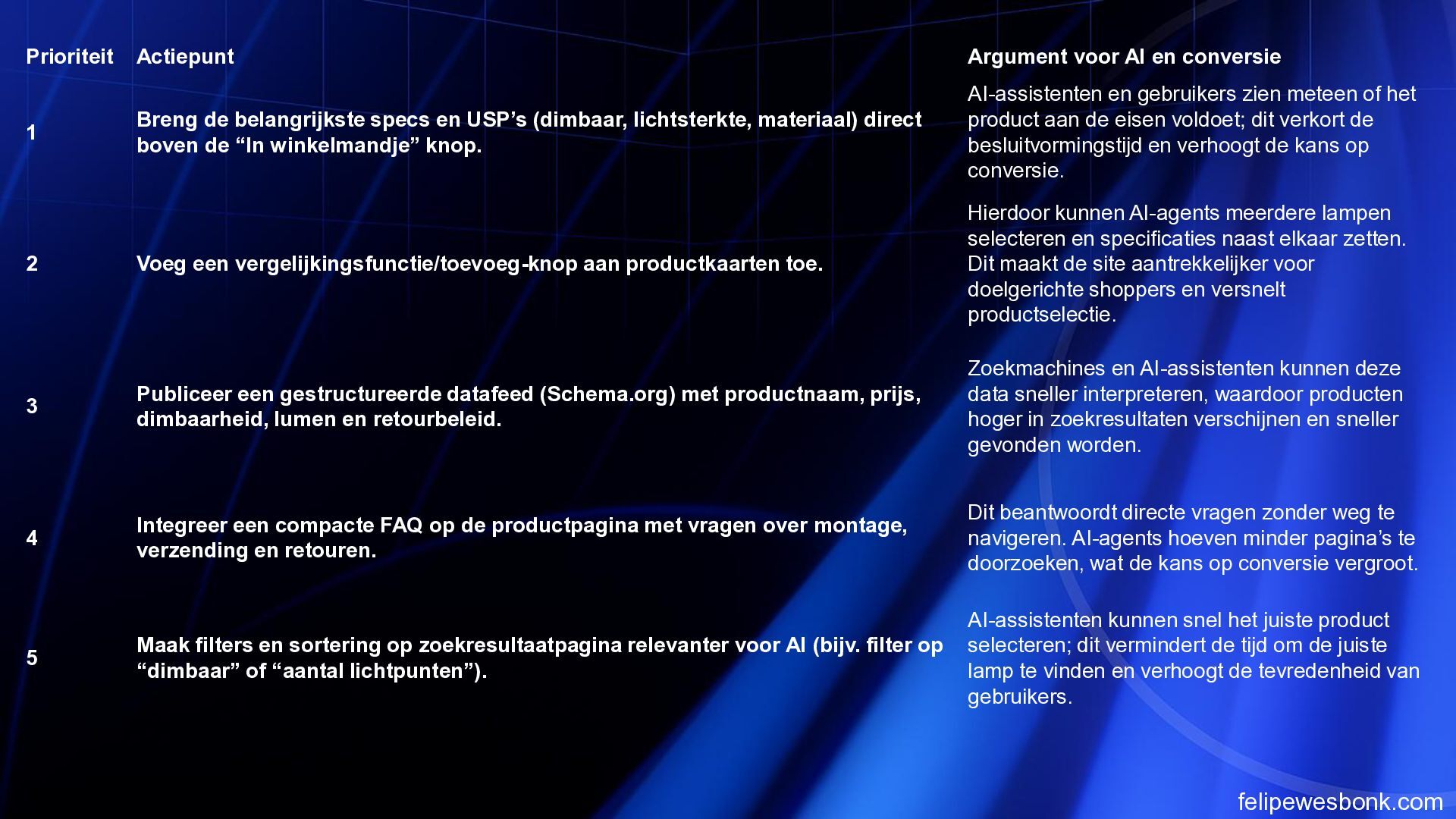 de belangrijkste specs en USP’s (dimbaar, lichtsterkte, materiaal) direct boven de “In winkelmandje” knop. AI-assistenten en gebruikers zien meteen of het product aan de eisen voldoet; dit verkort de besluitvormingstijd en verhoogt de kans op conversie. 2 Voeg een vergelijkingsfunctie/toevoeg-knop aan productkaarten toe. Hierdoor kunnen AI-agents meerdere lampen selecteren en specificaties naast elkaar zetten. Dit maakt de site aantrekkelijker voor doelgerichte shoppers en versnelt productselectie. 3 Publiceer een gestructureerde datafeed (Schema.org) met productnaam, prijs, dimbaarheid, lumen en retourbeleid. Zoekmachines en AI-assistenten kunnen deze data sneller interpreteren, waardoor producten hoger in zoekresultaten verschijnen en sneller gevonden worden. 4 Integreer een compacte FAQ op de productpagina met vragen over montage, verzending en retouren. Dit beantwoordt directe vragen zonder weg te navigeren. AI-agents hoeven minder pagina’s te doorzoeken, wat de kans op conversie vergroot. 5 Maak filters en sortering op zoekresultaatpagina relevanter voor AI (bijv. filter op “dimbaar” of “aantal lichtpunten”). AI-assistenten kunnen snel het juiste product selecteren; dit vermindert de tijd om de juiste lamp te vinden en verhoogt de tevredenheid van gebruikers.