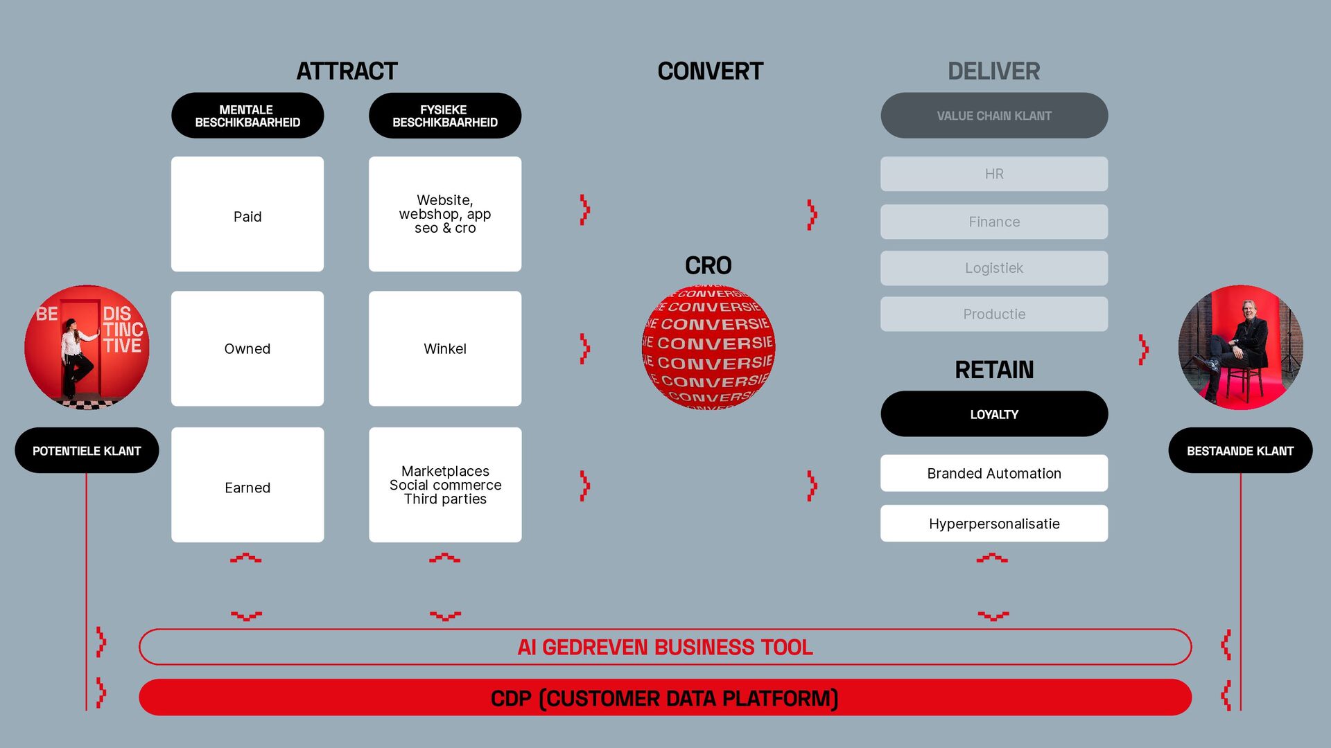 KLANT ATTRACT DELIVER RETAIN POTENTIELE KLANT Owned Earned Website, webshop, app seo & cro Winkel Marketplaces Social commerce Third parties Branded Automation Hyperpersonalisatie HR Finance Logistiek Productie CDP (CUSTOMER DATA PLATFORM) AI GEDREVEN BUSINESS TOOL ) ) ) ) ) ) ) ) ) ) ) ) ) ) ) ) CONVERT CRO