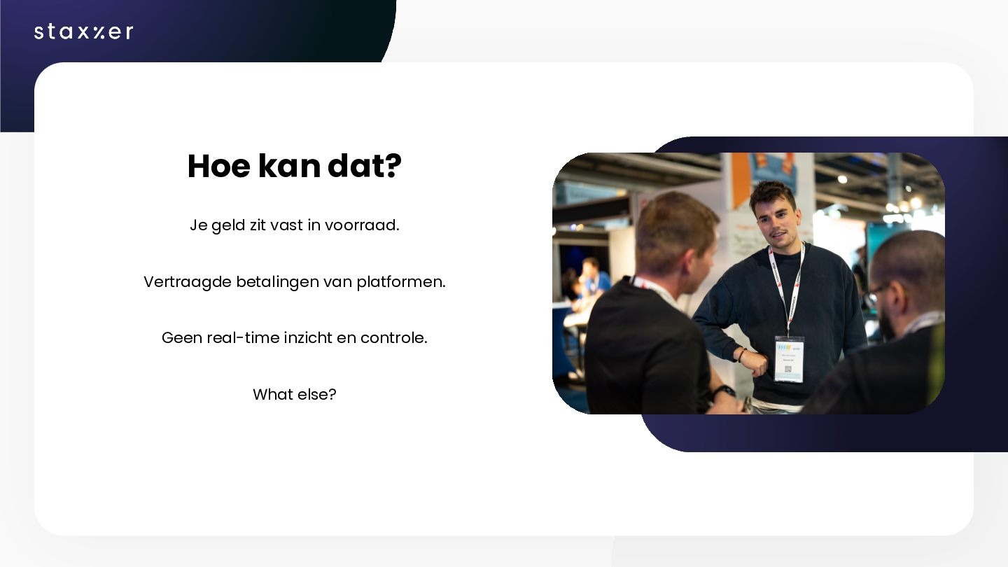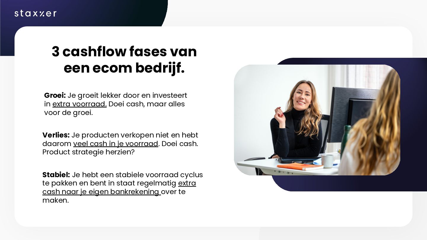 lekker door en investeert in extra voorraad. Doei cash, maar alles voor de groei. Verlies: Je producten verkopen niet en hebt daarom veel cash in je voorraad. Doei cash. Product strategie herzien? Stabiel: Je hebt een stabiele voorraad cyclus te pakken en bent in staat regelmatig extra cash naar je eigen bankrekening over te maken.