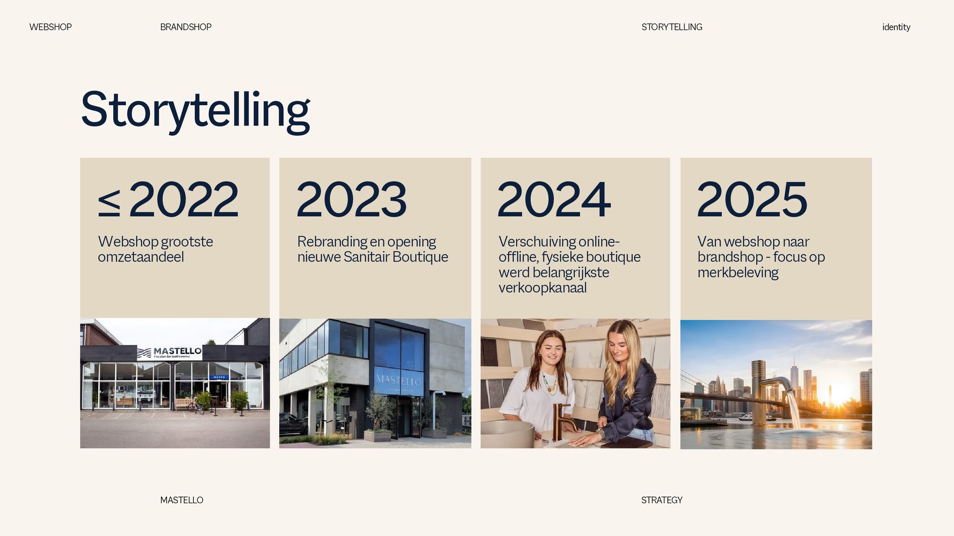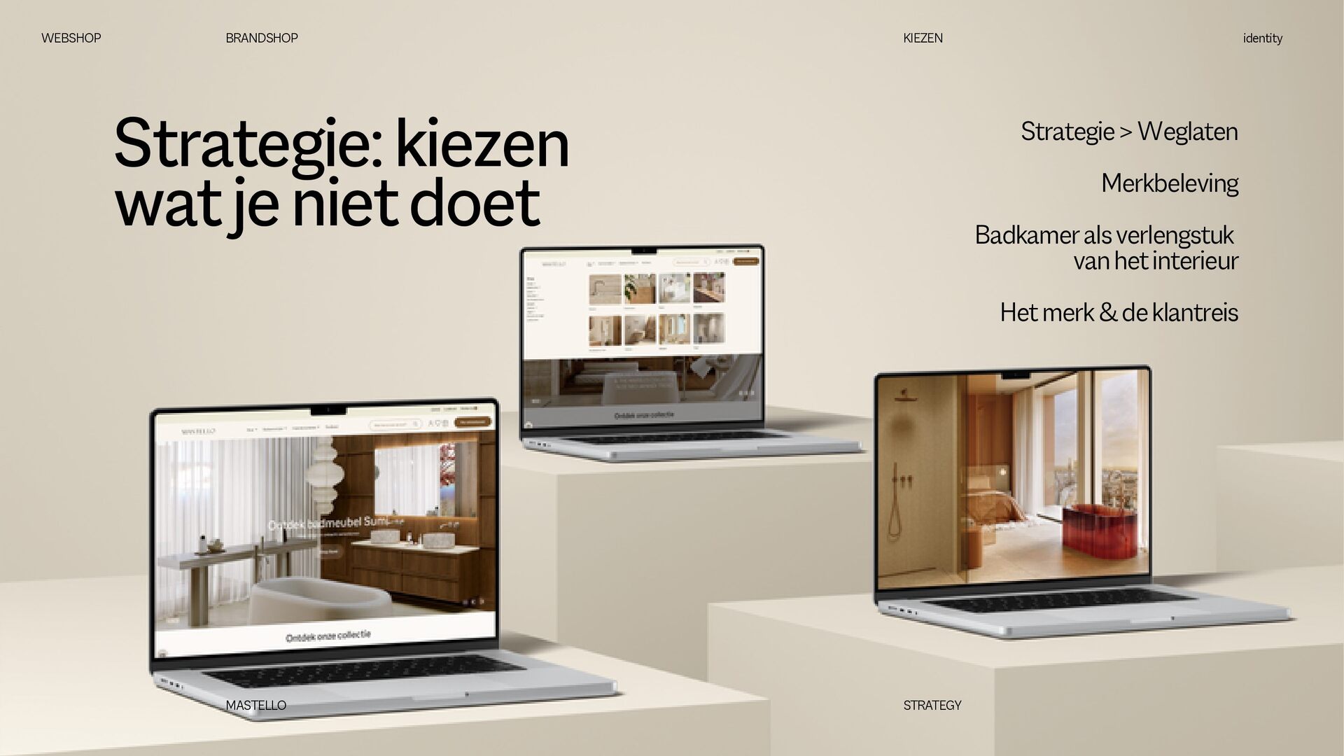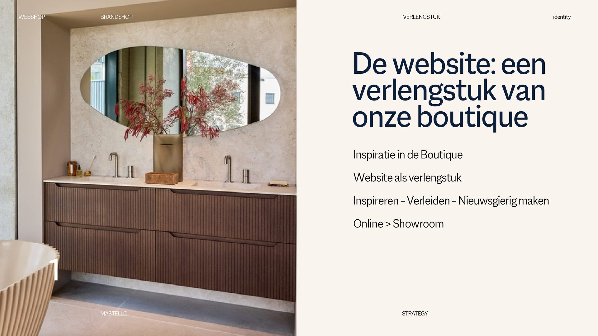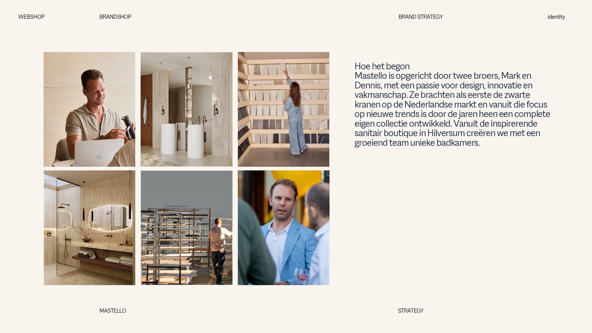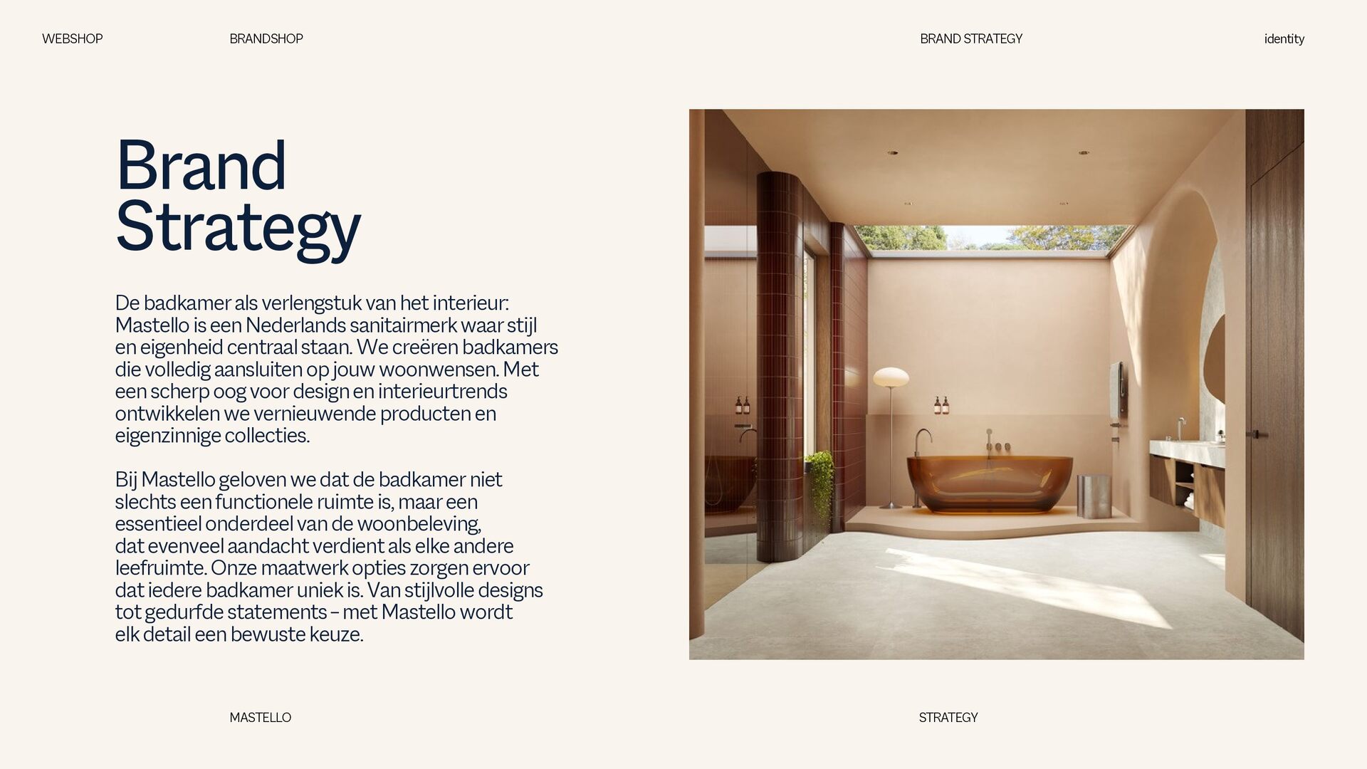 is een Nederlands sanitairmerk waar stijl en eigenheid centraal staan. We creëren badkamers die volledig aansluiten op jouw woonwensen. Met een scherp oog voor design en interieurtrends ontwikkelen we vernieuwende producten en eigenzinnige collecties. Bij Mastello geloven we dat de badkamer niet slechts een functionele ruimte is, maar een essentieel onderdeel van de woonbeleving, dat evenveel aandacht verdient als elke andere leefruimte. Onze maatwerk opties zorgen ervoor dat iedere badkamer uniek is. Van stijlvolle designs tot gedurfde statements – met Mastello wordt elk detail een bewuste keuze. WEBSHOP BRANDSHOP BRAND STRATEGY identity MASTELLO STRATEGY