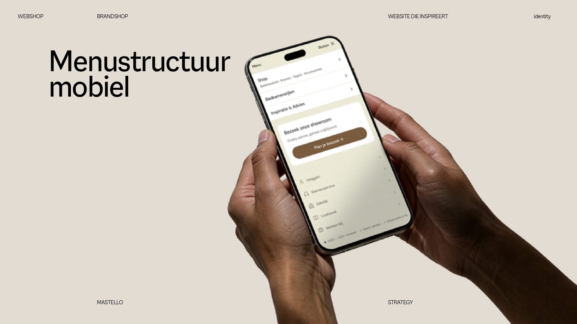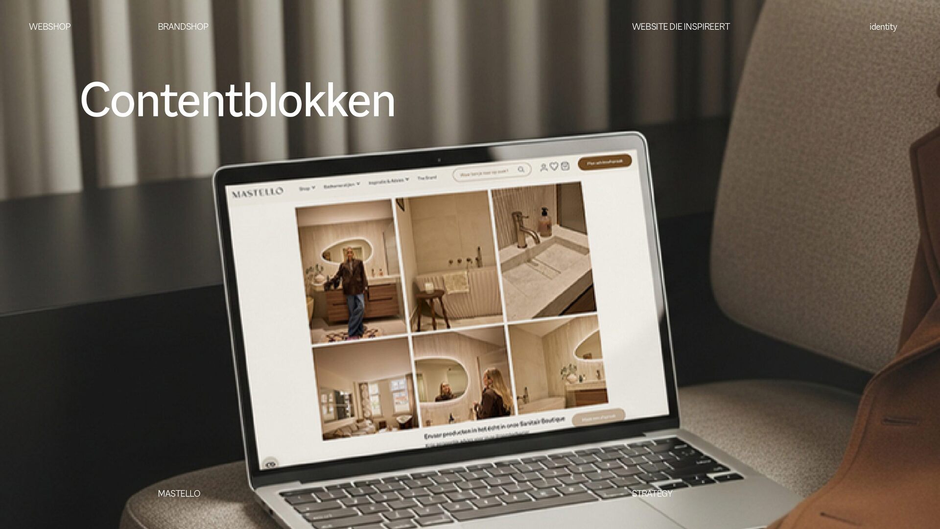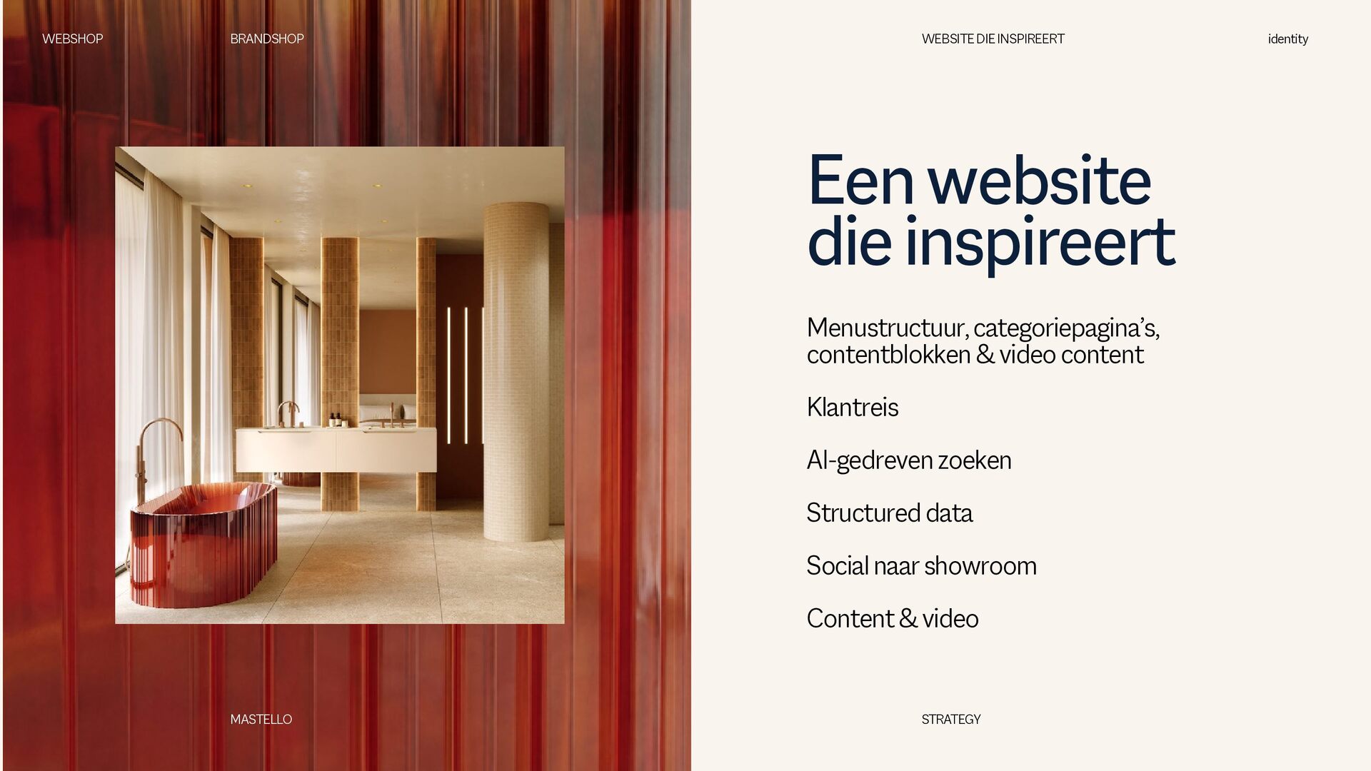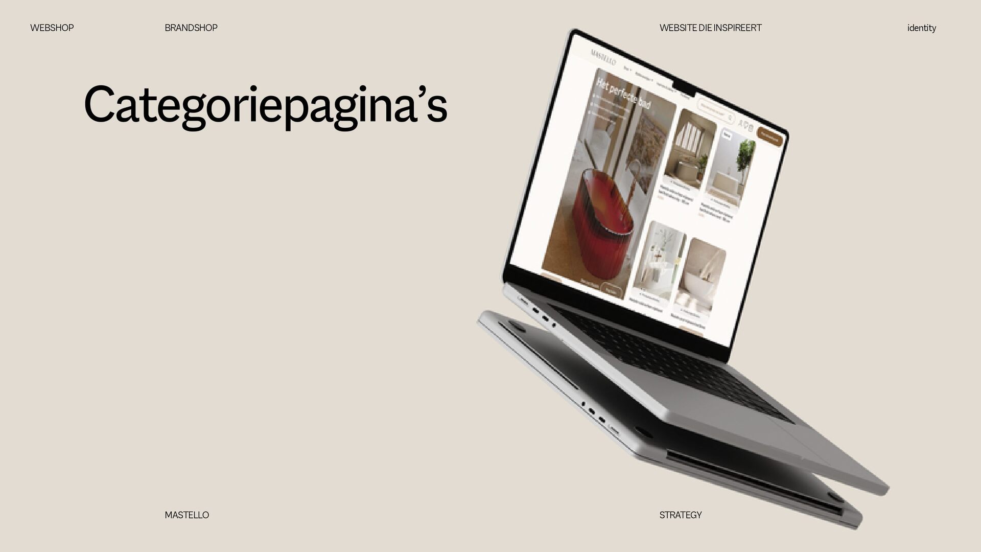 is een Nederlands sanitairmerk waar stijl en eigenheid centraal staan. We creëren badkamers die volledig aansluiten op jouw woonwensen. Met een scherp oog voor design en interieurtrends ontwikkelen we vernieuwende producten en eigenzinnige collecties. Bij Mastello geloven we dat de badkamer niet slechts een functionele ruimte is, maar een essentieel onderdeel van de woonbeleving, dat evenveel aandacht verdient als elke andere leefruimte. Onze maatwerk opties zorgen ervoor dat iedere badkamer uniek is. Van stijlvolle designs tot gedurfde statements – met Mastello wordt elk detail een bewuste keuze. WEBSHOP BRANDSHOP BRAND STRATEGY identity MASTELLO STRATEGY