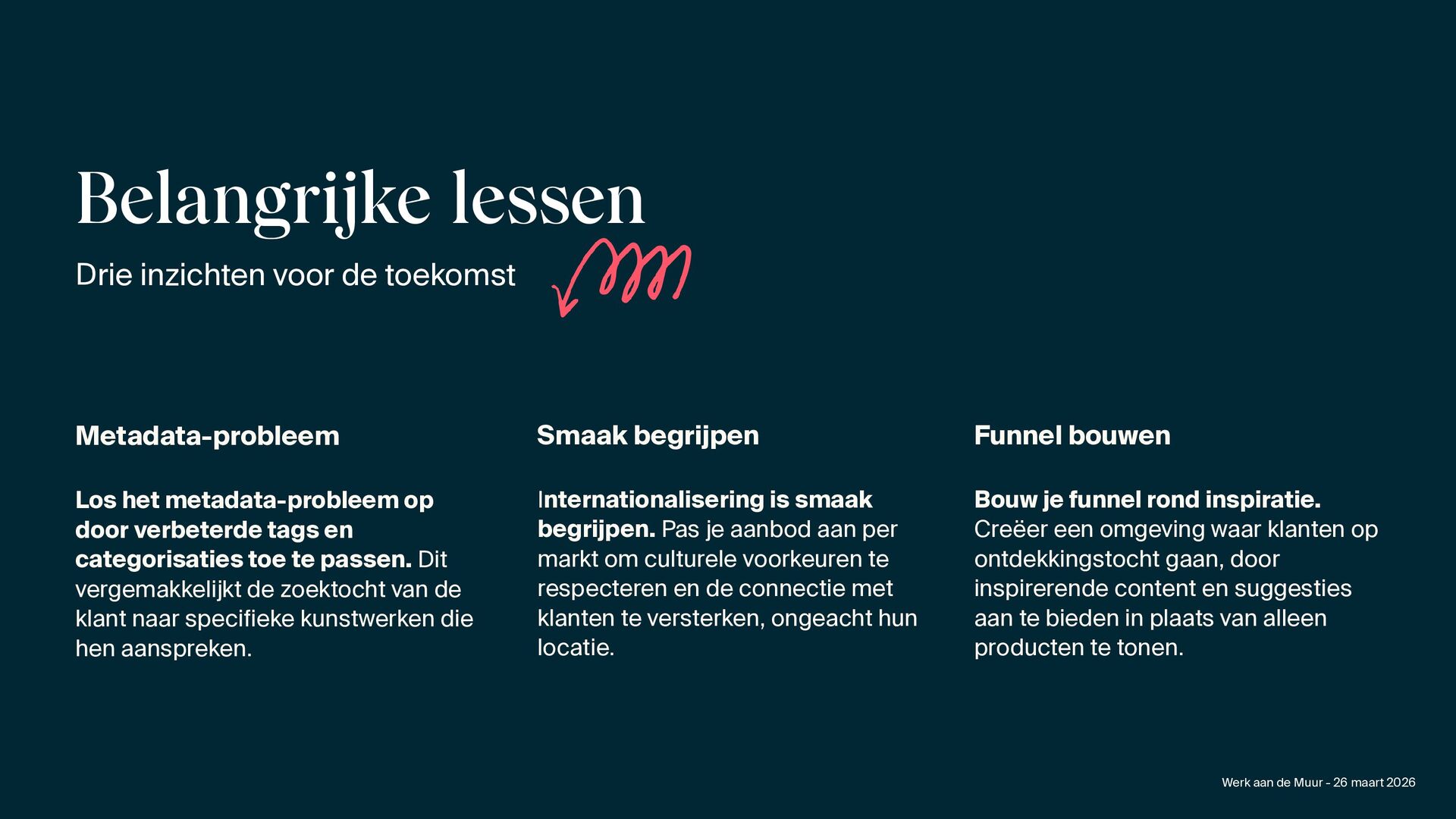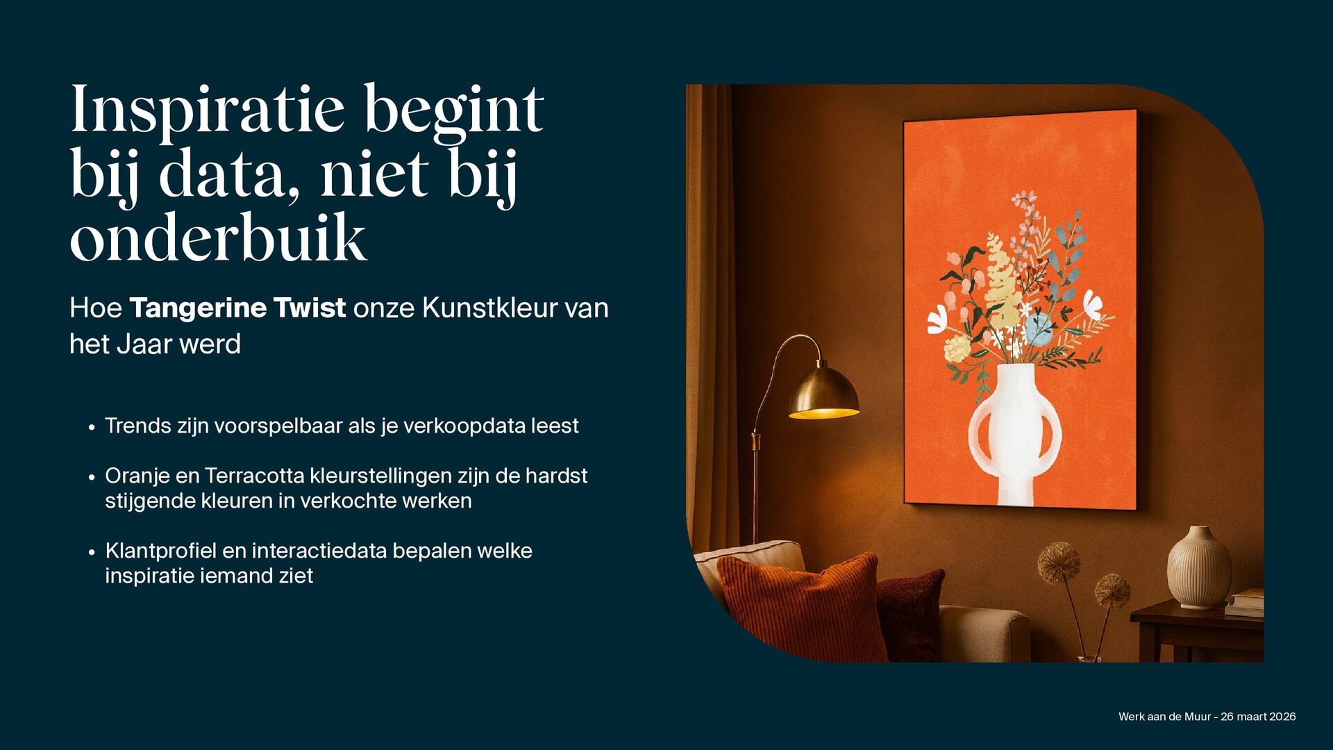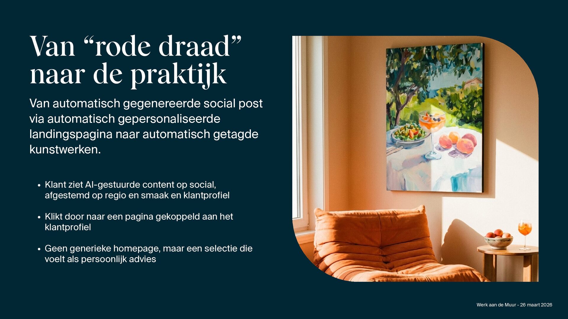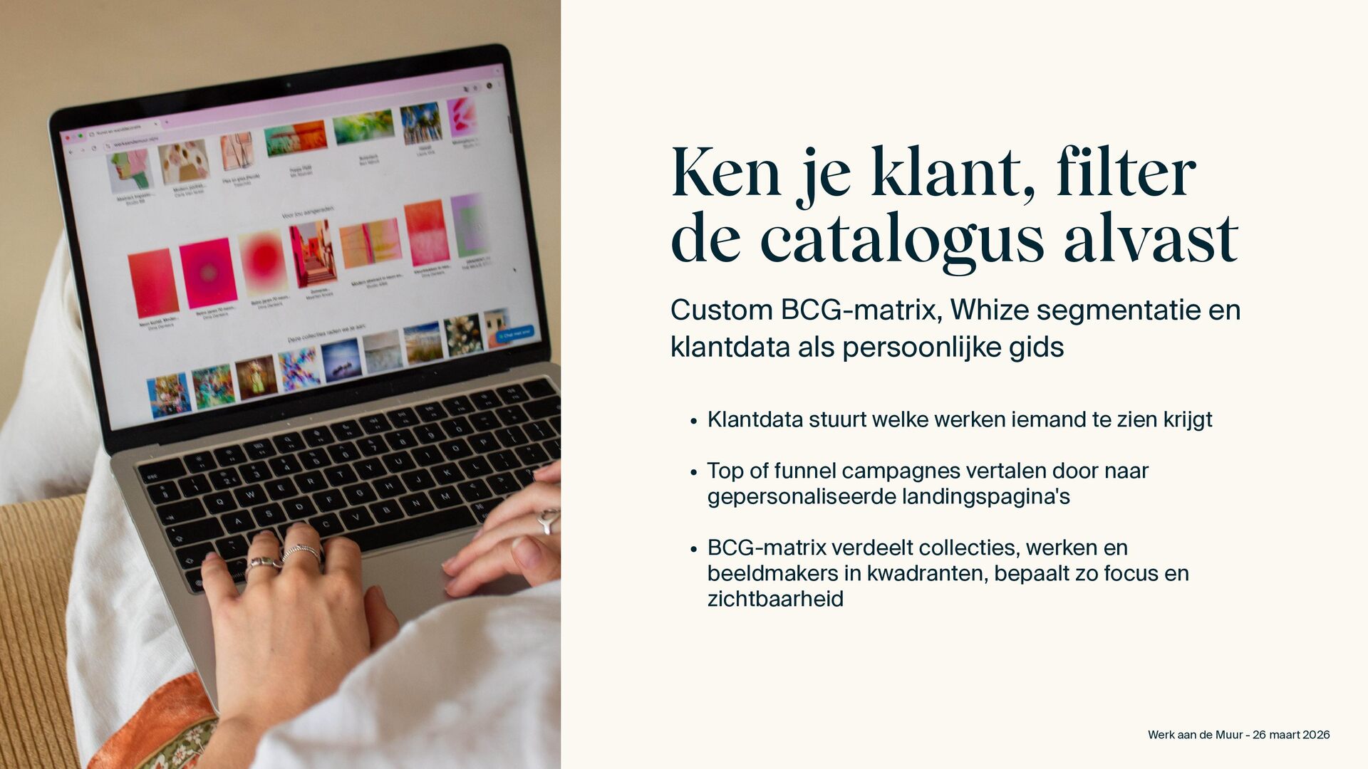 funnel campagnes vertalen door naar gepersonaliseerde landingspagina's BCG-matrix verdeelt collecties, werken en beeldmakers in kwadranten, bepaalt zo focus en zichtbaarheid Custom BCG-matrix, Whize segmentatie en klantdata als persoonlijke gids Ken je klant, filter de catalogus alvast Werk aan de Muur - 26 maart 2026