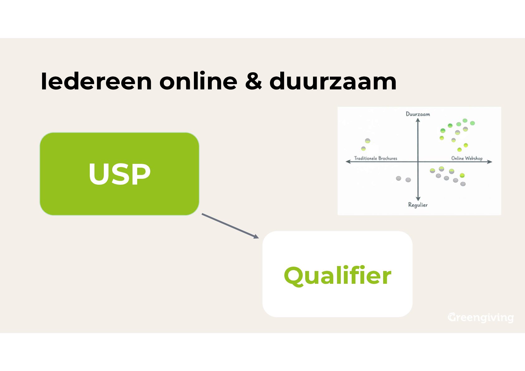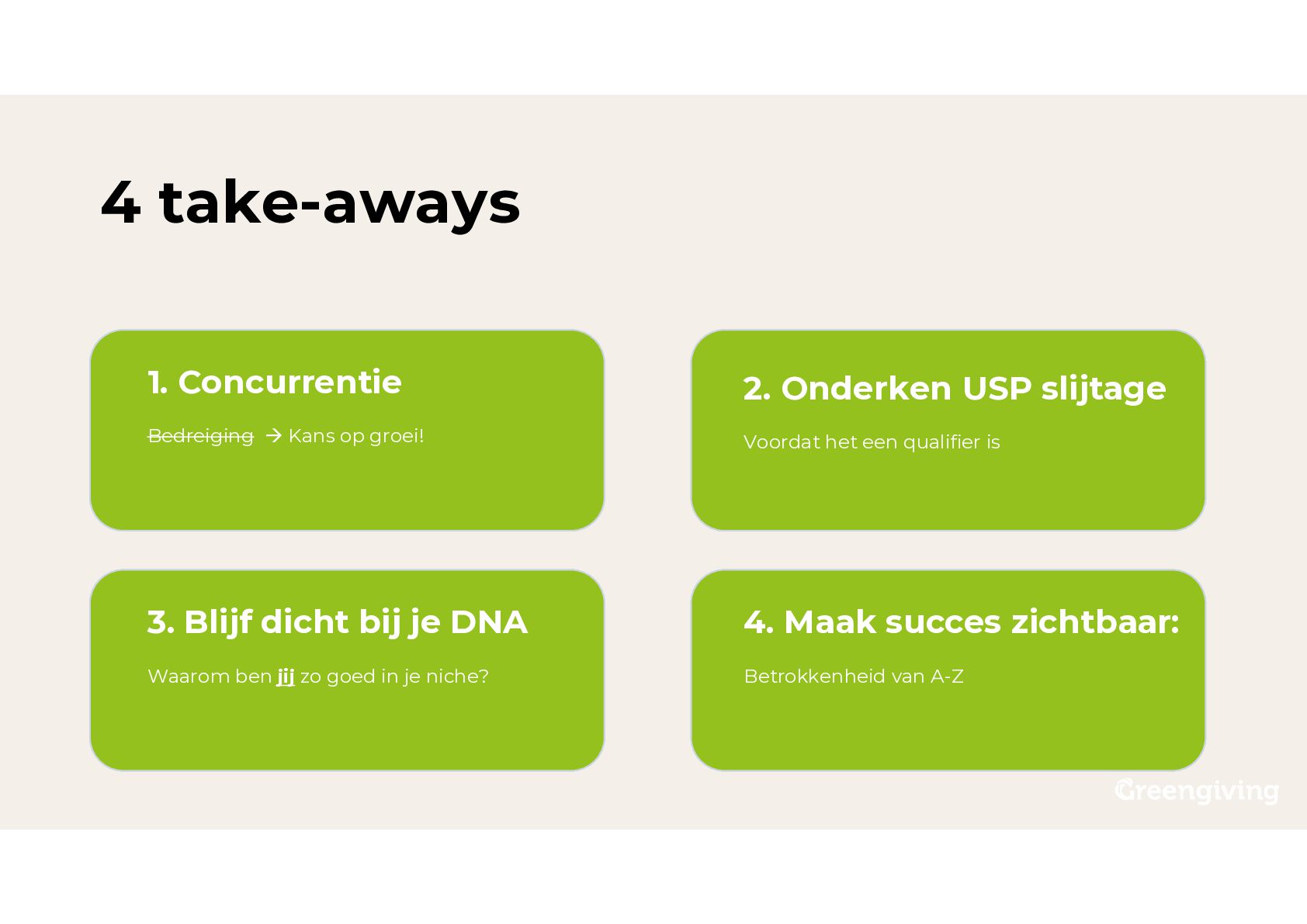 Maak succes zichtbaar: Betrokkenheid van A-Z 2. Onderken USP slijtage Voordat het een qualifier is 3. Blijf dicht bij je DNA Waarom ben jij zo goed in je niche?