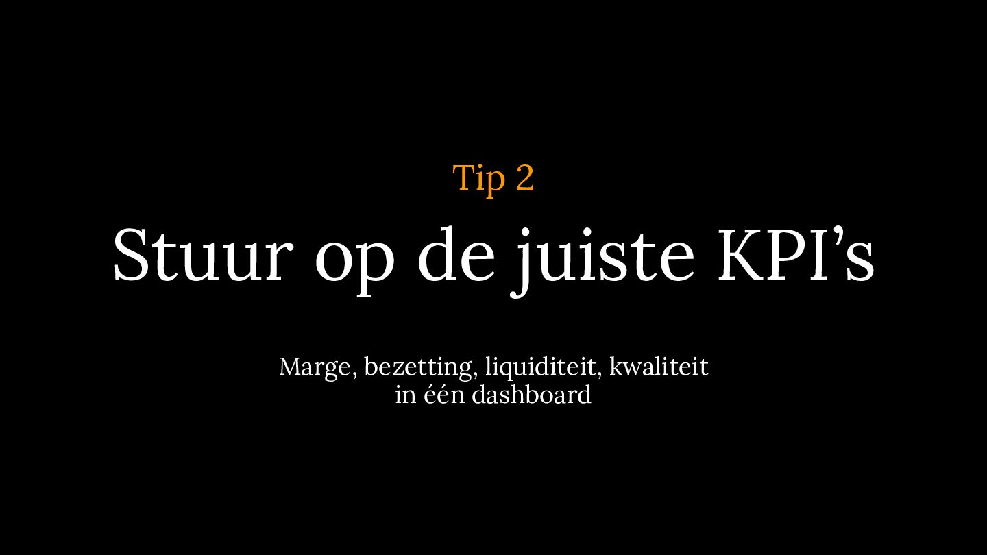 Tip 2 Stuur op de juiste KPI’s Marge, bezetting, liquiditeit,