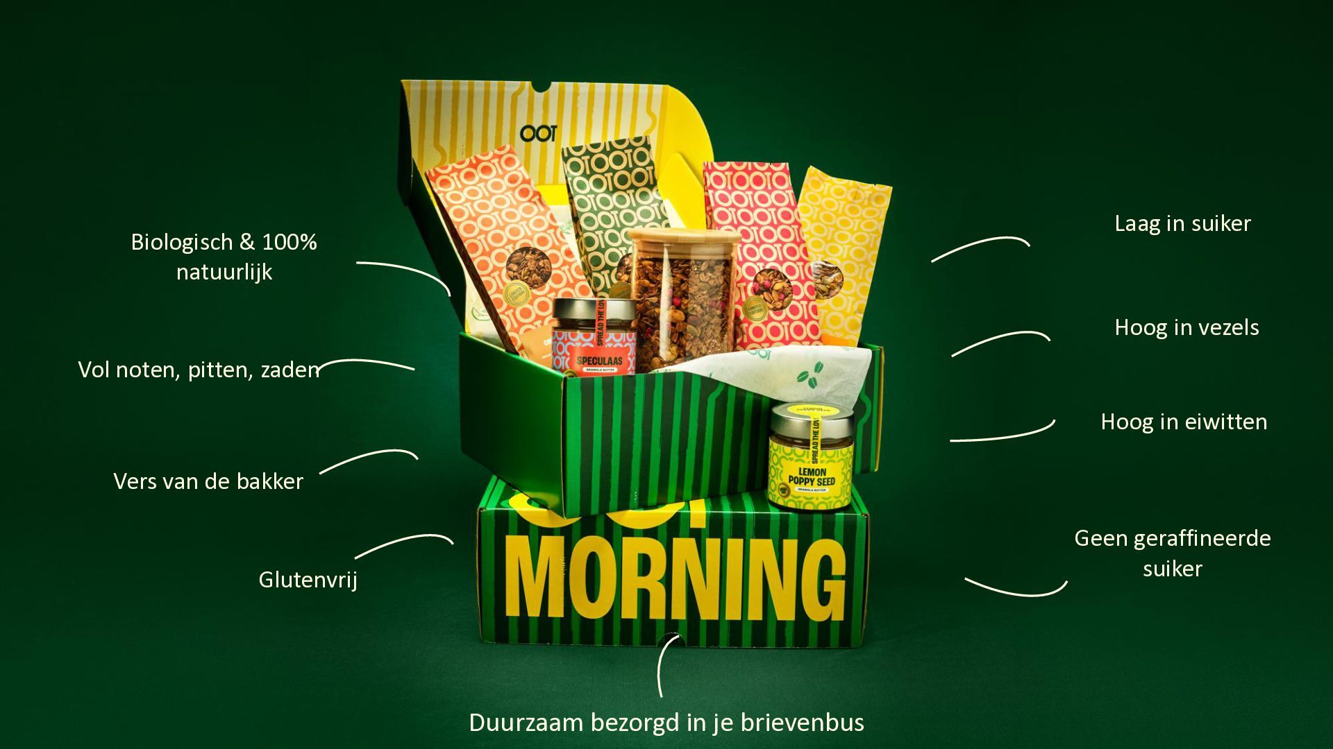 in suiker Hoog in vezels Hoog in eiwitten Geen geraffineerde suiker Duurzaam bezorgd in je brievenbus Vol noten, pitten, zaden