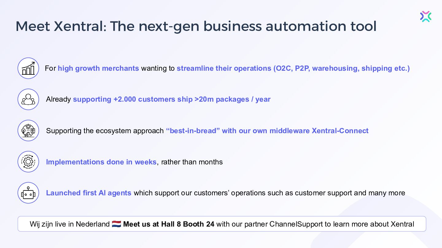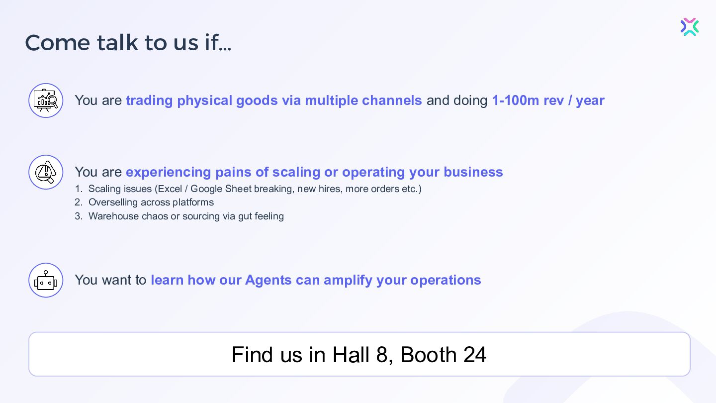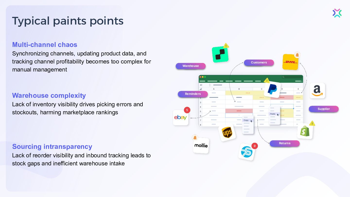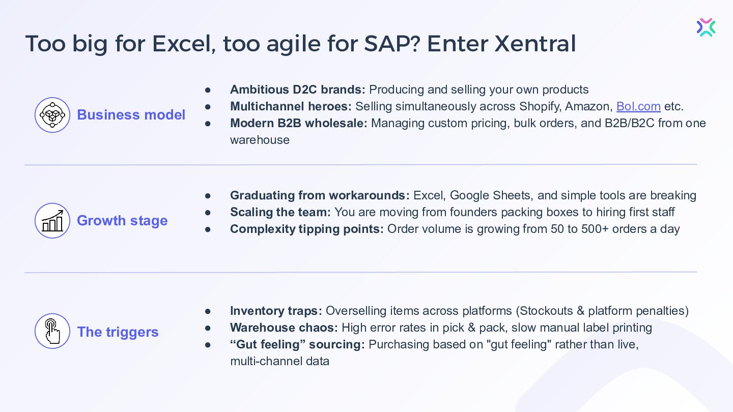 • Ambitious D2C brands: Producing and selling your own products • Multichannel heroes: Selling simultaneously across Shopify, Amazon, Bol.com etc. • Modern B2B wholesale: Managing custom pricing, bulk orders, and B2B/B2C from one warehouse • Graduating from workarounds: Excel, Google Sheets, and simple tools are breaking • Scaling the team: You are moving from founders packing boxes to hiring first staff • Complexity tipping points: Order volume is growing from 50 to 500+ orders a day Growth stage • Inventory traps: Overselling items across platforms (Stockouts & platform penalties) • Warehouse chaos: High error rates in pick & pack, slow manual label printing • “Gut feeling” sourcing: Purchasing based on "gut feeling" rather than live, multi-channel data The triggers Business model