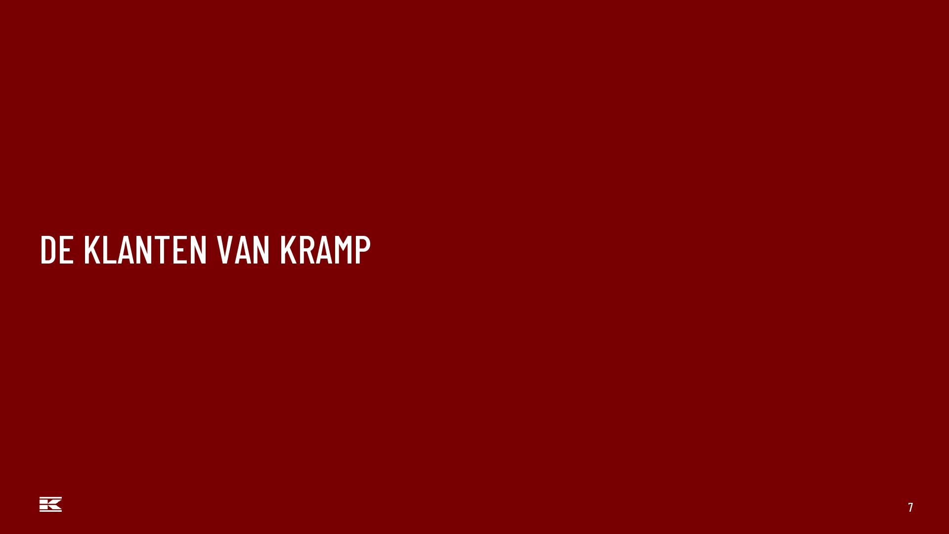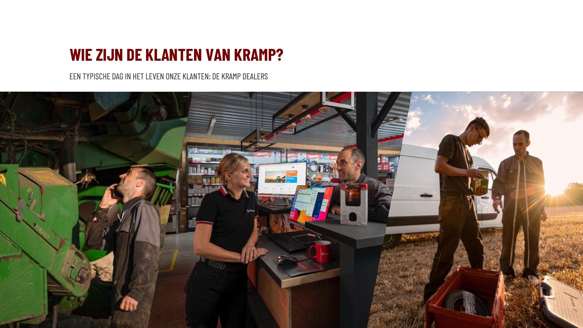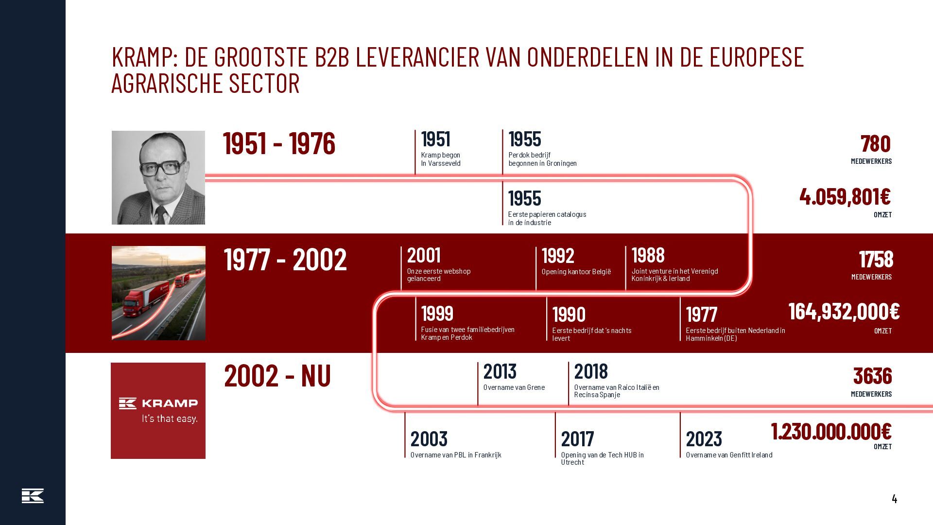 AGRARISCHE SECTOR 1951 Kramp begon In Varsseveld 1951 - 1976 1977 - 2002 2002 - NU 1955 Eerste papieren catalogus in de industrie 1955 Perdok bedrijf begonnen in Groningen 2001 Onze eerste webshop gelanceerd 1977 Eerste bedrijf buiten Nederland in Hamminkeln (DE) 1988 Joint venture in het Verenigd Koninkrijk & Ierland 2013 Overname van Grene 2018 Overnamevan Raico Italiëen Recinsa Spanje 2003 Overname van PBL in Frankrijk 2017 Opening van de Tech HUB in Utrecht 2023 Overnamevan GenfittIreland 1990 Eerstebedrijfdat ‘s nachts levert 1992 Opening kantoor België 1999 Fusie van twee familiebedrijven Kramp en Perdok XXX MEDEWERKERS XXX€ OMZET MEDE MEDEWERKERS 1.230.000.000€ OMZET XXX MEDEWERKERS XXX€ OMZET 4 780 4.059,801€ 1758 164,932,000€ 3636