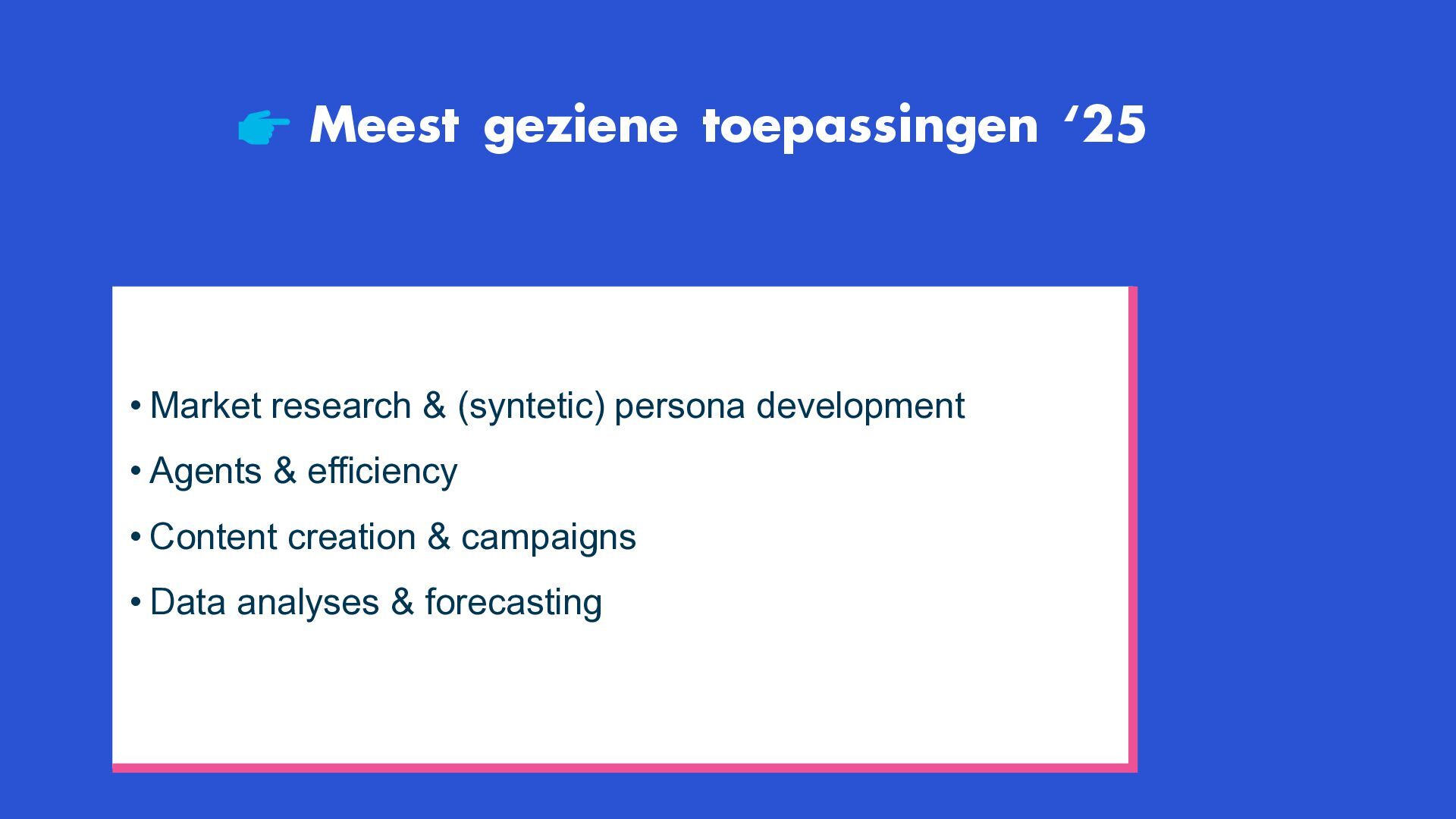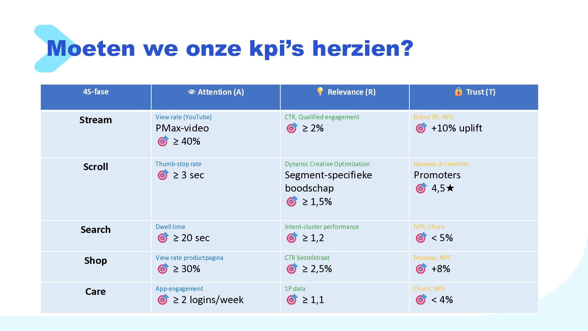 Trust (T) Stream View rate (YouTube) PMax-video ≥ 40% CTR, Qualified engagement ≥ 2% Brand lift, NPS +10% uplift Scroll Thumb-stop rate ≥ 3 sec Dynamic Creative Optimization Segment-specifieke boodschap ≥ 1,5% Reviews in creatives Promoters 4,5★ Search Dwell time ≥ 20 sec Intent-cluster performance ≥ 1,2 NPS, Churn < 5% Shop View rate productpagina ≥ 30% CTR bestelstraat ≥ 2,5% Reviews, NPS +8% Care App-engagement ≥ 2 logins/week 1P data ≥ 1,1 Churn, NPS < 4%