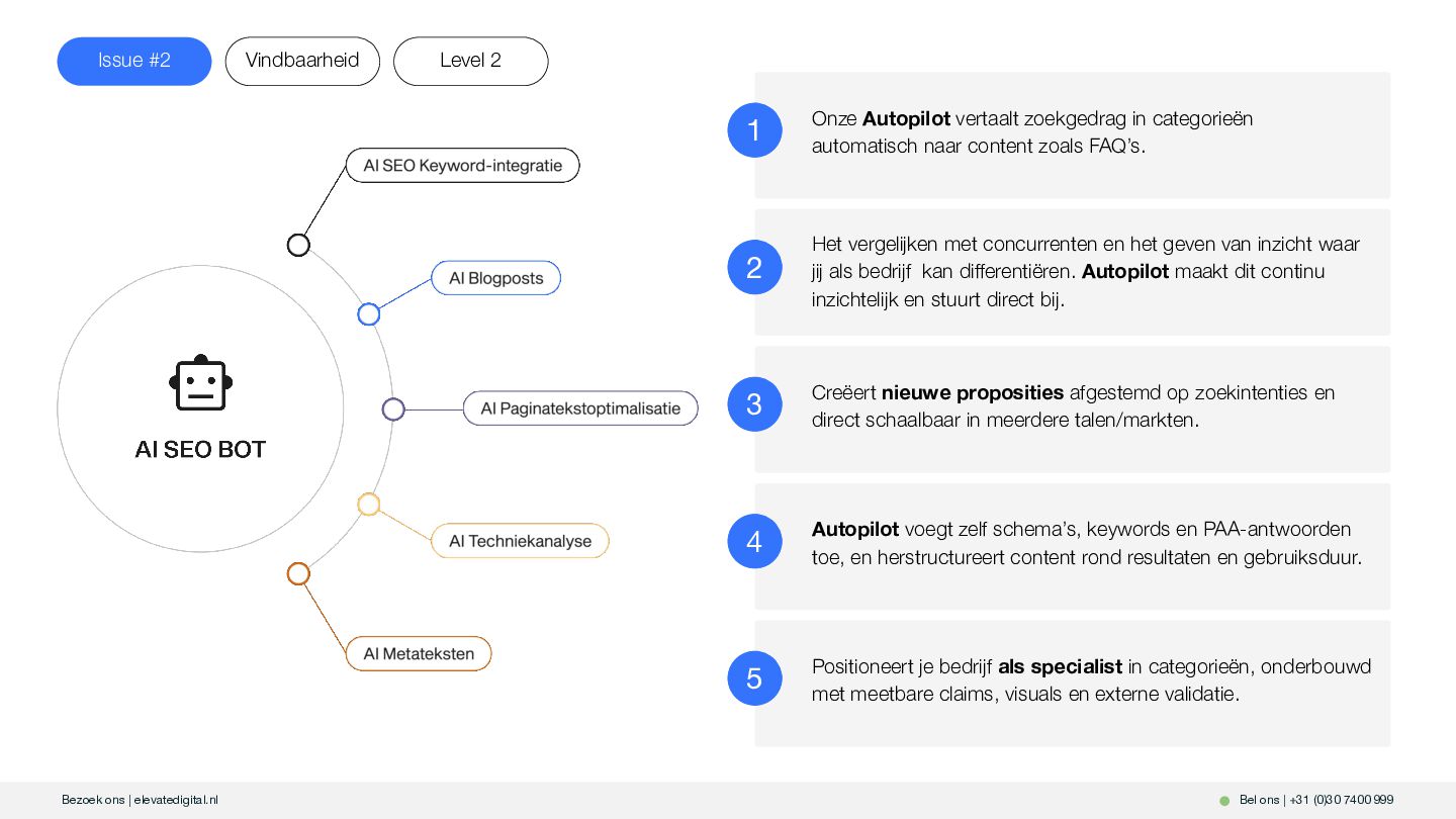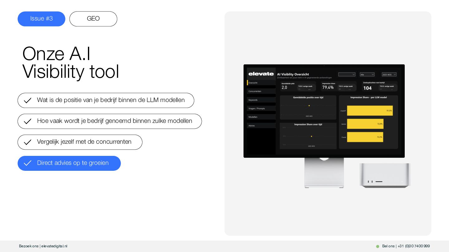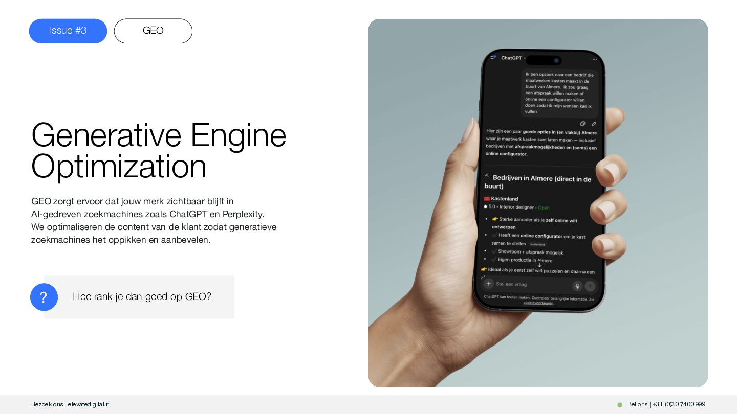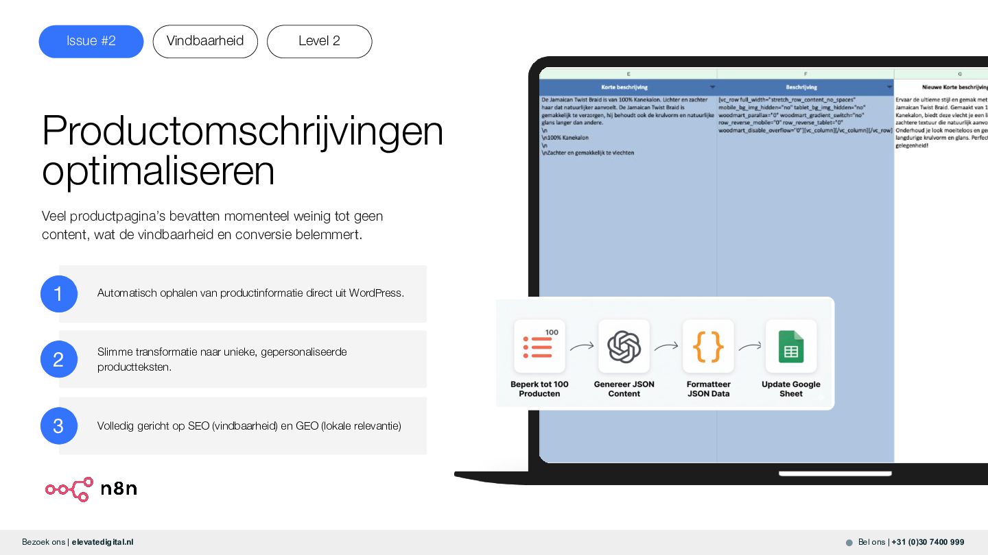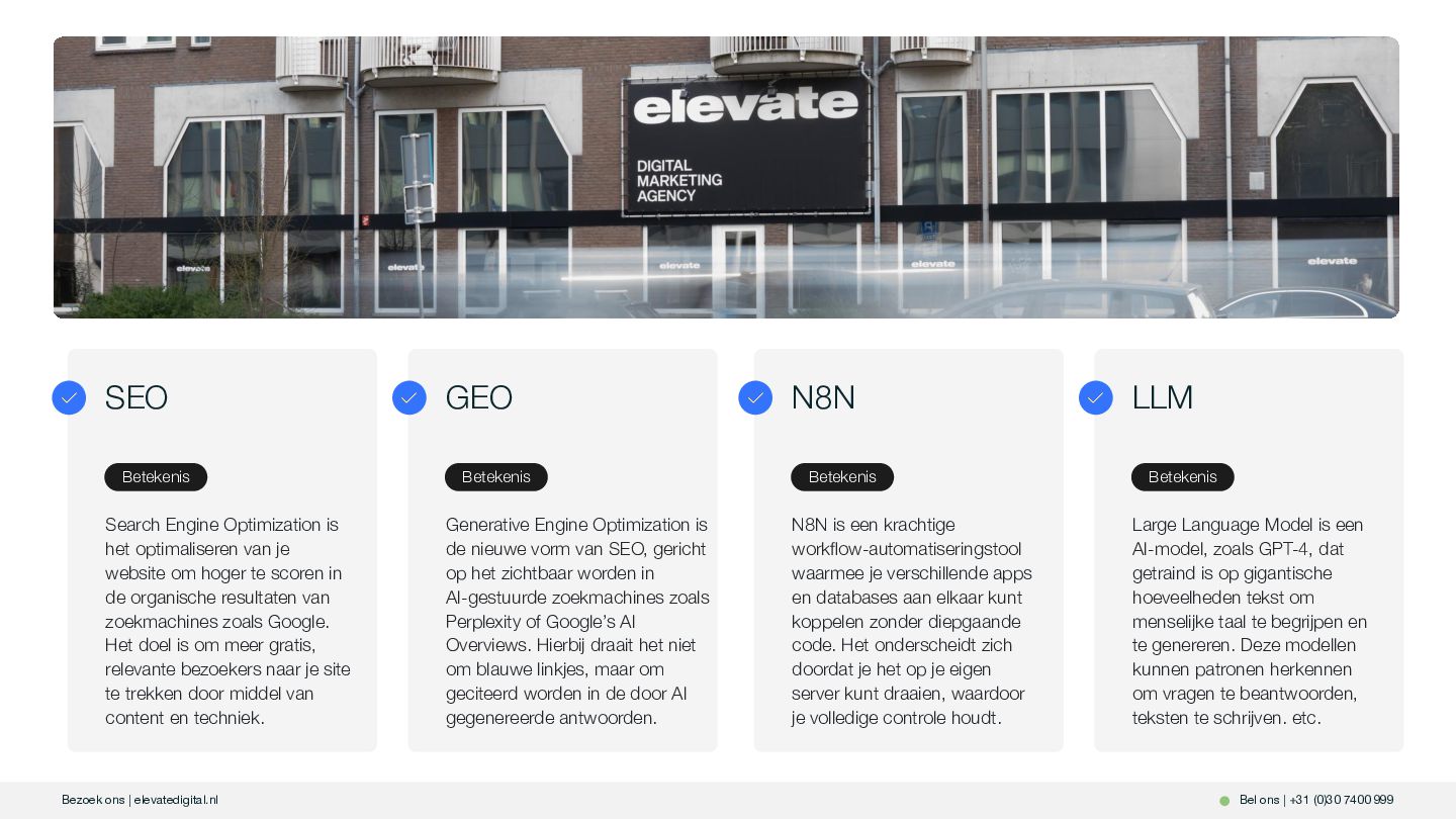 om hoger te scoren in de organische resultaten van zoekmachines zoals Google. Het doel is om meer gratis, relevante bezoekers naar je site te trekken door middel van content en techniek. Betekenis GEO Generative Engine Optimization is de nieuwe vorm van SEO, gericht op het zichtbaar worden in AI-gestuurde zoekmachines zoals Perplexity of Google’s AI Overviews. Hierbij draait het niet om blauwe linkjes, maar om geciteerd worden in de door AI gegenereerde antwoorden. Betekenis N8N N8N is een krachtige workflow-automatiseringstool waarmee je verschillende apps en databases aan elkaar kunt koppelen zonder diepgaande code. Het onderscheidt zich doordat je het op je eigen server kunt draaien, waardoor je volledige controle houdt. Betekenis LLM Large Language Model is een AI-model, zoals GPT-4, dat getraind is op gigantische hoeveelheden tekst om menselijke taal te begrijpen en te genereren. Deze modellen kunnen patronen herkennen om vragen te beantwoorden, teksten te schrijven. etc. Betekenis Bezoek ons | elevatedigital.nl Bel ons | +31 (0)30 7400 999