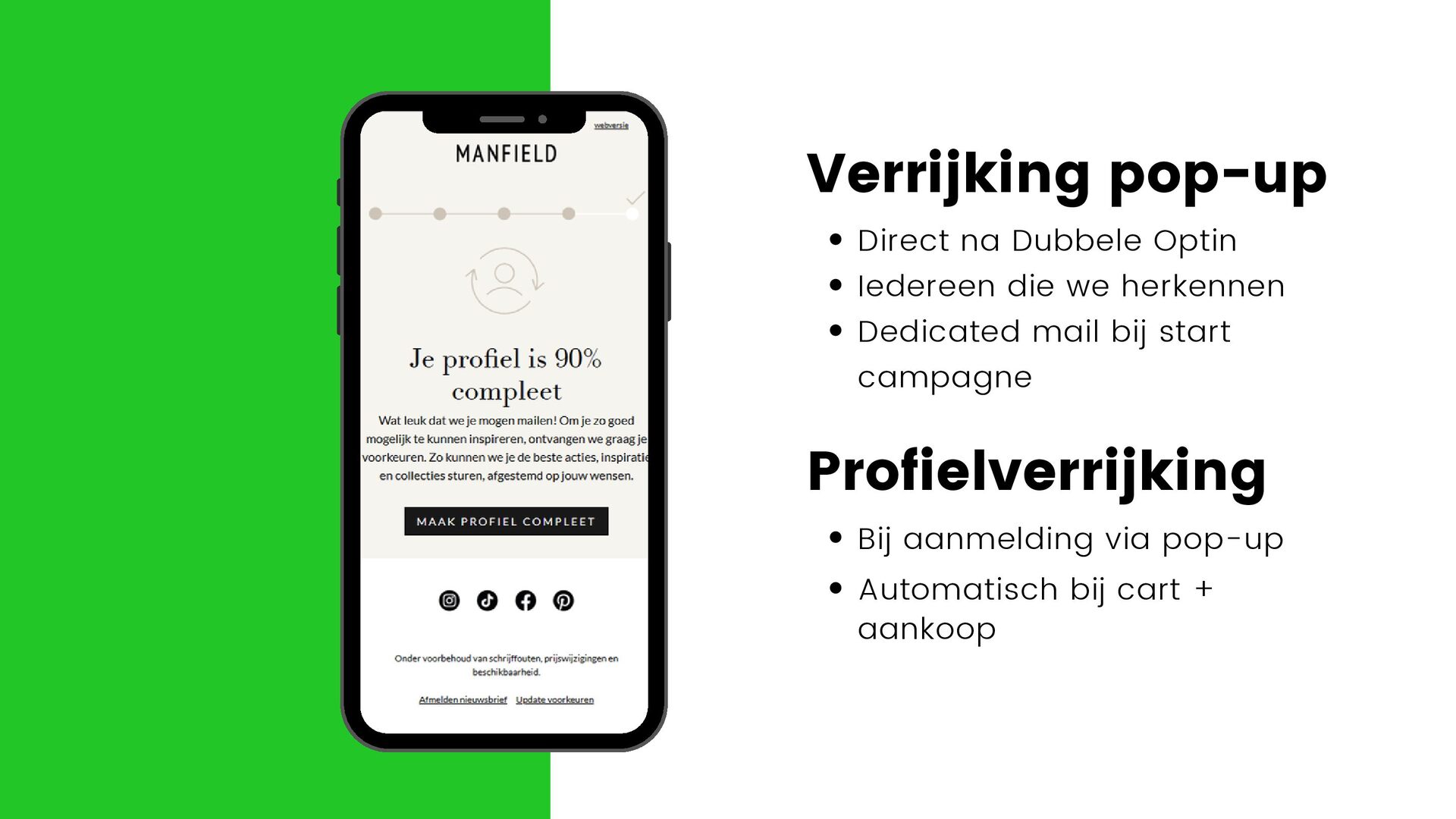 Dedicated mail bij start campagne Profielverrijking Bij aanmelding via pop-up Automatisch bij cart + aankoop
