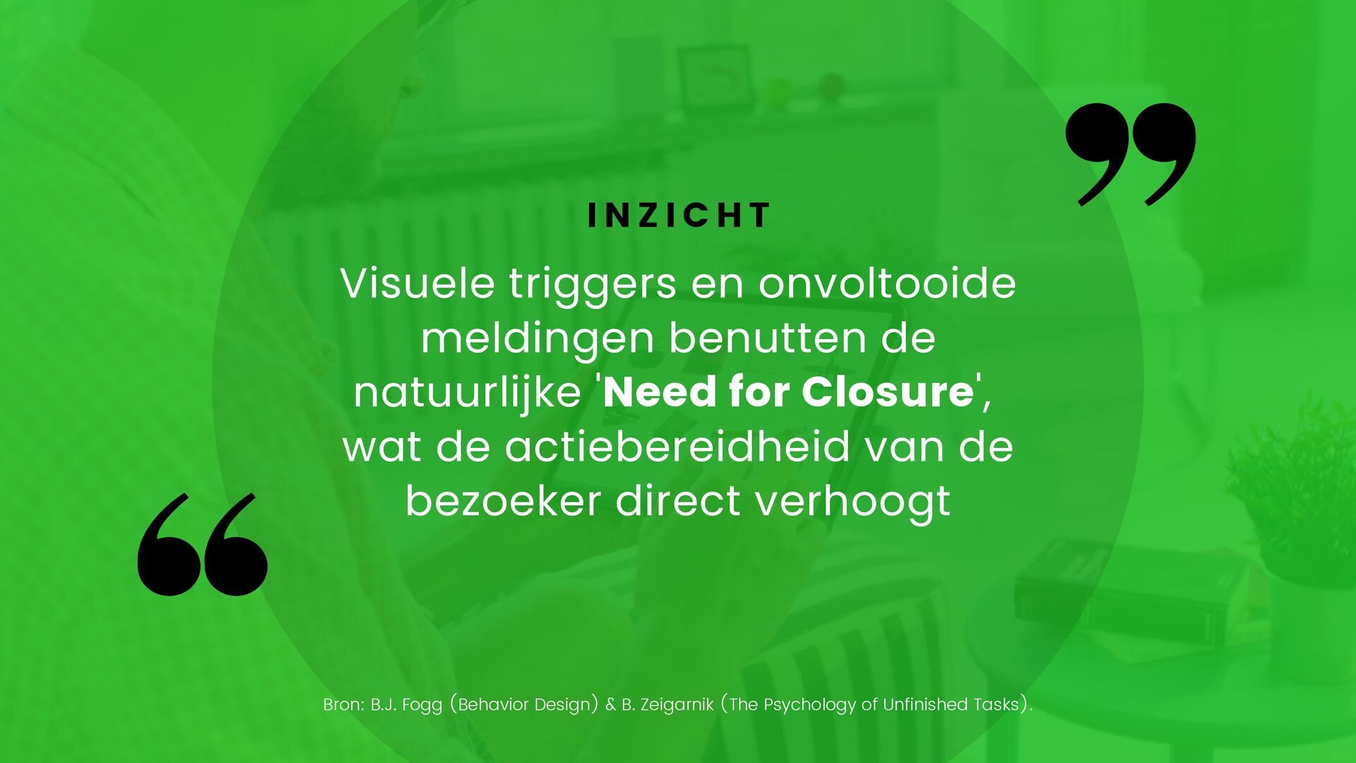 Closure', wat de actiebereidheid van de bezoeker direct verhoogt I N Z I C H T Bron: B.J. Fogg (Behavior Design) & B. Zeigarnik (The Psychology of Unfinished Tasks).