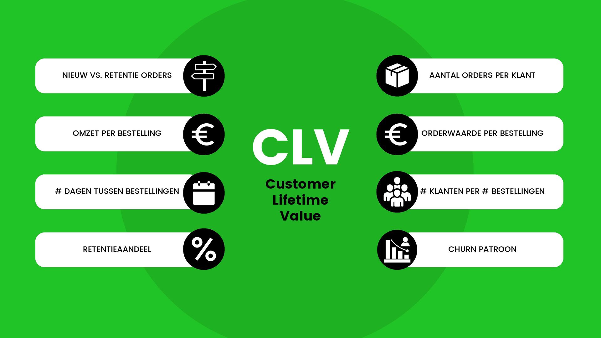 OMZET PER BESTELLING AANTAL ORDERS PER KLANT NIEUW VS. RETENTIE ORDERS RETENTIEAANDEEL # DAGEN TUSSEN BESTELLINGEN CLV Customer Lifetime Value