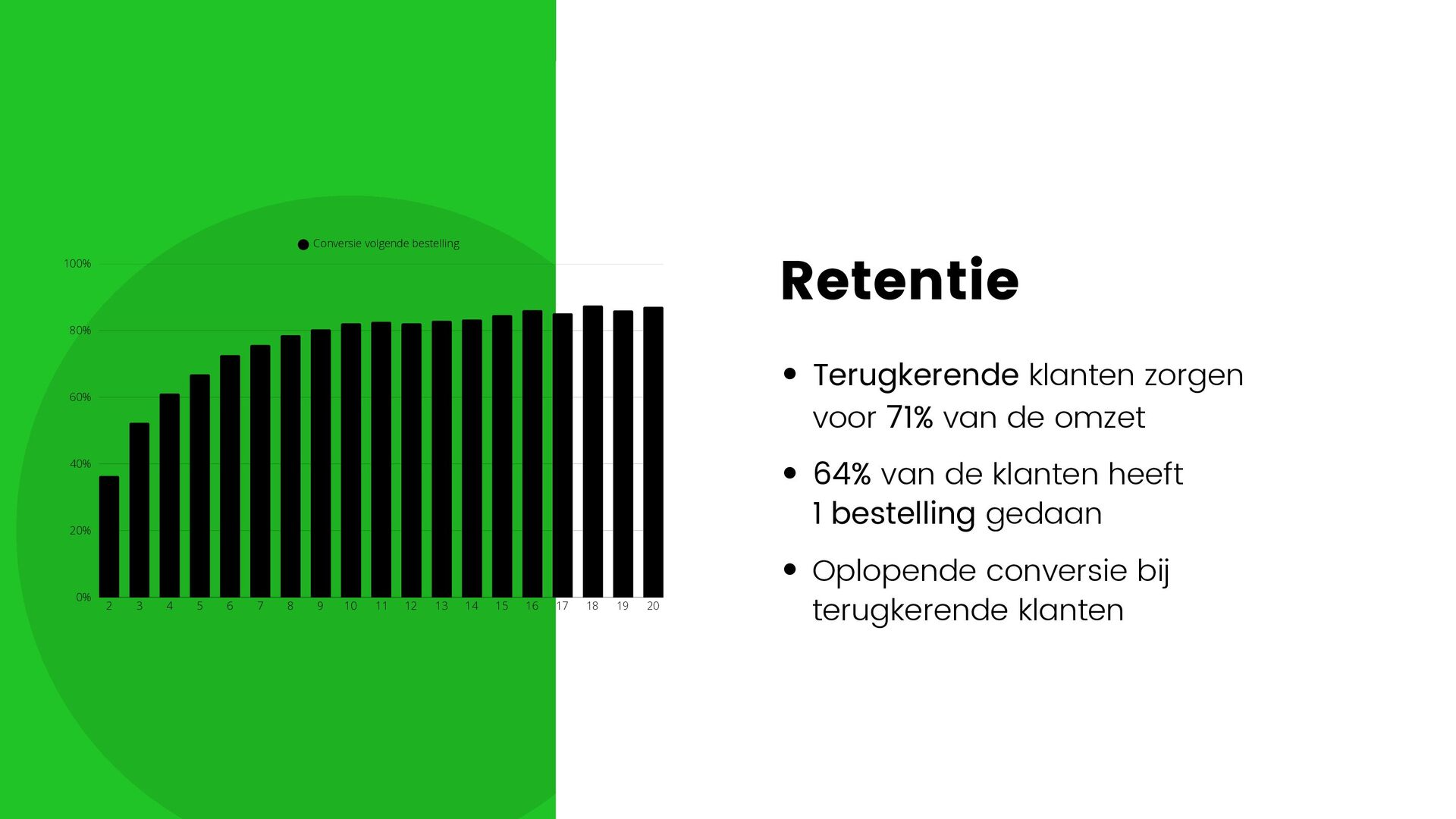 van de klanten heeft 1 bestelling gedaan Oplopende conversie bij terugkerende klanten Conversie volgende bestelling 2 3 4 5 6 7 8 9 10 11 12 13 14 15 16 17 18 19 20 0% 20% 40% 60% 80% 100%