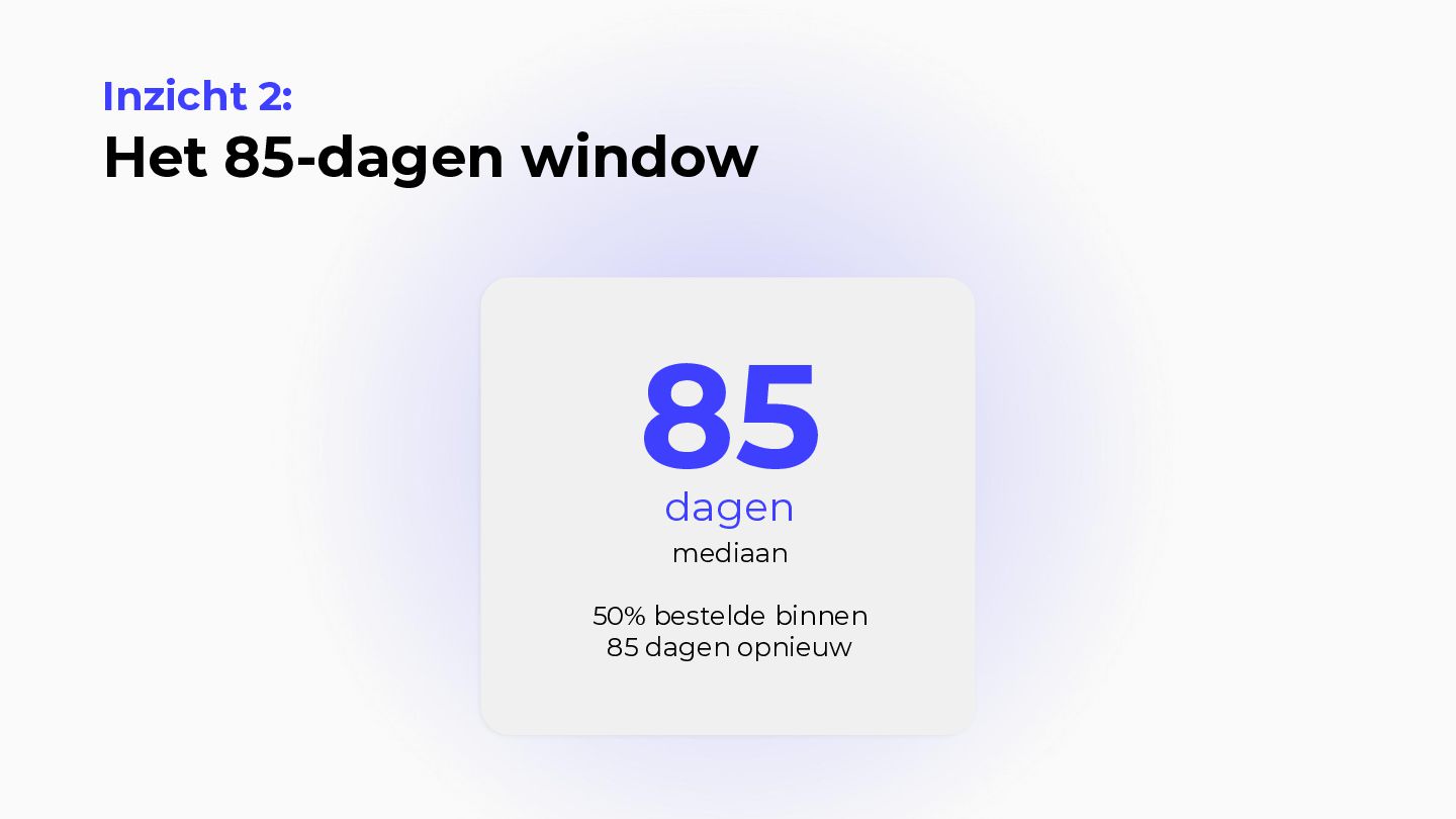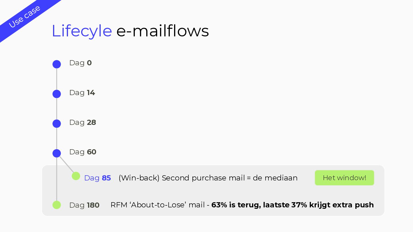 (Win-back) Second purchase mail = de mediaan Dag 85 RFM ‘About-to-Lose’ mail - 63% is terug, laatste 37% krijgt extra push Dag 180 Het window!