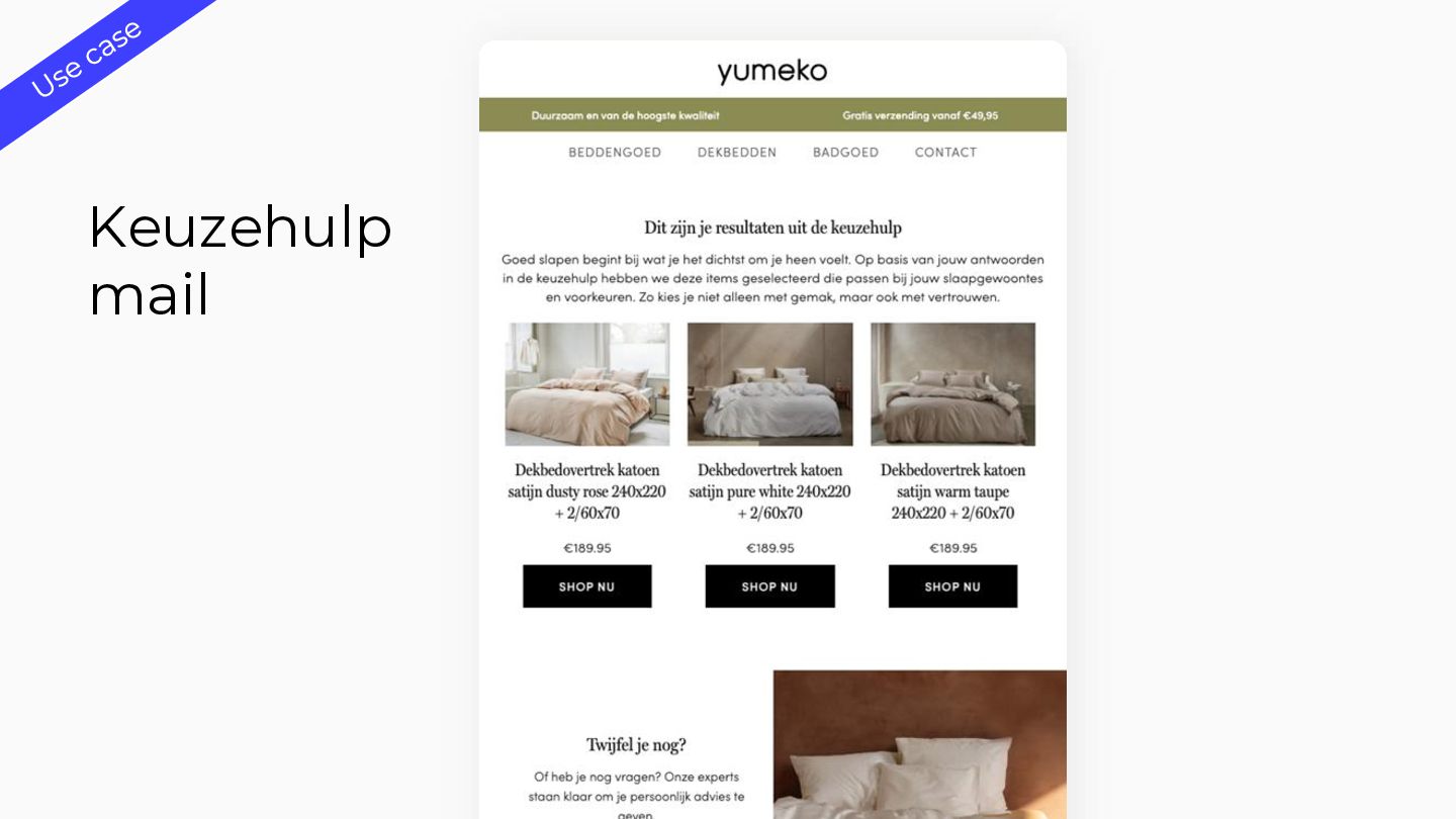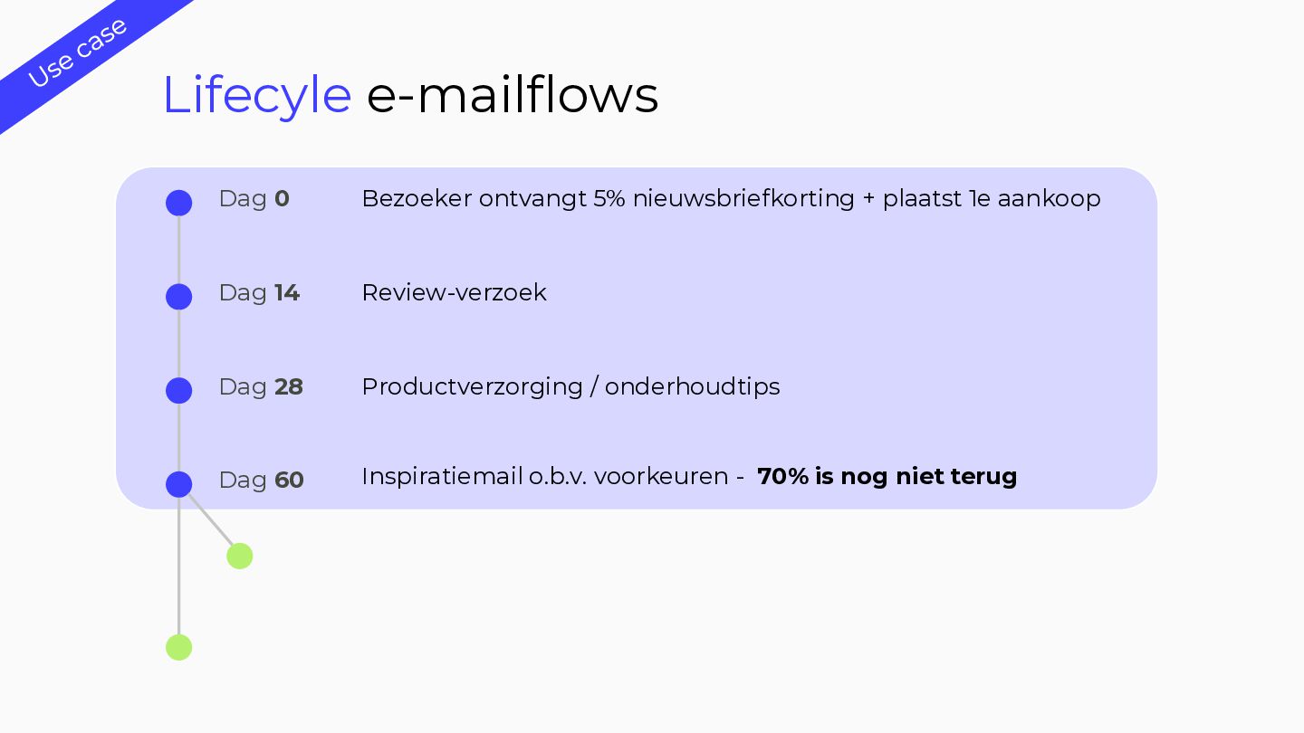 1e aankoop Dag 14 Review-verzoek Dag 28 Productverzorging / onderhoudtips Dag 60 Inspiratiemail o.b.v. voorkeuren - 70% is nog niet terug