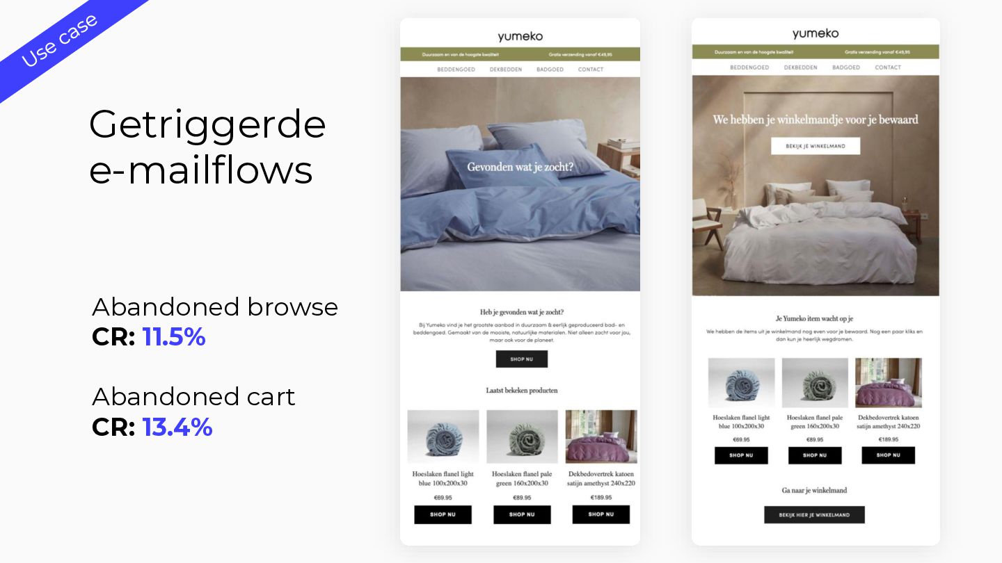 Getriggerde e-mailflows Abandoned browse CR: 11.5% Abandoned cart CR: 13.4%