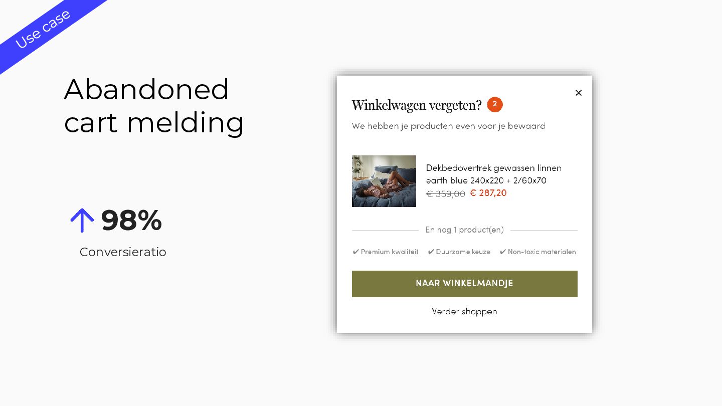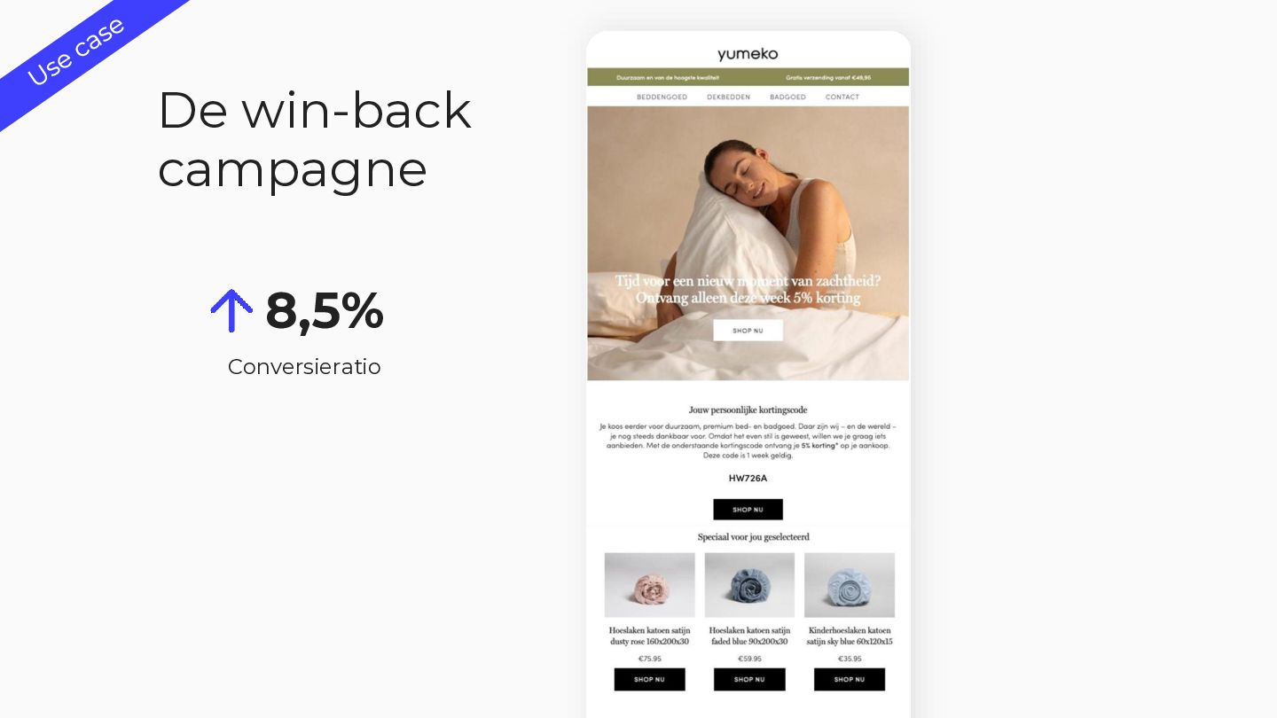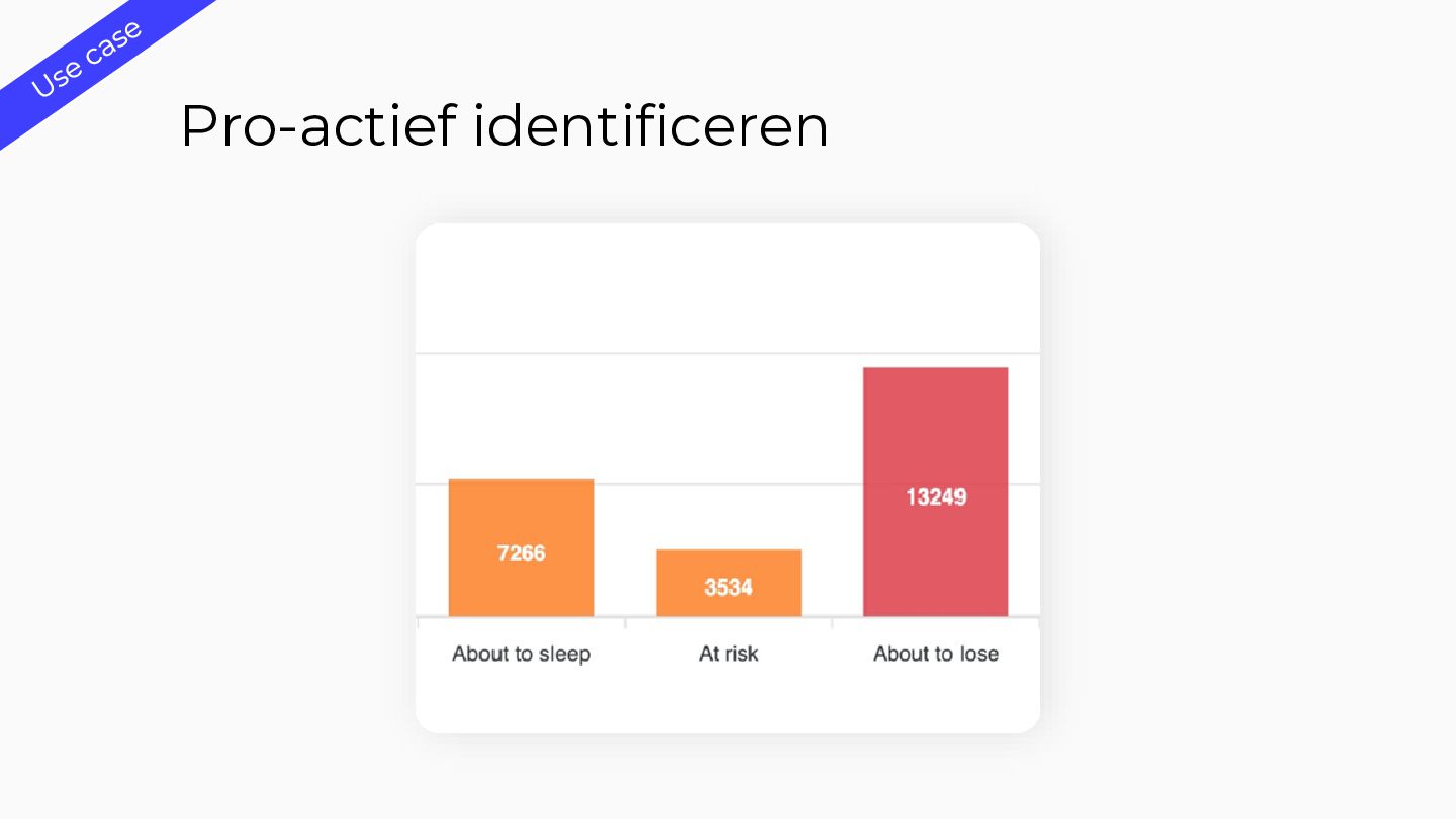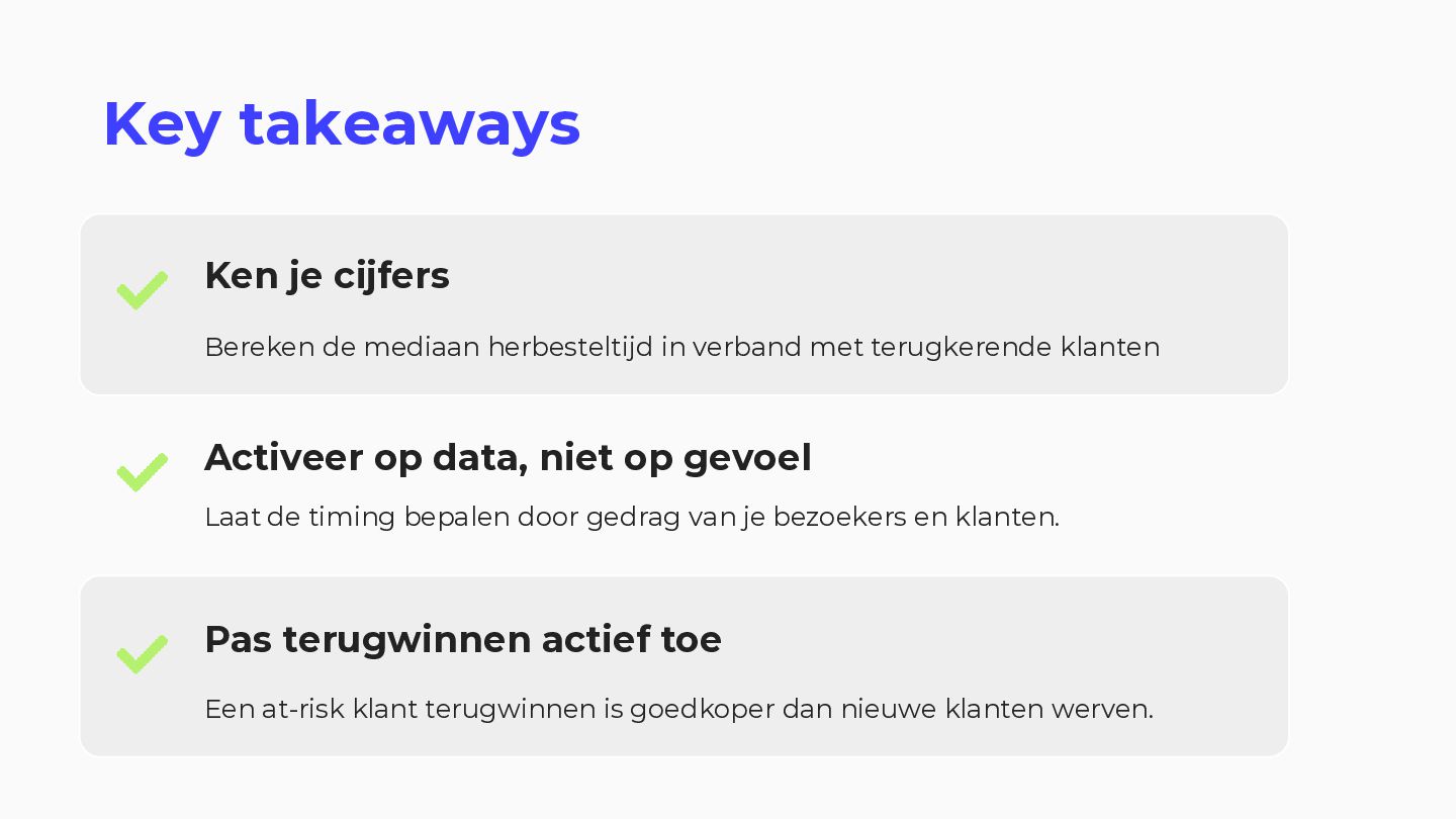 verband met terugkerende klanten Activeer op data, niet op gevoel Laat de timing bepalen door gedrag van je bezoekers en klanten. Pas terugwinnen actief toe Een at-risk klant terugwinnen is goedkoper dan nieuwe klanten werven.